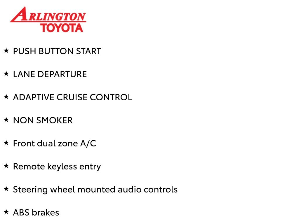 Prices do not include tax, tag, title, a pre-delivery service fee* of $894.00, an electronic registration filing fee* of $199.00 (*these charges represent costs and profits to the dealer for items such as inspecting, cleaning, and preparing documents related to the sale), and an Arlington Toyota Total Value Package of $1,889.00 (*these charges represent costs and profits to the dealer for items such as inspecting, cleaning, and preparing documents related to the sale). The final price is also subject to repair order reconditioning costs. Any price does not include dealer-installed accessories. All offers are mutually exclusive. All vehicles are subject to prior sale. See dealer for complete details.