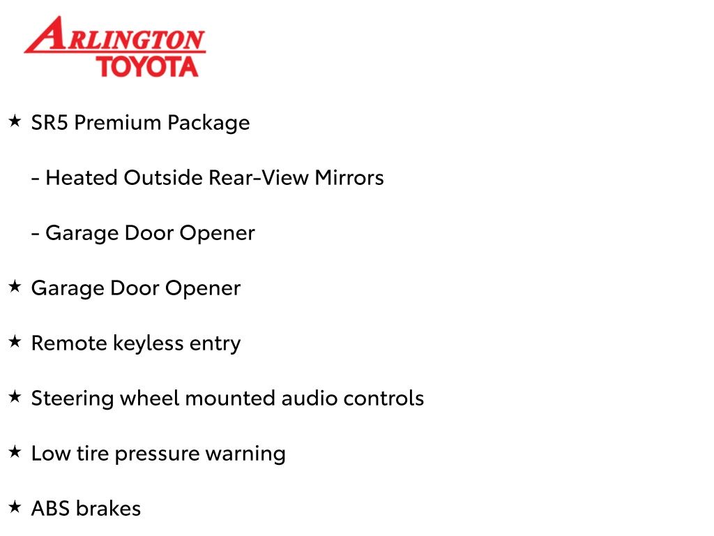 Prices do not include tax, tag, title, a pre-delivery service fee* of $894.00, an electronic registration filing fee* of $199.00 (*these charges represent costs and profits to the dealer for items such as inspecting, cleaning, and preparing documents related to the sale), and an Arlington Toyota Total Value Package of $1,889.00 (*these charges represent costs and profits to the dealer for items such as inspecting, cleaning, and preparing documents related to the sale). The final price is also subject to repair order reconditioning costs. Any price does not include dealer-installed accessories. All offers are mutually exclusive. All vehicles are subject to prior sale. See dealer for complete details.