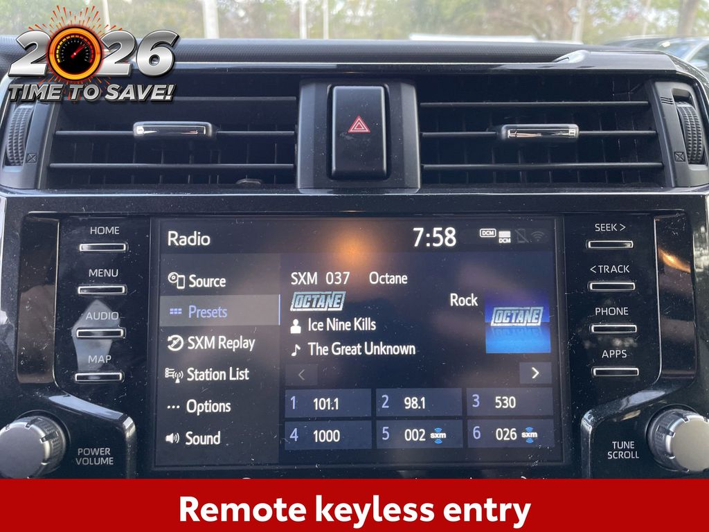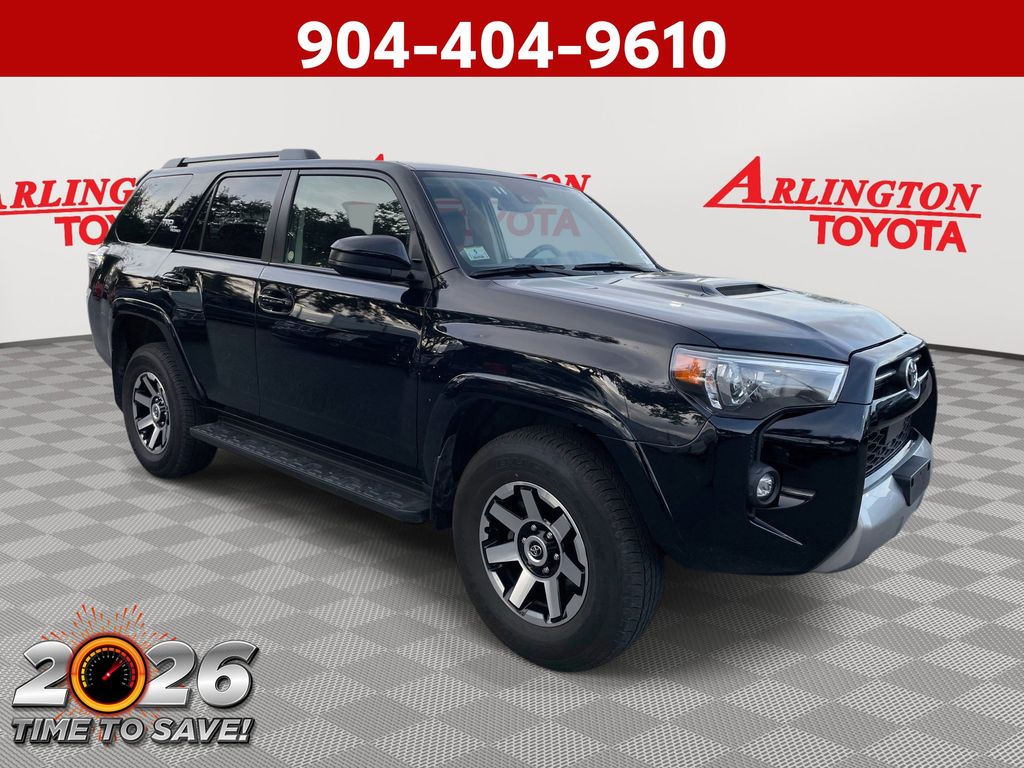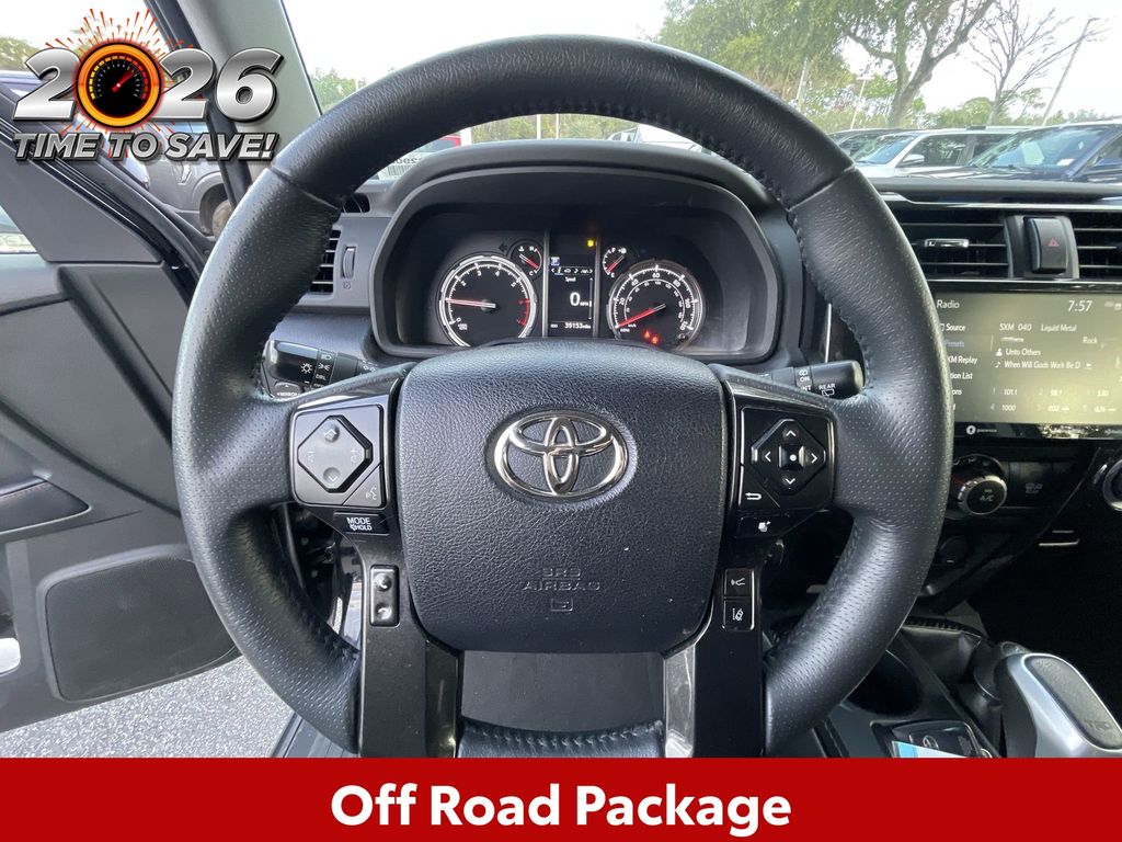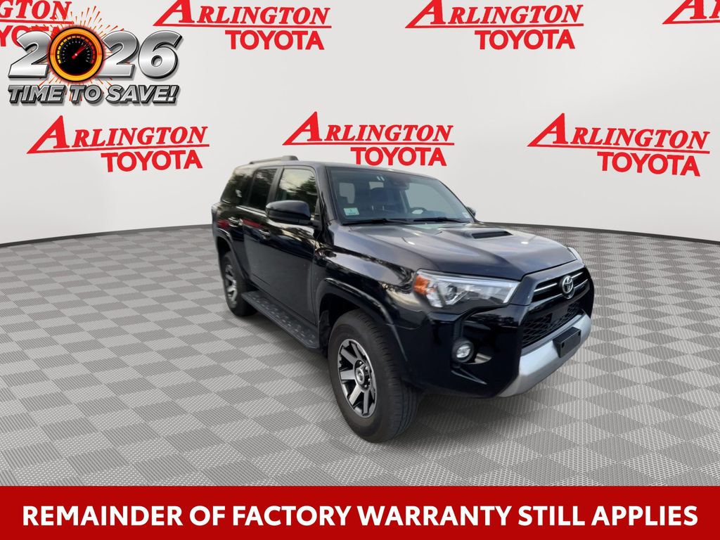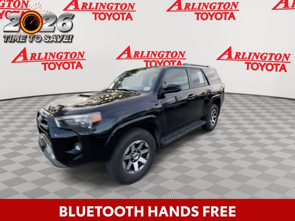 REMAINDER OF FACTORY WARRANTY STILL APPLIES, BACKUP CAMERA, BLUETOOTH HANDS FREE, ANDROID AUTO, APPLE CARPLAY, 4X4/FOUR WHEEL DRIVE, POWER SEATS, TOW PACKAGE, PUSH BUTTON START, LANE DEPARTURE, ADAPTIVE CRUISE CONTROL, NON SMOKER, 4Runner TRD Off-Road 4X4, 4D Sport Utility, 4.0L V6 DOHC 24V, 5-Speed with ECT, 4WD, Midnight Black Metallic, Graphite Cloth, ABS brakes, Black Roof Rails, Electronic Stability Control, Low tire pressure warning, Off Road Package, Remote keyless entry, Steering wheel mounted audio controls, 3.727 Axle Ratio, 4-Wheel Disc Brakes, 8 Speakers, Air Conditioning, Alloy wheels, AM/FM radio: SiriusXM, Anti-whiplash front head restraints, Apple CarPlay/Android Auto, Auto High-beam Headlights, Brake assist, Bumpers: body-color, Compass, Driver door bin, Driver vanity mirror, Dual front impact airbags, Dual front side impact airbags, Exterior Parking Camera Rear, Fabric Seat Trim, Front anti-roll bar, Front Bucket Seats, Front Center Armrest, Front fog lights, Front reading lights, Front wheel independent suspension, Heated door mirrors, Illuminated entry, Knee airbag, Leather Shift Knob, Occupant sensing airbag, Outside temperature display, Overhead airbag, Overhead console, Panic alarm, Passenger door bin, Passenger vanity mirror, Power door mirrors, Power driver seat, Power steering, Power windows, Radio: Audio Plus, Rear anti-roll bar, Rear seat center armrest, Rear window defroster, Rear window wiper, Rigid Running Boards, Security system, Speed control, Speed-sensing steering, Split folding rear seat, Spoiler, Tachometer, Telescoping steering wheel, Tilt steering wheel, Traction control, Trip computer, Variably intermittent wipers, Wheels: 17" Unique 7-Spoke Off-Road Alloy, 4Runner TRD Off-Road 4X4, 4D Sport Utility, 4.0L V6 DOHC 24V, 5-Speed with ECT, 4WD, Midnight Black Metallic, Graphite Cloth, ABS brakes, Black Roof Rails, Electronic Stability Control, Low tire pressure warning, Off Road Package, Remote keyless entry, Steering wheel mounted audio controls.
