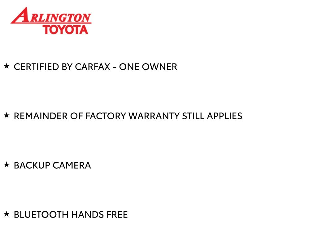 Prices do not include tax, tag, title, a pre-delivery service fee* of $894.00, an electronic registration filing fee* of $199.00 (*these charges represent costs and profits to the dealer for items such as inspecting, cleaning, and preparing documents related to the sale), and an Arlington Toyota Total Value Package of $1,889.00 (*these charges represent costs and profits to the dealer for items such as inspecting, cleaning, and preparing documents related to the sale). The final price is also subject to repair order reconditioning costs. Any price does not include dealer-installed accessories. All offers are mutually exclusive. All vehicles are subject to prior sale. See dealer for complete details.