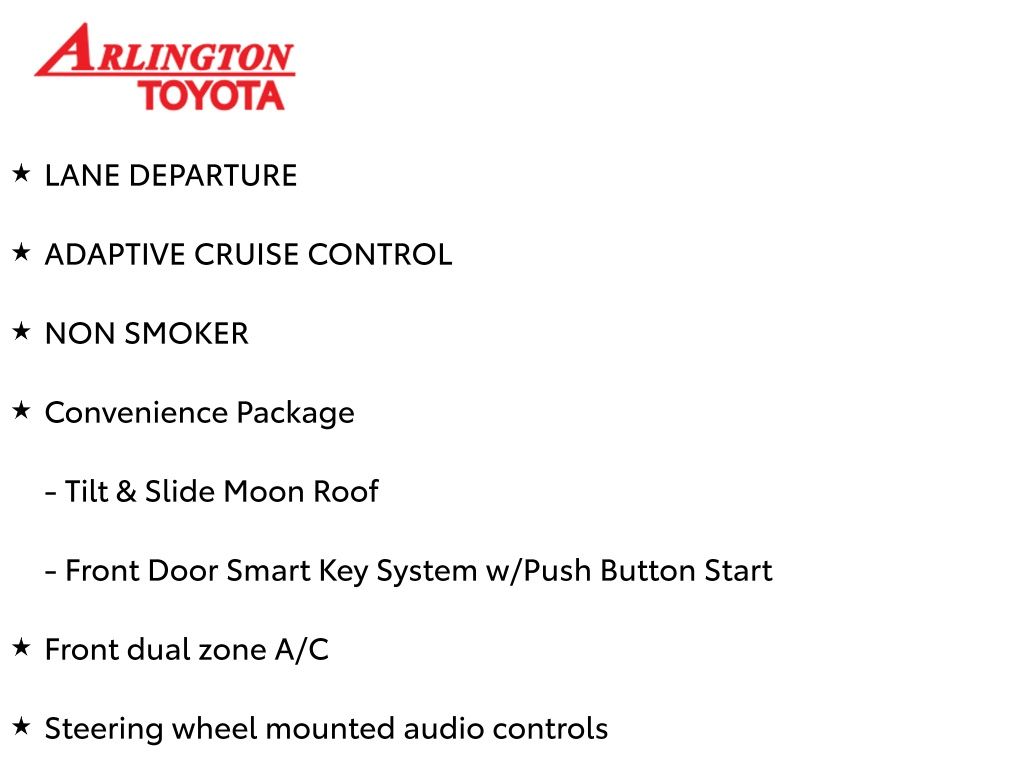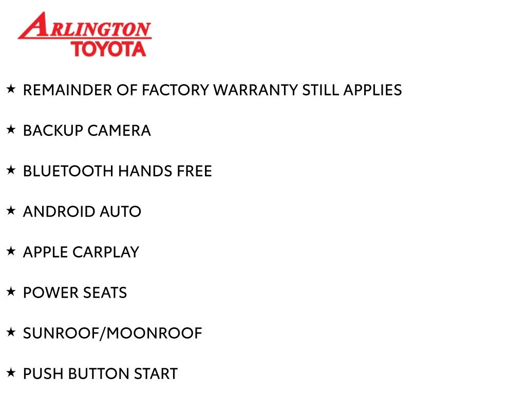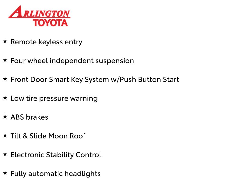 Prices do not include tax, tag, title, a pre-delivery service fee* of $894.00, an electronic registration filing fee* of $199.00 (*these charges represent costs and profits to the dealer for items such as inspecting, cleaning, and preparing documents related to the sale), and an Arlington Toyota Total Value Package of $1,889.00 (*these charges represent costs and profits to the dealer for items such as inspecting, cleaning, and preparing documents related to the sale). The final price is also subject to repair order reconditioning costs. Any price does not include dealer-installed accessories. All offers are mutually exclusive. All vehicles are subject to prior sale. See dealer for complete details.