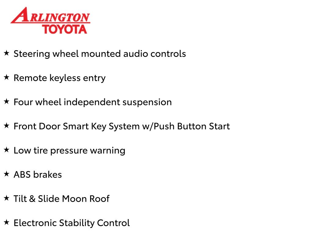 Prices do not include tax, tag, title, a pre-delivery service fee* of $894.00, an electronic registration filing fee* of $199.00 (*these charges represent costs and profits to the dealer for items such as inspecting, cleaning, and preparing documents related to the sale), and an Arlington Toyota Total Value Package of $1,889.00 (*these charges represent costs and profits to the dealer for items such as inspecting, cleaning, and preparing documents related to the sale). The final price is also subject to repair order reconditioning costs. Any price does not include dealer-installed accessories. All offers are mutually exclusive. All vehicles are subject to prior sale. See dealer for complete details.