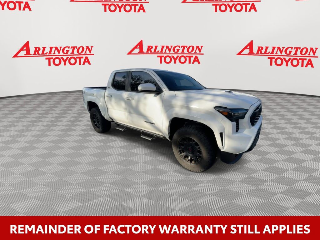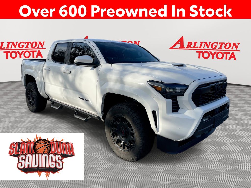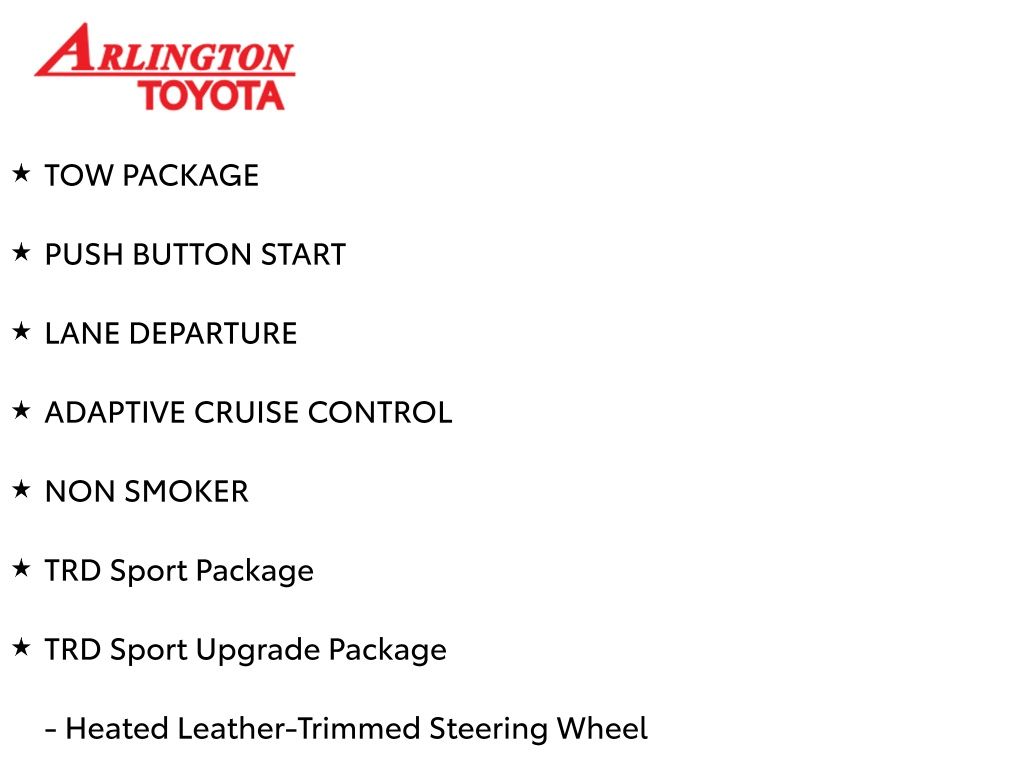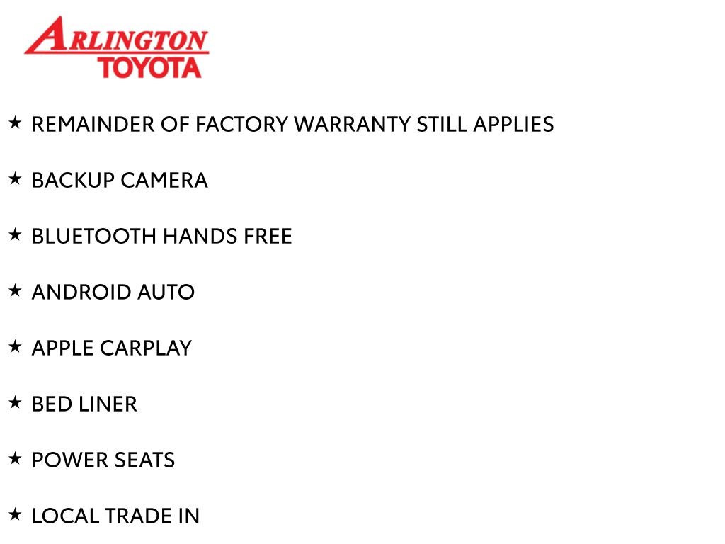 REMAINDER OF FACTORY WARRANTY STILL APPLIES, BACKUP CAMERA, BLUETOOTH HANDS FREE, ANDROID AUTO, APPLE CARPLAY, BED LINER, POWER SEATS, LOCAL TRADE IN, TOW PACKAGE, PUSH BUTTON START, LANE DEPARTURE, ADAPTIVE CRUISE CONTROL, NON SMOKER, Tacoma TRD Sport, 4D Double Cab, 2.4L 4-Cylinder, 8-Speed Automatic, RWD, Ice Cap, Black w/Fabric Seat Trim, 8-Way Power Driver & Passenger Seat Adjusters, Digital Key Capability, Front & Rear Parking Assist w/Automatic Braking, Heated Front Seats, Heated Leather-Trimmed Steering Wheel, Integrated Trailer Brake Controller, JBL Premium Audio, Power Horizontal Rear Window, TRD Sport Package, TRD Sport Upgrade Package, 3.583 Axle Ratio, 4-Wheel Disc Brakes, 6 Speakers, ABS brakes, Air Conditioning, Alloy wheels, AM/FM radio: SiriusXM, Anti-whiplash front head restraints, Apple CarPlay/Android Auto, Auto High-beam Headlights, Auto-dimming Rear-View mirror, Brake assist, Bumpers: body-color, Driver door bin, Dual front impact airbags, Dual front side impact airbags, Electronic Stability Control, Emergency communication system: Safety Connect (1-year trial), Exterior Parking Camera Rear, Four wheel independent suspension, Front anti-roll bar, Front Bucket Seats, Front Center Armrest, Front fog lights, Front reading lights, Fully automatic headlights, Heated door mirrors, Illuminated entry, Knee airbag, Low tire pressure warning, Occupant sensing airbag, Outside temperature display, Overhead airbag, Overhead console, Panic alarm, Passenger door bin, Power door mirrors, Power steering, Power windows, Predator Drop Step Package (TMS), Qi-Compatible Wireless Charging, Radio: 8" Toyota Audio Multimedia, Rear step bumper, Rear window defroster, Remote keyless entry, Speed control, Speed-sensing steering, Split folding rear seat, Spray-On Bed Liner (TMS), Steering wheel mounted audio controls, Tachometer, Telescoping steering wheel, Tilt steering wheel, Traction control, Trip computer, Variably intermittent wipers, Wheels: 18" (TMS) (PPO), Tacoma TRD Sport, 4D Double Cab, 2.4L 4-Cylinder, 8-Speed Automatic, RWD, Ice Cap, Black w/Fabric Seat Trim, 8-Way Power Driver & Passenger Seat Adjusters, Digital Key Capability, Front & Rear Parking Assist w/Automatic Braking, Heated Front Seats, Heated Leather-Trimmed Steering Wheel, Integrated Trailer Brake Controller, JBL Premium Audio, Power Horizontal Rear Window, TRD Sport Package, TRD Sport Upgrade Package.