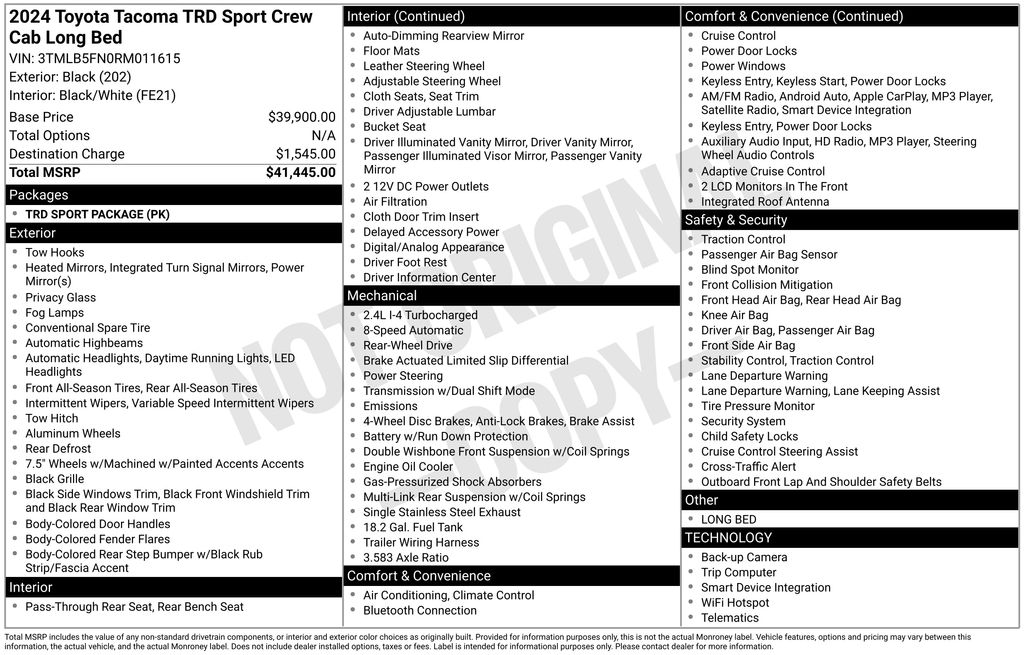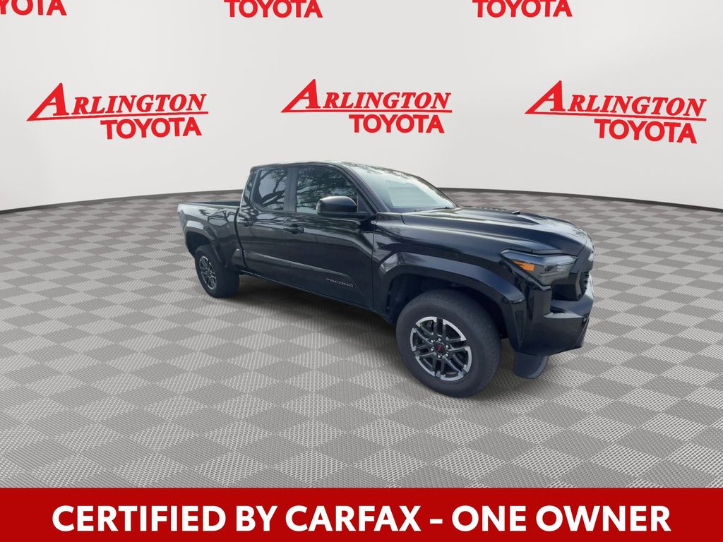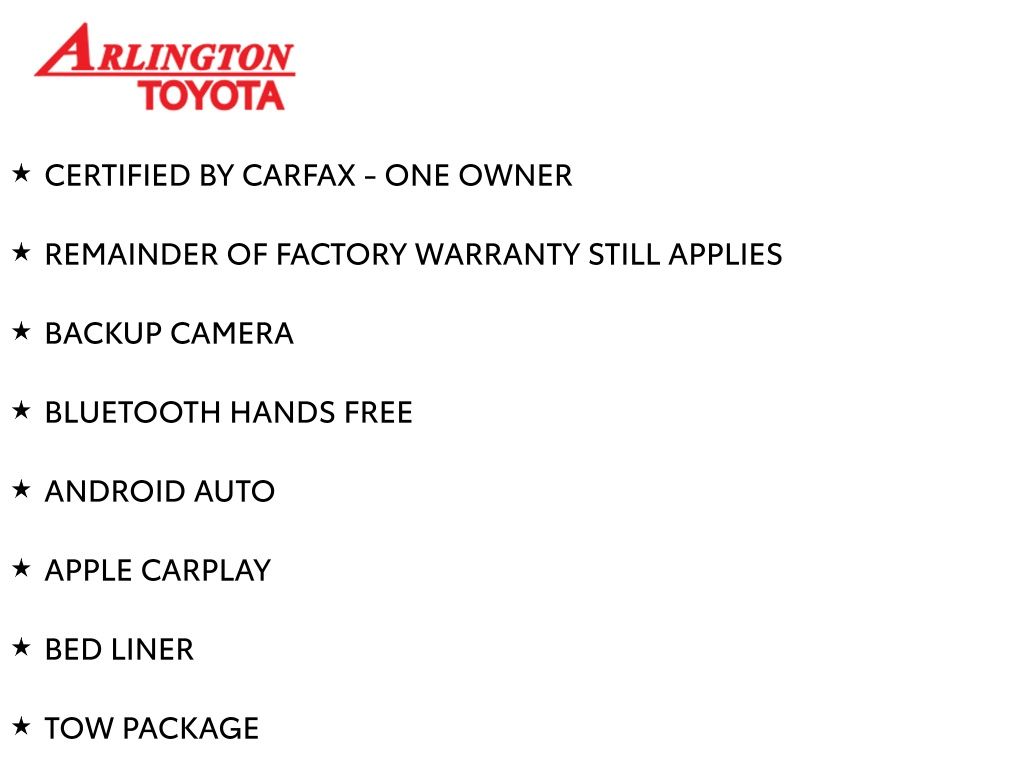 CERTIFIED BY CARFAX - ONE OWNER, REMAINDER OF FACTORY WARRANTY STILL APPLIES, BACKUP CAMERA, BLUETOOTH HANDS FREE, ANDROID AUTO, APPLE CARPLAY, BED LINER, TOW PACKAGE, PUSH BUTTON START, LANE DEPARTURE, ADAPTIVE CRUISE CONTROL, NON SMOKER, Tacoma TRD Sport, 4D Double Cab, 2.4L 4-Cylinder, 8-Speed Automatic, RWD, Black, Black/White Cloth, ABS brakes, Four wheel independent suspension, Low tire pressure warning, Steering wheel mounted audio controls, 3.583 Axle Ratio, 4-Wheel Disc Brakes, 6 Speakers, Air Conditioning, Alloy wheels, AM/FM radio: SiriusXM, Anti-whiplash front head restraints, Apple CarPlay/Android Auto, Auto High-beam Headlights, Auto-dimming Rear-View mirror, Automatic temperature control, Brake assist, Bumpers: body-color, Driver door bin, Driver vanity mirror, Dual front impact airbags, Dual front side impact airbags, Electronic Stability Control, Emergency communication system: Safety Connect (1-year trial), Exterior Parking Camera Rear, Fabric Seat Trim (FE), Front anti-roll bar, Front Bucket Seats, Front Center Armrest, Front fog lights, Front reading lights, Fully automatic headlights, Heated door mirrors, Illuminated entry, Knee airbag, Leather Shift Knob, Leather steering wheel, Occupant sensing airbag, Outside temperature display, Overhead airbag, Overhead console, Panic alarm, Passenger door bin, Passenger vanity mirror, Power door mirrors, Power steering, Power windows, Radio: 8" Toyota Audio Multimedia, Rear step bumper, Rear window defroster, Remote keyless entry, Security system, Speed control, Speed-sensing steering, Split folding rear seat, Tachometer, Telescoping steering wheel, Tilt steering wheel, Traction control, TRD Sport Package, Trip computer, Turn signal indicator mirrors, Variably intermittent wipers, Wheels: 18" TRD Sport Alloy, Tacoma TRD Sport, 4D Double Cab, 2.4L 4-Cylinder, 8-Speed Automatic, RWD, Black, Black/White Cloth, ABS brakes, Four wheel independent suspension, Low tire pressure warning, Steering wheel mounted audio controls.