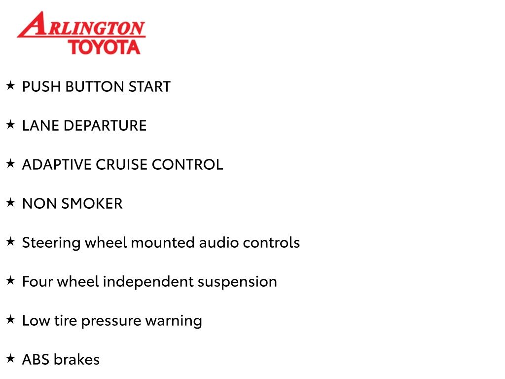 Prices do not include tax, tag, title, a pre-delivery service fee* of $894.00, an electronic registration filing fee* of $199.00 (*these charges represent costs and profits to the dealer for items such as inspecting, cleaning, and preparing documents related to the sale), and an Arlington Toyota Total Value Package of $1,889.00 (*these charges represent costs and profits to the dealer for items such as inspecting, cleaning, and preparing documents related to the sale). The final price is also subject to repair order reconditioning costs. Any price does not include dealer-installed accessories. All offers are mutually exclusive. All vehicles are subject to prior sale. See dealer for complete details.