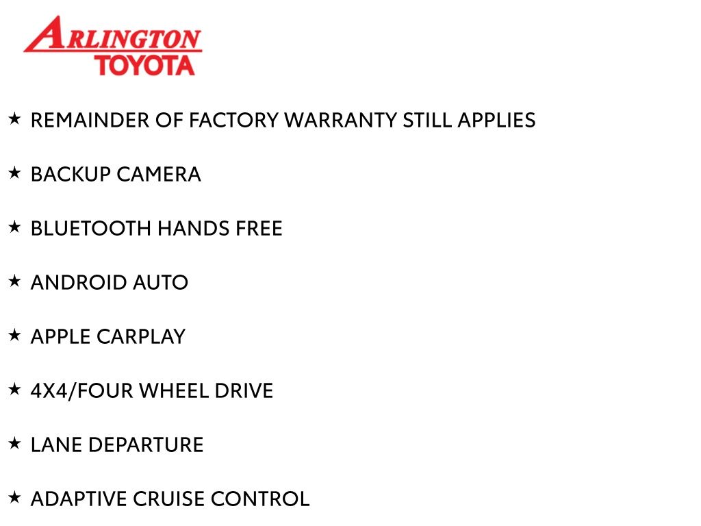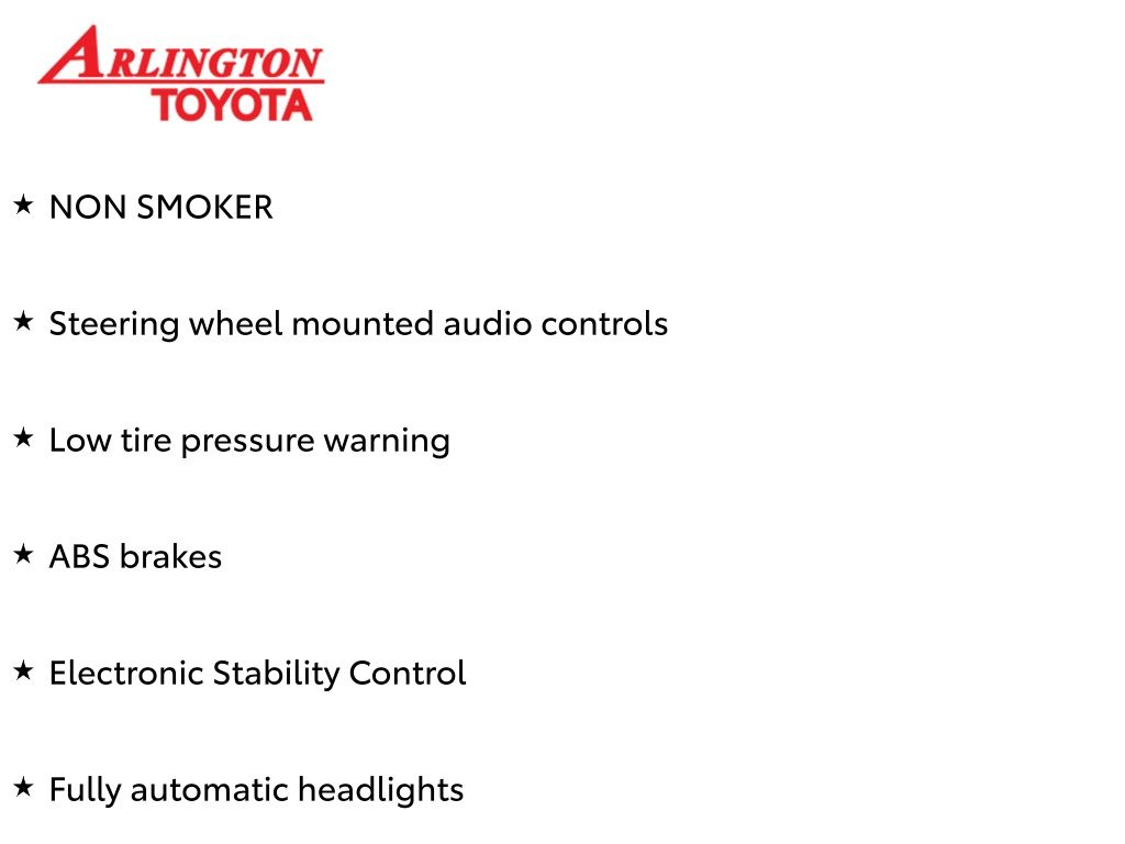 Prices do not include tax, tag, title, a pre-delivery service fee* of $894.00, an electronic registration filing fee* of $199.00 (*these charges represent costs and profits to the dealer for items such as inspecting, cleaning, and preparing documents related to the sale), and an Arlington Toyota Total Value Package of $1,889.00 (*these charges represent costs and profits to the dealer for items such as inspecting, cleaning, and preparing documents related to the sale). The final price is also subject to repair order reconditioning costs. Any price does not include dealer-installed accessories. All offers are mutually exclusive. All vehicles are subject to prior sale. See dealer for complete details.