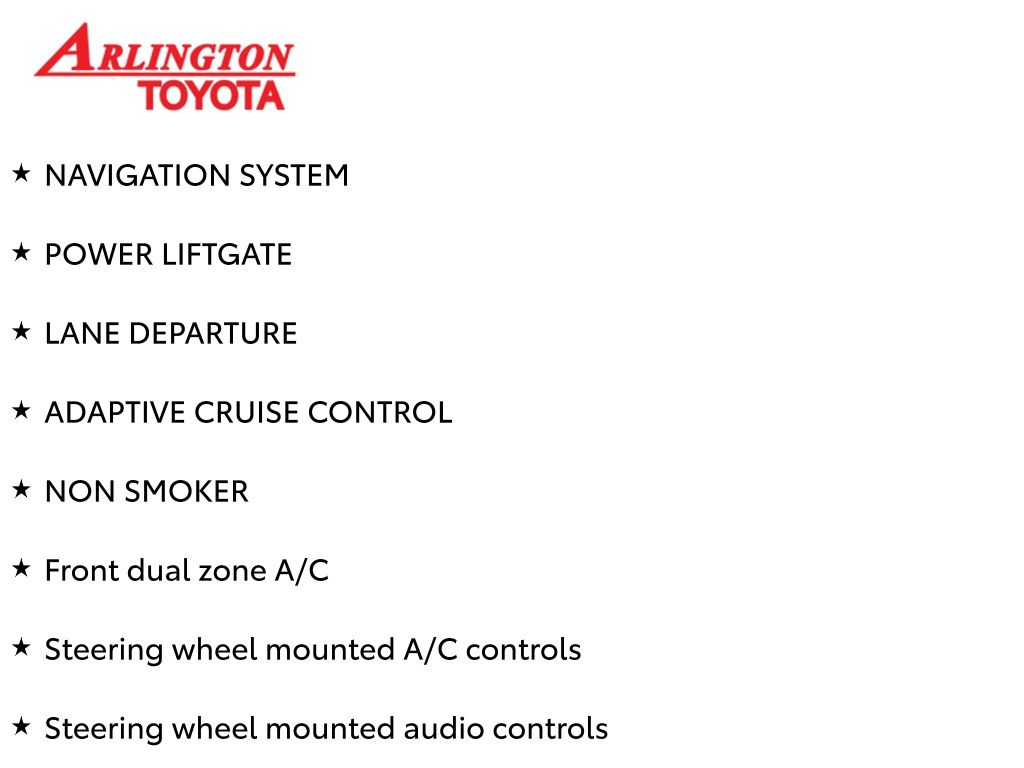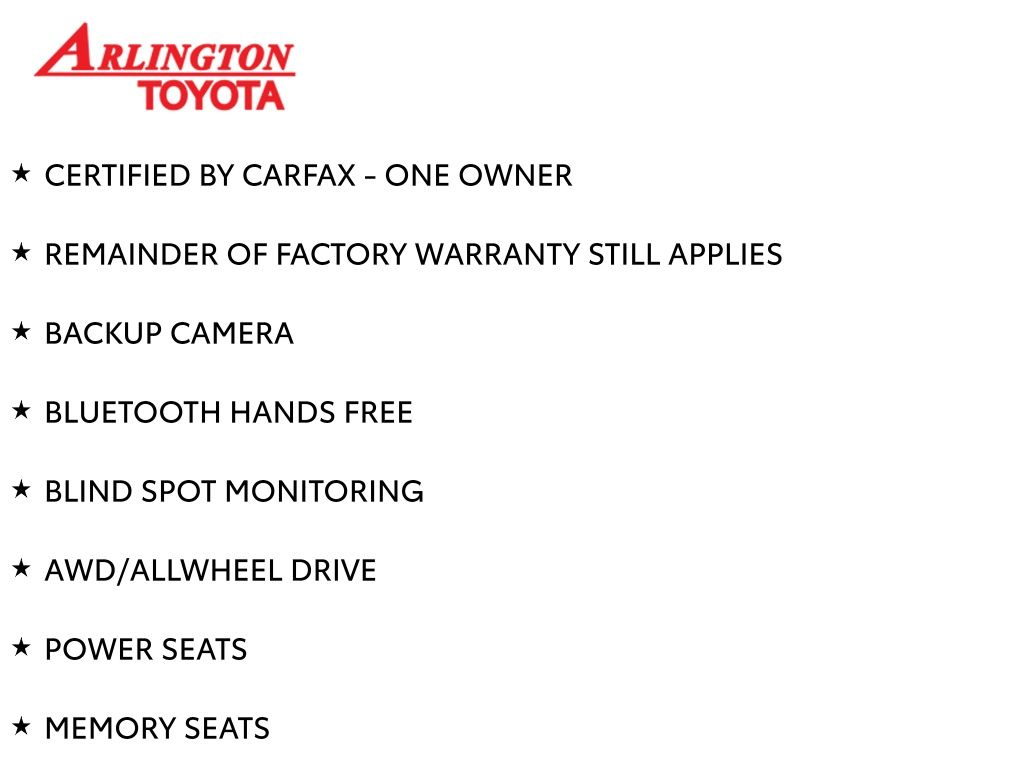 Prices do not include tax, tag, title, a pre-delivery service fee* of $894.00, an electronic registration filing fee* of $199.00 (*these charges represent costs and profits to the dealer for items such as inspecting, cleaning, and preparing documents related to the sale), and an Arlington Toyota Total Value Package of $1,889.00 (*these charges represent costs and profits to the dealer for items such as inspecting, cleaning, and preparing documents related to the sale). The final price is also subject to repair order reconditioning costs. Any price does not include dealer-installed accessories. All offers are mutually exclusive. All vehicles are subject to prior sale. See dealer for complete details.