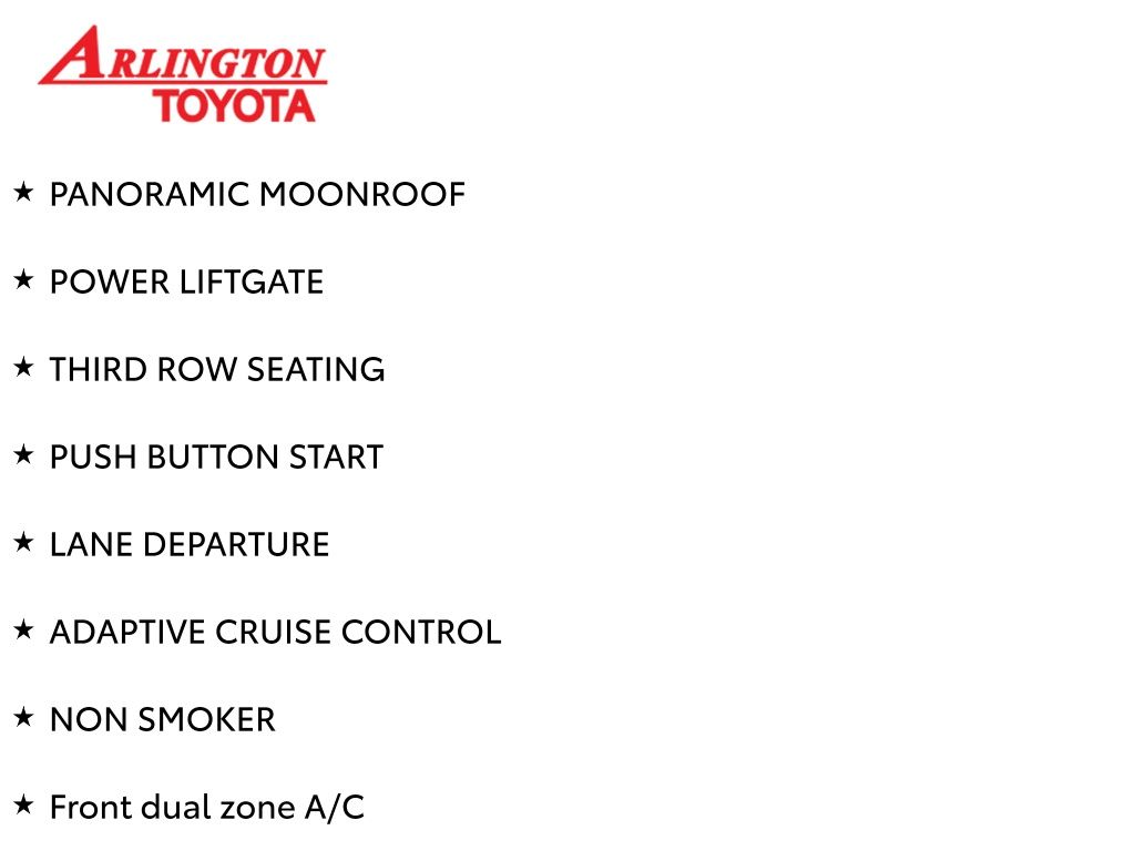 REMAINDER OF FACTORY WARRANTY STILL APPLIES, BACKUP CAMERA, BLUETOOTH HANDS FREE, ANDROID AUTO, APPLE CARPLAY, AWD/ALLWHEEL DRIVE, POWER SEATS, MEMORY SEATS, PANORAMIC MOONROOF, POWER LIFTGATE, THIRD ROW SEATING, PUSH BUTTON START, LANE DEPARTURE, ADAPTIVE CRUISE CONTROL, NON SMOKER, Grand Highlander Platinum, Toyota Gold Certified Certified, 4D Sport Utility, 2.4L 4-Cylinder, 8-Speed Automatic, AWD, Wind Chill Pearl, Black Leather, ABS brakes, Electronic Stability Control, Four wheel independent suspension, Front dual zone A/C, Fully automatic headlights, Low tire pressure warning, Remote keyless entry, Steering wheel mounted audio controls, Turn signal indicator mirrors, 11 Speakers, 3rd row seats: split-bench, 4-Wheel Disc Brakes, Air Conditioning, Alloy wheels, AM/FM radio: SiriusXM, Apple CarPlay/Android Auto, Auto High-beam Headlights, Auto-dimming Rear-View mirror, Automatic temperature control, Brake assist, Bumpers: body-color, Delay-off headlights, Driver door bin, Driver vanity mirror, Dual front impact airbags, Dual front side impact airbags, Exterior Parking Camera Rear, Front anti-roll bar, Front Bucket Seats, Front Center Armrest, Front fog lights, Front reading lights, Garage door transmitter: HomeLink, Heads-Up Display, Heated and Ventilated Front Seats, Heated door mirrors, Heated front seats, Heated rear seats, Heated steering wheel, Illuminated Cargo Sill, Illuminated entry, Knee airbag, Leather Seat Trim, Leather Shift Knob, Leather steering wheel, Memory seat, Mudguards, Navigation system: Drive Connect Cloud Navigation (1-year trial subscription), Occupant sensing airbag, Outside temperature display, Overhead airbag, Overhead console, Panic alarm, Passenger door bin, Passenger vanity mirror, Power door mirrors, Power driver seat, Power Liftgate, Power moonroof, Power passenger seat, Power steering, Power windows, Radio: 12.3" Toyota Audio Multimedia with JBL Premium Audio, Rain sensing wipers, Rear air conditioning, Rear anti-roll bar, Rear reading lights, Rear window defroster, Rear window wiper, Reclining 3rd row seat, Security system, Speed control, Speed-sensing steering, Split folding rear seat, Spoiler, Tachometer, Telescoping steering wheel, Tilt steering wheel, Tow Hitch, Traction control, Trip computer, Variably intermittent wipers, Ventilated front seats, Ventilated rear seats, Wheels: 20" Silver Multi-Spoke Alloy, Grand Highlander Platinum, 4D Sport Utility, 2.4L 4-Cylinder, 8-Speed Automatic, AWD, Wind Chill Pearl, Black Leather, ABS brakes, Electronic Stability Control, Four wheel independent suspension, Front dual zone A/C, Fully automatic headlights, Low tire pressure warning, Remote keyless entry, Steering wheel mounted audio controls, Turn signal indicator mirrors.