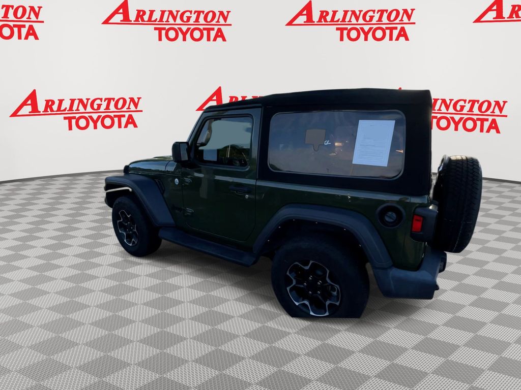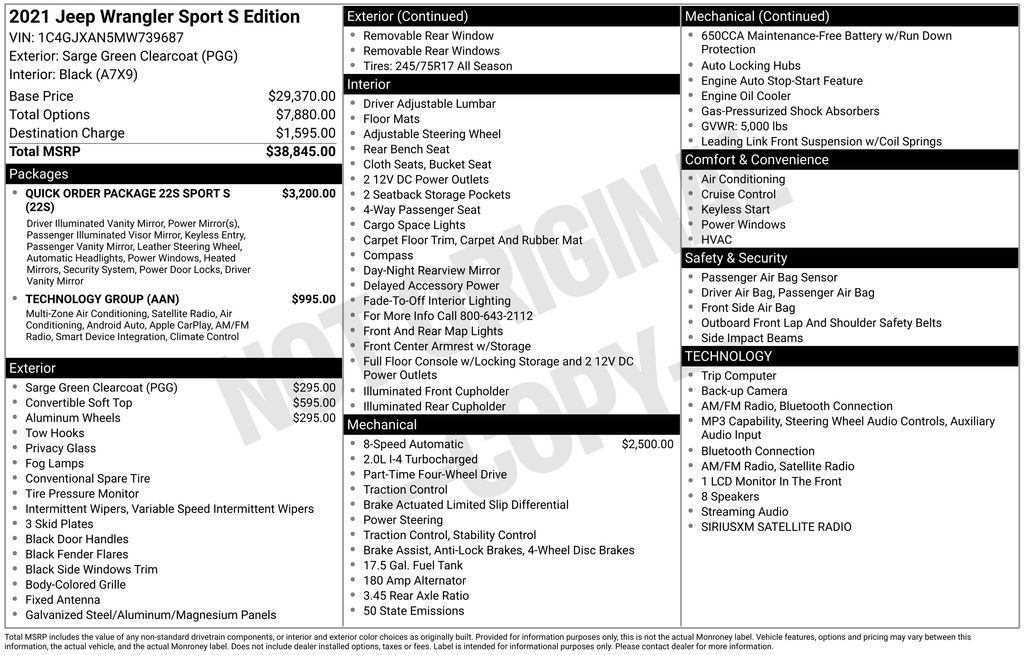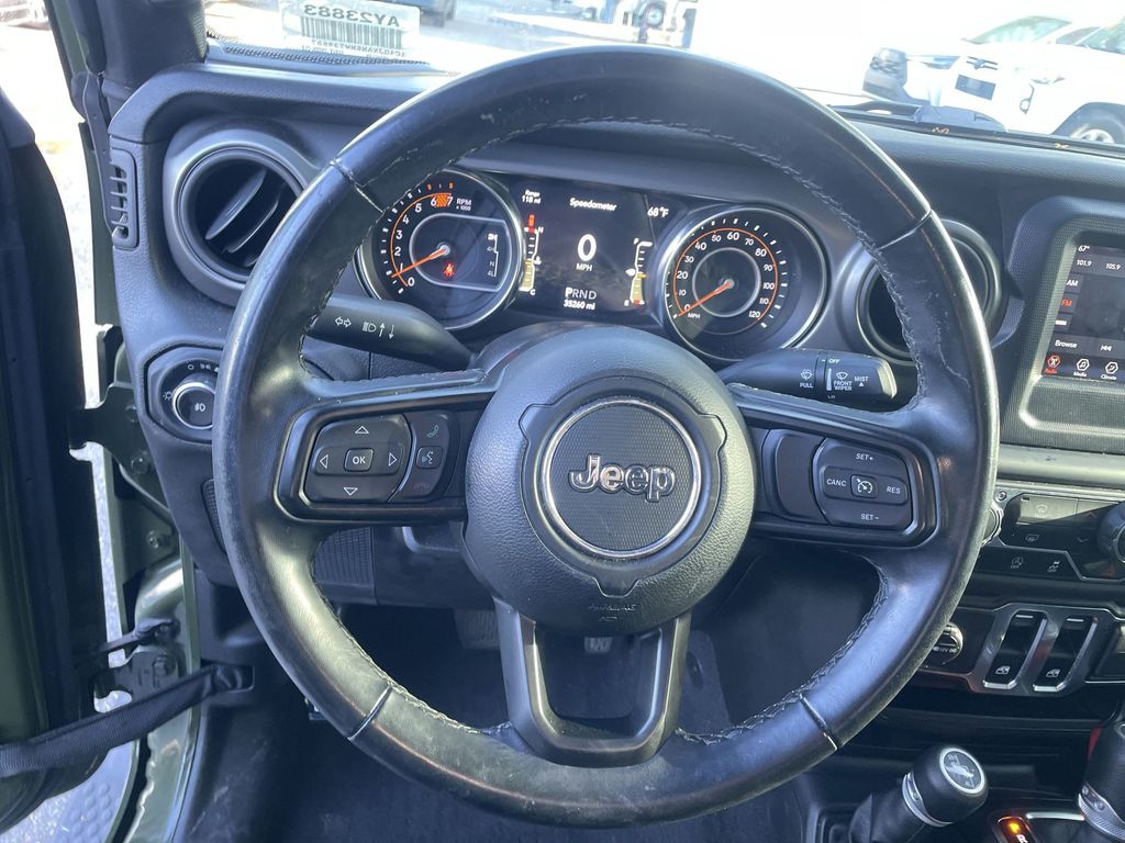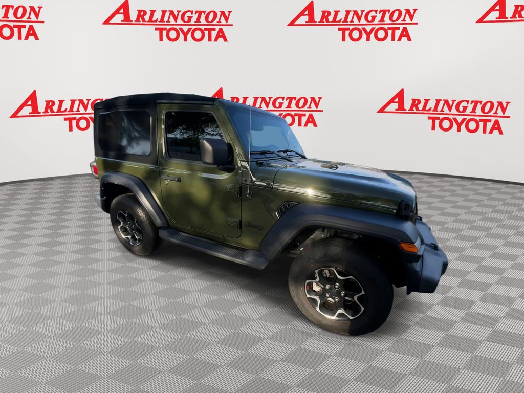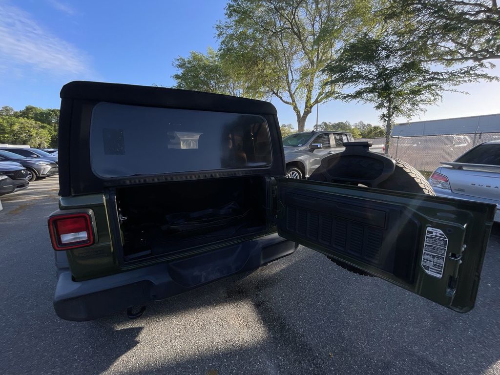 BACKUP CAMERA, BLUETOOTH HANDS FREE, 4X4/FOUR WHEEL DRIVE, CRUISE CONTROL, NON SMOKER, Wrangler Sport S 4x4, 2D Sport Utility, 2.0L I4 DOHC, 8-Speed Automatic, 4WD, Sarge Green Clearcoat, Black Cloth, 7.0" Touchscreen Display, ABS brakes, Air Conditioning w/Auto Temperature Control, Air Filtering, Apple CarPlay, Cluster 7.0" TFT Color Display, Electronic Stability Control, Google Android Auto, GPS Antenna Input, Integrated Center Stack Radio, Low tire pressure warning, Radio: Uconnect 4 w/7" Display, SiriusXM Satellite Radio, Steering wheel mounted audio controls, Technology Group, USB Host Flip, 110 mph Vehicle Max Speed Calibration, 3.45 Rear Axle Ratio, 4-Wheel Disc Brakes, 8 Speakers, Air Conditioning, AM/FM radio, Automatic Headlamps, Brake assist, Cloth Low-Back Bucket Seats, Compass, Deep Tint Sunscreen Windows, Delay-off headlights, Driver door bin, Driver vanity mirror, Dual front impact airbags, Dual front side impact airbags, For More Info Call 800-643-2112, Front 1-Touch Down Power Windows, Front anti-roll bar, Front Bucket Seats, Front Center Armrest w/Storage, Front fog lights, Front reading lights, Integrated roll-over protection, Leather Wrapped Steering Wheel, Normal Duty Suspension, Occupant sensing airbag, Outside temperature display, ParkView Rear Back-Up Camera, Passenger door bin, Passenger vanity mirror, Power Heated Mirrors, Power steering, Premium Black Sunrider Soft Top, Quick Order Package 22S Sport S, Quick Order Package 23S Sport S, R1234YF A/C Refrigerant, Radio data system, Radio: Uconnect 3 w/5" Display, Rear anti-roll bar, Rear reading lights, Remote Keyless Entry, Security Alarm, SiriusXM Radio Service, Speed control, Speed Sensitive Power Locks, Sport S, Sun Visors w/Illuminated Vanity Mirrors, Tachometer, Telescoping steering wheel, Tilt steering wheel, Traction control, Trip computer, Variably intermittent wipers, Wheels: 17" x 7.5" Black Steel Styled, Wheels: 17" x 7.5" Machined/Painted Black (DISC), Wheels: 17" x 7.5" Tech Silver Aluminum, Wrangler Sport S 4x4, 2D Sport Utility, 2.0L I4 DOHC, 8-Speed Automatic, 4WD, Sarge Green Clearcoat, Black Cloth, 7.0" Touchscreen Display, ABS brakes, Air Conditioning w/Auto Temperature Control, Air Filtering, Apple CarPlay, Cluster 7.0" TFT Color Display, Electronic Stability Control, Google Android Auto, GPS Antenna Input, Integrated Center Stack Radio, Low tire pressure warning, Radio: Uconnect 4 w/7" Display, SiriusXM Satellite Radio, Steering wheel mounted audio controls, Technology Group, USB Host Flip.