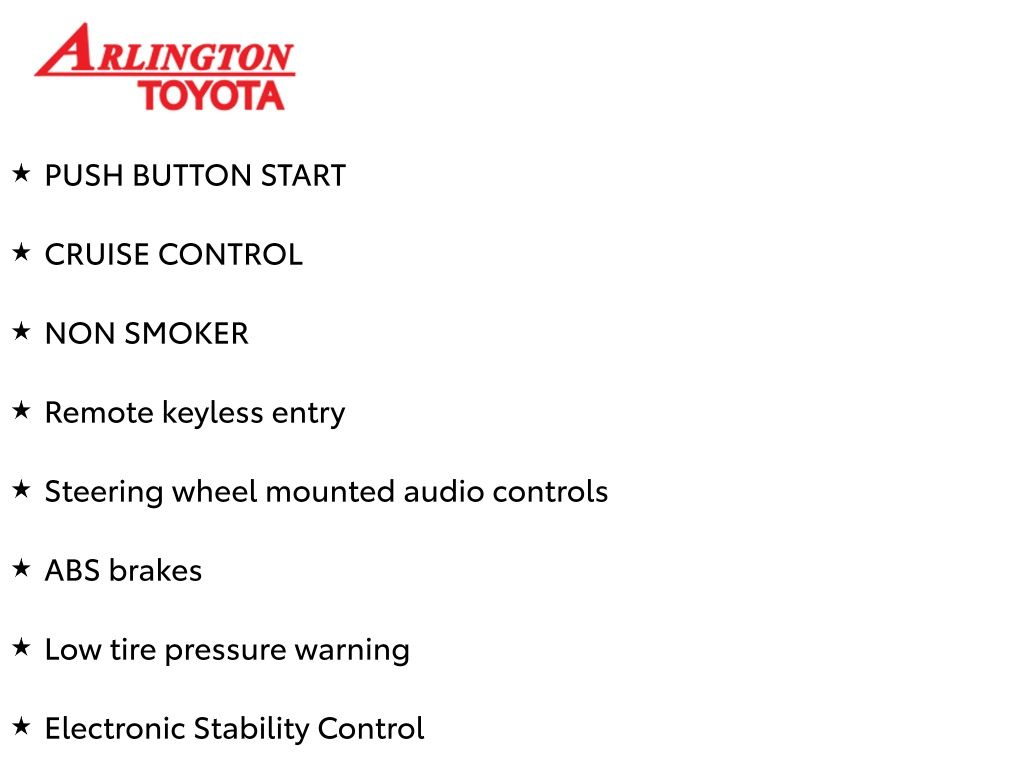 Prices do not include tax, tag, title, a pre-delivery service fee* of $894.00, an electronic registration filing fee* of $199.00 (*these charges represent costs and profits to the dealer for items such as inspecting, cleaning, and preparing documents related to the sale), and an Arlington Toyota Total Value Package of $1,889.00 (*these charges represent costs and profits to the dealer for items such as inspecting, cleaning, and preparing documents related to the sale). The final price is also subject to repair order reconditioning costs. Any price does not include dealer-installed accessories. All offers are mutually exclusive. All vehicles are subject to prior sale. See dealer for complete details.