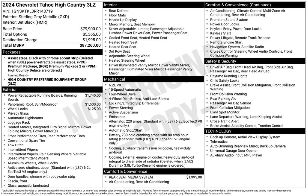 REMAINDER OF FACTORY WARRANTY STILL APPLIES, BACKUP CAMERA, BLUETOOTH HANDS FREE, ANDROID AUTO, APPLE CARPLAY, 4X4/FOUR WHEEL DRIVE, HEATED LEATHER SEATS, POWER SEATS, MEMORY SEATS, PANORAMIC MOONROOF, POWER LIFTGATE, THIRD ROW SEATING, PUSH BUTTON START, LANE DEPARTURE, ADAPTIVE CRUISE CONTROL, NON SMOKER, Tahoe High Country 4X4, 4D Sport Utility, EcoTec3 6.2L V8, 10-Speed Automatic with Overdrive, 4WD, Sterling Gray Metallic, Jet Black Leather, ABS brakes, Electronic Stability Control, Front dual zone A/C, Fully automatic headlights, Low tire pressure warning, Steering wheel memory, Steering wheel mounted audio controls, 10 Speakers, 12-Way Power Driver & Passenger Seat Adjusters, 15" Diagonal Multi-Color Head-Up Display, 1st & 2nd Row Color-Keyed Carpeted Floor Mats, 2-Speed Active Electronic AutoTrac Transfer Case, 3.23 Rear Axle Ratio, 3rd Row 60/40 Power-Folding Split-Bench Seat, 3rd row seats: split-bench, 4-Wheel Disc Brakes, Adaptive Cruise Control, Adaptive suspension, Air Conditioning, Alloy wheels, AM/FM radio: SiriusXM with 360L, Apple CarPlay/Android Auto, Auto High-beam Headlights, Auto-dimming door mirrors, Auto-dimming Rear-View mirror, Auto-leveling suspension, Automatic temperature control, Bose 10-Speaker Centerpoint Surround Audio Sys Ft, Brake assist, Bright Front & Rear Door Sill Plates, Bumpers: body-color, Chrome Door Handles w/Body-Color Strip, Color-Keyed Carpeting Floor Covering, Compass, Delay-off headlights, Driver & Front Outboard Passenger Airbags, Driver & Front Passenger Heated & Ventilated Seats, Driver door bin, Driver vanity mirror, Dual Exhaust System, Dual front impact airbags, Dual front side impact airbags, Dual-Pane Power Panoramic Sunroof, Enhanced Automatic Emergency Braking, Enhanced Driver Information Center, Exterior Parking Camera Rear, Floor Console, Four wheel independent suspension, Front anti-roll bar, Front Bucket Seats, Front Center Armrest, Front High-Back Reclining Bucket Seats, Front reading lights, Garage door transmitter, Hands-Free Rear Power Programmable Liftgate, HD Surround Vision, Heads-Up Display, Heated 2nd Row Outboard Seats, Heated door mirrors, Heated Driver & Front Passenger Seats, Heated front seats, Heated rear seats, Heated Steering Wheel, Heated steering wheel, Hill Descent Control, Illuminated entry, Infotainment Display, Inside Rearview Auto-Dimming Rear Camera Mirror, Lane Change Alert w/Side Blind Zone Alert, LED Daytime Running Lamps, Magnetic Ride Control Suspension, Memory seat, Memory Settings, Navigation System, Occupant sensing airbag, Outside Heated Power-Adjustable Mirrors, Outside temperature display, Overhead airbag, Overhead console, Panic alarm, Passenger door bin, Passenger vanity mirror, Perforated Leather Seat Trim, Power door mirrors, Power driver seat, Power Liftgate, Power passenger seat, Power Release 2nd Row Bucket Seats, Power steering, Power Tilt & Telescopic Steering Column, Power windows, Power-Retractable Assist Steps, Preferred Equipment Group 3LZ, Premium audio system: Chevrolet Infotainment 3 Premium, Radio: Chevrolet Infotainment 3 Premium System, Rain sensing wipers, Rear air conditioning, Rear anti-roll bar, Rear Camera Mirror Washer, Rear Cross Traffic Alert, Rear Pedestrian Alert, Rear reading lights, Rear Seat Media System, Rear window defroster, Rear window wiper, Remote keyless entry, Remote Start, Roof rack: xxxxxx, Safety Alert Seat, Security system, Set of 4 Wheel Locks (LPO), SiriusXM w/360L, Speed control, Speed-sensing steering, Split folding rear seat, Spoiler, Tachometer, Telescoping steering wheel, Tilt steering wheel, Traction control, Trip computer, Turn signal indicator mirrors, Universal Home Remote, Variably intermittent wipers, Ventilated front seats, Voltmeter, Wheels: 22" x 9" Sterling Silver Premium Painted, Wireless Charging, Wrapped Steering Wheel, Tahoe High Country 4X4, 4D Sport Utility, EcoTec3 6.2L V8, 10-Speed Automatic with Overdrive, 4WD, Sterling Gray Metallic, Jet Black Leather, ABS bra