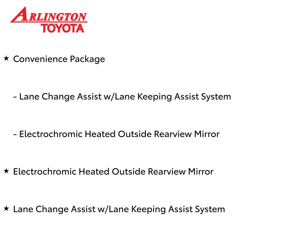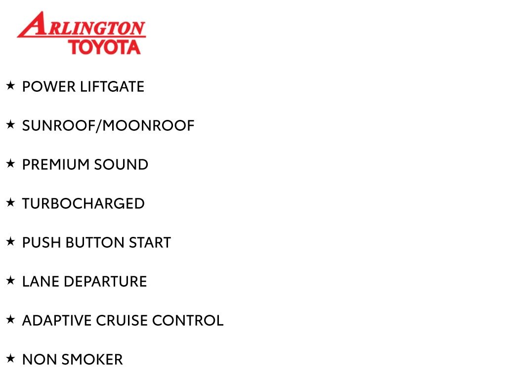 Prices do not include tax, tag, title, a pre-delivery service fee* of $894.00, an electronic registration filing fee* of $199.00 (*these charges represent costs and profits to the dealer for items such as inspecting, cleaning, and preparing documents related to the sale), and an Arlington Toyota Total Value Package of $1,889.00 (*these charges represent costs and profits to the dealer for items such as inspecting, cleaning, and preparing documents related to the sale). The final price is also subject to repair order reconditioning costs. Any price does not include dealer-installed accessories. All offers are mutually exclusive. All vehicles are subject to prior sale. See dealer for complete details.