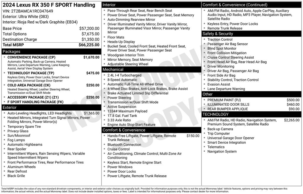 CERTIFIED BY CARFAX - ONE OWNER, REMAINDER OF FACTORY WARRANTY STILL APPLIES, BACKUP CAMERA, BLUETOOTH HANDS FREE, ANDROID AUTO, APPLE CARPLAY, AWD/ALLWHEEL DRIVE, POWER SEATS, POWER LIFTGATE, SUNROOF/MOONROOF, PREMIUM SOUND, TURBOCHARGED, PUSH BUTTON START, LANE DEPARTURE, ADAPTIVE CRUISE CONTROL, NON SMOKER, RX 350 F Sport Handling AWD, 4D Sport Utility, 2.4L I4 PDI Turbocharged DOHC 16V LEV3-SULEV30 275hp, 8-Speed Automatic, AWD, Ultra White, Rioja Red w/Dark Graphite Aluminum w/F SPORT NuLuxe Seat Trim, Convenience Package, Electrochromic Heated Outside Rearview Mirror, Lane Change Assist w/Lane Keeping Assist System, 12 Speakers, 3.33 Axle Ratio, 4-Wheel Disc Brakes, 8-Way Power Driver & Front Passenger Seat Adjusters, ABS brakes, Accessory Package (Z1), Adaptive suspension, Air Conditioning, Alloy wheels, AM/FM radio: SiriusXM, Anti-whiplash front head restraints, Auto High-beam Headlights, Auto tilt-away steering wheel, Auto-dimming door mirrors, Auto-dimming Rear-View mirror, Auto-leveling suspension, Automatic temperature control, Brake assist, Bumpers: body-color, Cargo Net, Carpet Cargo Mat, Cold Area Package, Compass, Delay-off headlights, Driver door bin, Driver vanity mirror, Dual front impact airbags, Dual front side impact airbags, Electronic Stability Control, Emergency communication system: Safety Connect (10-year trial), Exterior Parking Camera Rear, F SPORT Handling Package, F SPORT NuLuxe Seat Trim, Four wheel independent suspension, Front anti-roll bar, Front Bucket Seats, Front Center Armrest, Front dual zone A/C, Front fog lights, Front reading lights, Fully automatic headlights, Garage door transmitter: HomeLink, Genuine wood console insert, Heads-Up Display, Heated & Ventilated Front Bucket Seats, Heated door mirrors, Heated front seats, Illuminated Door Sills, Illuminated entry, Key Gloves, Leather Shift Knob, Leather steering wheel, Low tire pressure warning, Memory seat, Navigation System, Occupant sensing airbag, Outside temperature display, Overhead airbag, Overhead console, Panic alarm, Passenger door bin, Passenger vanity mirror, Power door mirrors, Power driver seat, Power Liftgate, Power moonroof, Power passenger seat, Power Rear Door w/Kick Sensor, Power steering, Power windows, Premium Triple-Beam LED Headlamps, Radio data system, Radio: Lexus Interface w/14" HD Touchscreen Display, Radio: Lexus Interface w/9.8" HD Touchscreen Display, Radio: Lexus Interface w/Mark Levinson Audio, Rain sensing wipers, Rear air conditioning, Rear anti-roll bar, Rear Bumper Applique, Rear reading lights, Rear seat center armrest, Rear side impact airbag, Rear window defroster, Rear window wiper, Remote keyless entry, Security system, Speed control, Speed-sensing steering, Split folding rear seat, Spoiler, Sport steering wheel, Steering wheel memory, Steering wheel mounted audio controls, Tachometer, Technology Package, Telescoping steering wheel, Tilt steering wheel, Traction control, Trip computer, Turn signal indicator mirrors, Variably intermittent wipers, Ventilated front seats, Wheels: 21", Wireless Apple CarPlay/Wireless Android Auto, RX 350 F Sport Handling AWD, 4D Sport Utility, 2.4L I4 PDI Turbocharged DOHC 16V LEV3-SULEV30 275hp, 8-Speed Automatic, AWD, Ultra White, Rioja Red w/Dark Graphite Aluminum w/F SPORT NuLuxe Seat Trim, Convenience Package, Electrochromic Heated Outside Rearview Mirror, Lane Change Assist w/Lane Keeping Assist System.