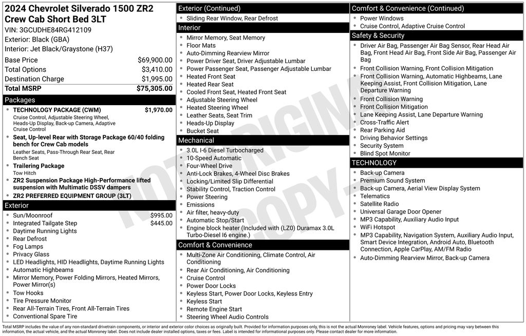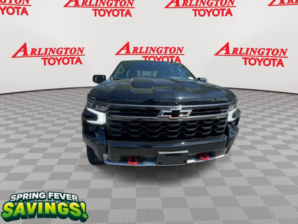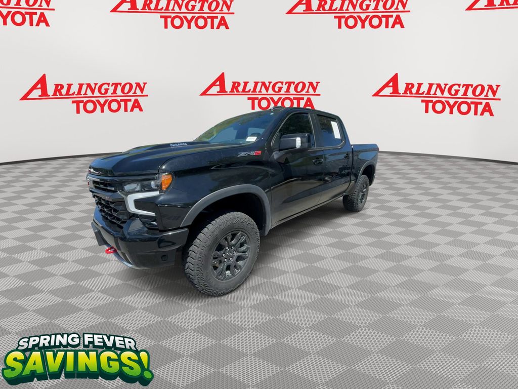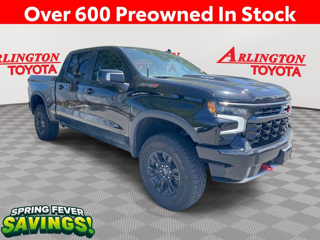 CERTIFIED BY CARFAX - ONE OWNER, REMAINDER OF FACTORY WARRANTY STILL APPLIES, BACKUP CAMERA, BLUETOOTH HANDS FREE, ANDROID AUTO, APPLE CARPLAY, 4X4/FOUR WHEEL DRIVE, POWER SEATS, MEMORY SEATS, SUNROOF/MOONROOF, PUSH BUTTON START, CRUISE CONTROL, NON SMOKER, Silverado 1500 ZR2 4X4, 4D Crew Cab, 3.0L I6, 10-Speed Automatic, 4WD, Black, Jet Black/Graystone Leather, ABS brakes, Front dual zone A/C, Fully automatic headlights, Low tire pressure warning, Remote Vehicle Starter System, Steering wheel mounted audio controls, 10-Way Power Driver Seat w/Lumbar, 10-Way Power Passenger Seat Adjuster w/Lumbar, 12.3" Multicolor Reconfigurable Digital Display, 120-Volt Bed Mounted Power Outlet, 120-Volt Interior Power Outlet, 15" Diagonal Multicolor Head-Up Display, 2 USB Data Ports, 220 Amp Alternator, 2nd Row Heated Outboard Seats, 3.23 Rear Axle Ratio, 4-Wheel Disc Brakes, 7 Speakers, 850 Cold-Cranking Amps Heavy-Duty Battery, Adaptive Cruise Control, Air Conditioning, All-Weather Floor Liner (LPO), Alloy wheels, AM/FM radio: SiriusXM with 360L, Auto High-beam Headlights, Auto-dimming door mirrors, Auto-Dimming Inside Rear-View Mirror, Auto-dimming Rear-View mirror, Automatic Emergency Braking, Automatic temperature control, Bed View Camera, Block heater, Bluetooth® For Phone, Brake assist, Chevrolet Connected Access Capable, Chevytec Spray-On Black Bedliner, Color-Keyed Carpeting Floor Covering, Compass, Deep-Tinted Glass, Delay-off headlights, Driver door bin, Driver Memory, Driver vanity mirror, Dual Exhaust, Dual front impact airbags, Dual front side impact airbags, Dual Rear USB Ports (Charge Only), Electric Rear-Window Defogger, Electrical Steering Column Lock, Electronic Cruise Control, Electronic Stability Control, Electronic Transmission Range Selector Shifter, Engine Block Heater, EZ Lift Power Lock & Release Tailgate, Floor Mounted Center Console, Following Distance Indicator, Forward Collision Alert, Front anti-roll bar, Front Bucket Seats, Front Center Armrest, Front fog lights, Front LED Fog Lamps, Front License Plate Kit, Front Pedestrian Braking, Front Rain-Sensing Wipers, Front reading lights, Garage door transmitter, HD Surround Vision, Heated door mirrors, Heated Driver & Front Outboard Passenger Seats, Heated front seats, Heated rear seats, Heated Steering Wheel, Heated steering wheel, Heavy-Duty Air Filter, High Gloss Black Mirror Caps, Hill Descent Control, Hitch Guidance, Hitch Guidance w/Hitch View, Illuminated entry, In-Vehicle Trailering System App, Integrated Trailer Brake Controller, IntelliBeam Automatic High Beam On/Off, Keyless Open & Start, Lane Keep Assist w/Lane Departure Warning, LED Cargo Area Lighting, Manual Tilt/Telescoping Steering Column, Memory seat, Multi-Flex Tailgate, Occupant sensing airbag, OnStar & Chevrolet Connected Services Capable, Outside Heated Power-Adjustable Mirrors, Outside temperature display, Overhead airbag, Overhead console, Panic alarm, Passenger door bin, Passenger vanity mirror, Perforated Leather Seat Trim, Performance Red Recovery Hooks, Perimeter Lighting, Power door mirrors, Power driver seat, Power Front Passenger Windows w/Express Up/Down, Power Front Windows w/Driver Express Up/Down, Power passenger seat, Power Rear Windows w/Express Down, Power Sliding Rear Window w/Rear Defogger, Power steering, Power Sunroof, Power Tilt & Telescoping Steering Column, Power windows, Preferred Equipment Group 3LT, Premium audio system: Chevrolet Infotainment 3 Premium, Premium Bose 7-Speaker Sound System, Radio data system, Radio: Chevrolet Infotainment 3 Premium System, Rain sensing wipers, Rear Camera Mirror, Rear Cross Traffic Braking, Rear Park Assist, Rear Pedestrian Alert, Rear reading lights, Rear seat center armrest, Rear step bumper, Rear Wheelhouse Liners, Rear window defroster, Remote keyless entry, Safety Alert Seat, Security system, SiriusXM w/360L, Speed control, Speed-sensing steering, Split fold