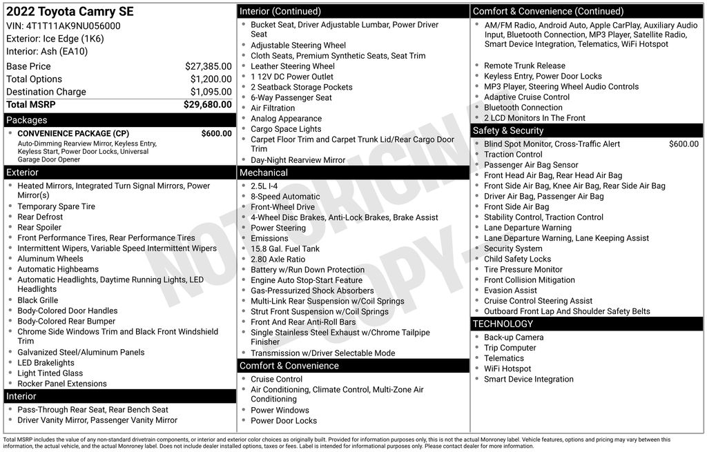 BACKUP CAMERA, BLUETOOTH HANDS FREE, BLIND SPOT MONITORING, ANDROID AUTO, APPLE CARPLAY, POWER SEATS, PUSH BUTTON START, LANE DEPARTURE, ADAPTIVE CRUISE CONTROL, NON SMOKER, Camry SE, 4D Sedan, 2.5L I4 DOHC 16V, 8-Speed Automatic, FWD, White, Ash w/Fabric Seat Trim w/Sport SofTex, ABS brakes, Auto-Dimming Rear-View Mirror, Convenience Package, Four wheel independent suspension, Front dual zone A/C, Fully automatic headlights, HomeLink, Low tire pressure warning, Remote keyless entry, Smart Key System w/Push Button Start, Steering wheel mounted audio controls, 4-Wheel Disc Brakes, 6 Speakers, Air Conditioning, Alloy wheels, AM/FM radio: SiriusXM, Apple CarPlay/Android Auto, Auto High-beam Headlights, Automatic temperature control, Blind Spot Monitor w/Rear Cross Traffic Alert, Brake assist, Bumpers: body-color, Delay-off headlights, Driver door bin, Driver vanity mirror, Dual front impact airbags, Dual front side impact airbags, Electronic Stability Control, Exterior Parking Camera Rear, Fabric Seat Trim w/Sport SofTex, Front anti-roll bar, Front Bucket Seats, Front Center Armrest, Front reading lights, Heated door mirrors, Illuminated entry, Knee airbag, Occupant sensing airbag, Outside temperature display, Overhead airbag, Overhead console, Panic alarm, Passenger door bin, Passenger vanity mirror, Power door mirrors, Power driver seat, Power steering, Power windows, Radio data system, Radio: AM/FM Audio System, Rear anti-roll bar, Rear seat center armrest, Rear side impact airbag, Rear window defroster, Security system, Speed control, Speed-sensing steering, Split folding rear seat, Spoiler, Tachometer, Telescoping steering wheel, Tilt steering wheel, Traction control, Trip computer, Turn signal indicator mirrors, Variably intermittent wipers, Wheels: 8.0J x 18" Black Machined-Finish Alloy, Camry SE, 4D Sedan, 2.5L I4 DOHC 16V, 8-Speed Automatic, FWD, White, Ash w/Fabric Seat Trim w/Sport SofTex, ABS brakes, Auto-Dimming Rear-View Mirror, Convenience Package, Four wheel independent suspension, Front dual zone A/C, Fully automatic headlights, HomeLink, Low tire pressure warning, Remote keyless entry, Smart Key System w/Push Button Start, Steering wheel mounted audio controls.