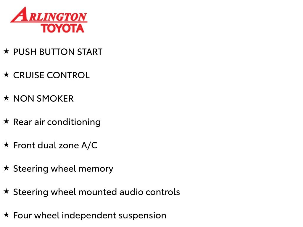 Prices do not include tax, tag, title, a pre-delivery service fee* of $894.00, an electronic registration filing fee* of $199.00 (*these charges represent costs and profits to the dealer for items such as inspecting, cleaning, and preparing documents related to the sale), and an Arlington Toyota Total Value Package of $1,889.00 (*these charges represent costs and profits to the dealer for items such as inspecting, cleaning, and preparing documents related to the sale). The final price is also subject to repair order reconditioning costs. Any price does not include dealer-installed accessories. All offers are mutually exclusive. All vehicles are subject to prior sale. See dealer for complete details.