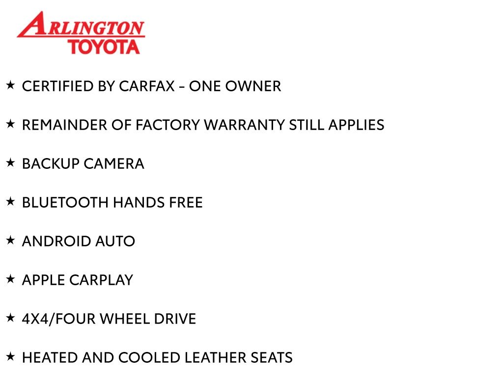 CERTIFIED BY CARFAX - ONE OWNER, REMAINDER OF FACTORY WARRANTY STILL APPLIES, BACKUP CAMERA, BLUETOOTH HANDS FREE, ANDROID AUTO, APPLE CARPLAY, 4X4/FOUR WHEEL DRIVE, HEATED AND COOLED LEATHER SEATS, POWER SEATS, MEMORY SEATS, SUNROOF/MOONROOF, TOW PACKAGE, PUSH BUTTON START, LANE DEPARTURE, ADAPTIVE CRUISE CONTROL, NON SMOKER, 4Runner Limited 4x4, Toyota Certified Used Hybrids Certified, 4D Sport Utility, 4.0L V6 DOHC 24V, 5-Speed with ECT, 4WD, Classic Silver Metallic, Black/Graphite w/Leather Seat Trim, ABS brakes, Electronic Stability Control, Front dual zone A/C, Low tire pressure warning, Remote keyless entry, Steering wheel mounted audio controls, Turn signal indicator mirrors, 15 Speakers, 3.727 Axle Ratio, 4-Wheel Disc Brakes, Air Conditioning, Alloy wheels, AM/FM radio: SiriusXM, Anti-whiplash front head restraints, Apple CarPlay/Android Auto, Auto High-beam Headlights, Auto-dimming Rear-View mirror, Automatic temperature control, Brake assist, Bumpers: body-color, Compass, Delay-off headlights, Driver door bin, Driver vanity mirror, Dual front impact airbags, Dual front side impact airbags, Dual Zone Auto Climate Control, Exterior Parking Camera Rear, Front anti-roll bar, Front Bucket Seats, Front Center Armrest, Front fog lights, Front reading lights, Front wheel independent suspension, Fully automatic headlights, Garage Door Opener, Garage door transmitter: HomeLink, Heated & Ventilated Front Bucket Seats, Heated door mirrors, Heated front seats, Heated Outside Rear-View Mirrors, Heated steering wheel, Illuminated entry, Knee airbag, Leather Seat Trim, Memory seat, Moonroof w/Tilt Up & Slide, Navigation System, Occupant sensing airbag, Outside temperature display, Overhead airbag, Overhead console, Panic alarm, Panoramic Back Monitor, Passenger door bin, Passenger vanity mirror, Power door mirrors, Power driver seat, Power moonroof, Power passenger seat, Power steering, Power windows, Radio: Premium Audio w/JBL, Rear anti-roll bar, Rear seat center armrest, Rear window defroster, Rear window wiper, Security system, Silver Roof Rails, Speed control, Speed-sensing steering, Split folding rear seat, Spoiler, Tachometer, Telescoping steering wheel, Tilt steering wheel, Traction control, Trip computer, Variably intermittent wipers, Ventilated front seats, Wheels: 20" Unique Dual 6-Spoke Alloy, 4Runner Limited 4x4, 4D Sport Utility, 4.0L V6 DOHC 24V, 5-Speed with ECT, 4WD, Classic Silver Metallic, Black/Graphite w/Leather Seat Trim, ABS brakes, Electronic Stability Control, Front dual zone A/C, Low tire pressure warning, Remote keyless entry, Steering wheel mounted audio controls, Turn signal indicator mirrors.