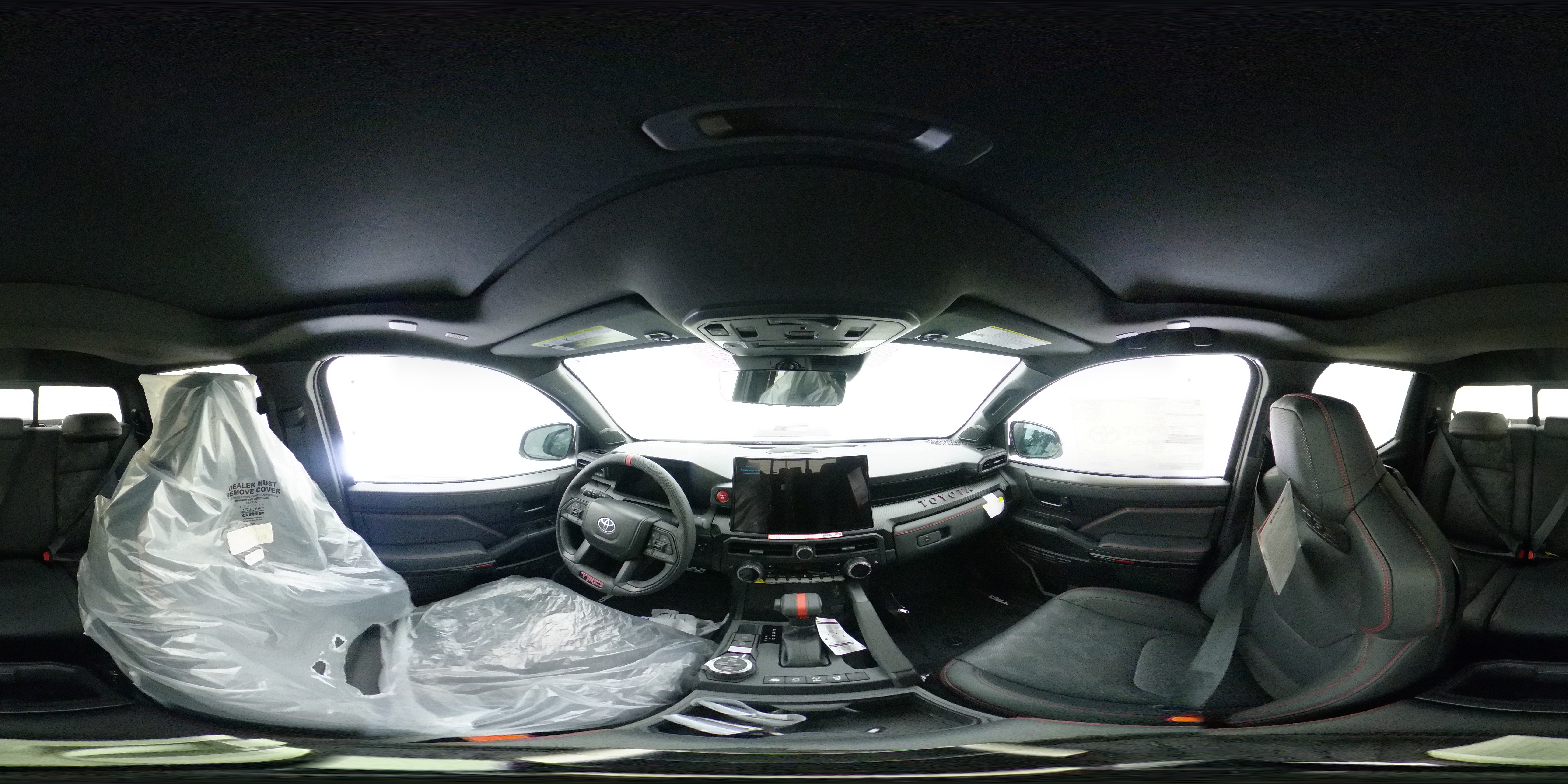 - TRD Pro leather-trimmed manual tilt/telescopic steering wheel with TRD badge, red center stripe, and phone, audio, display/infotainment, and Driver Assist controls