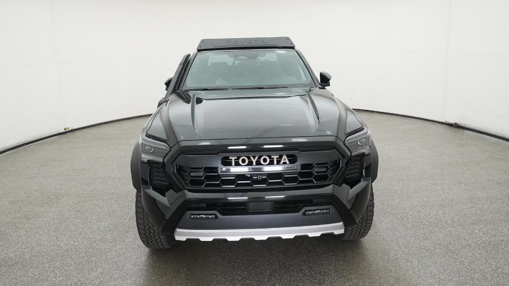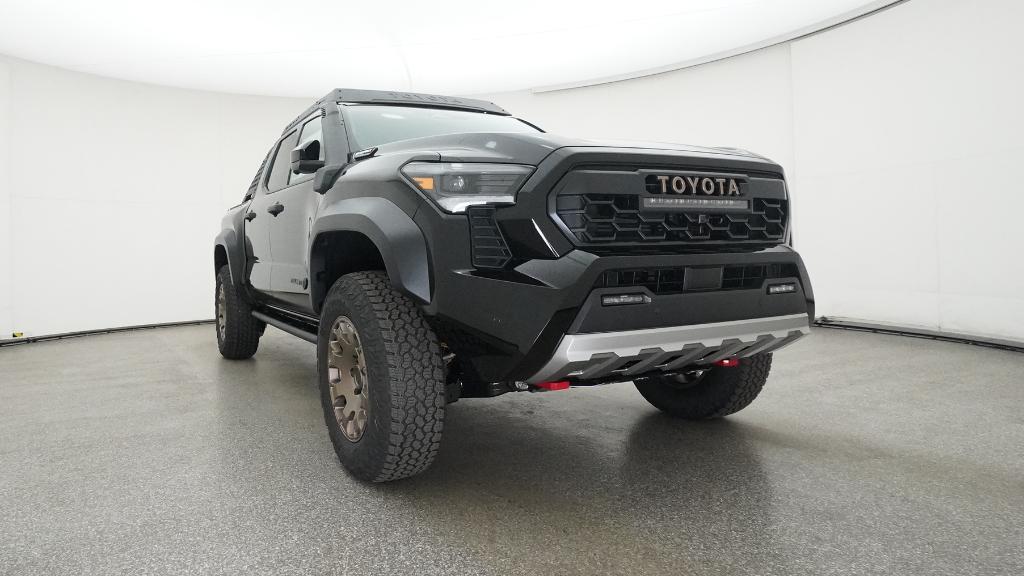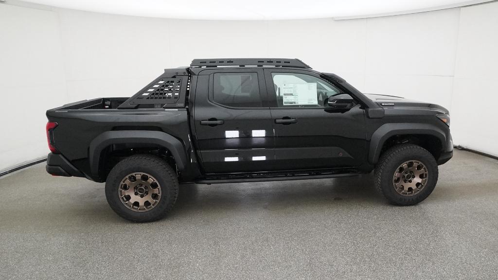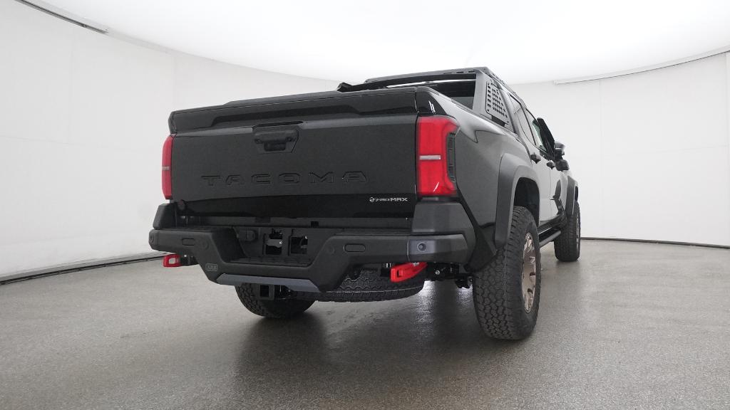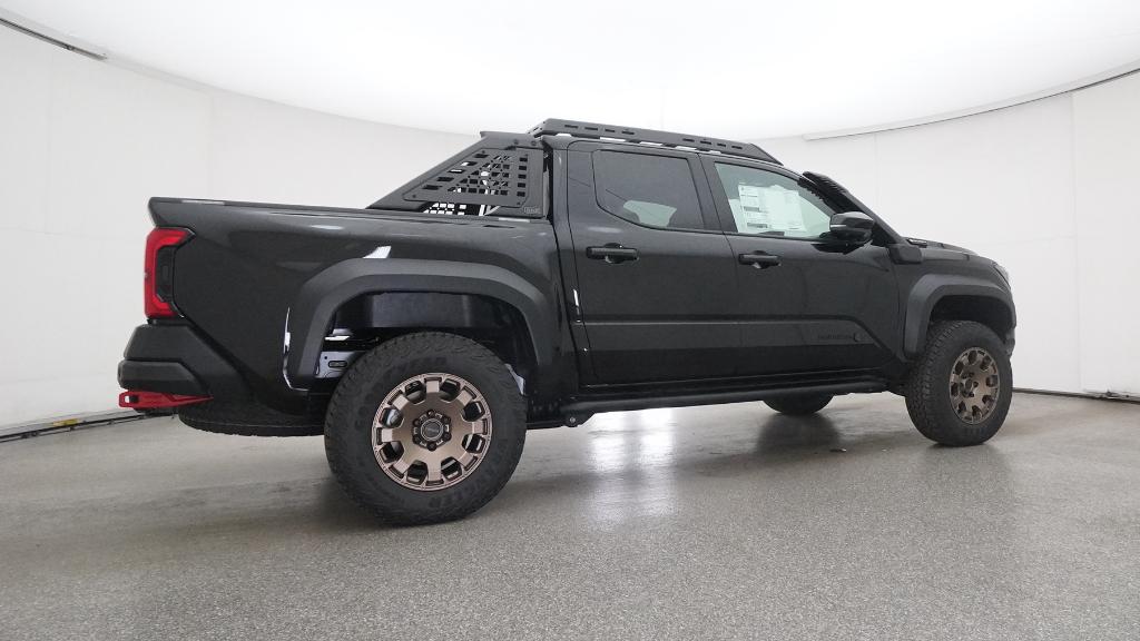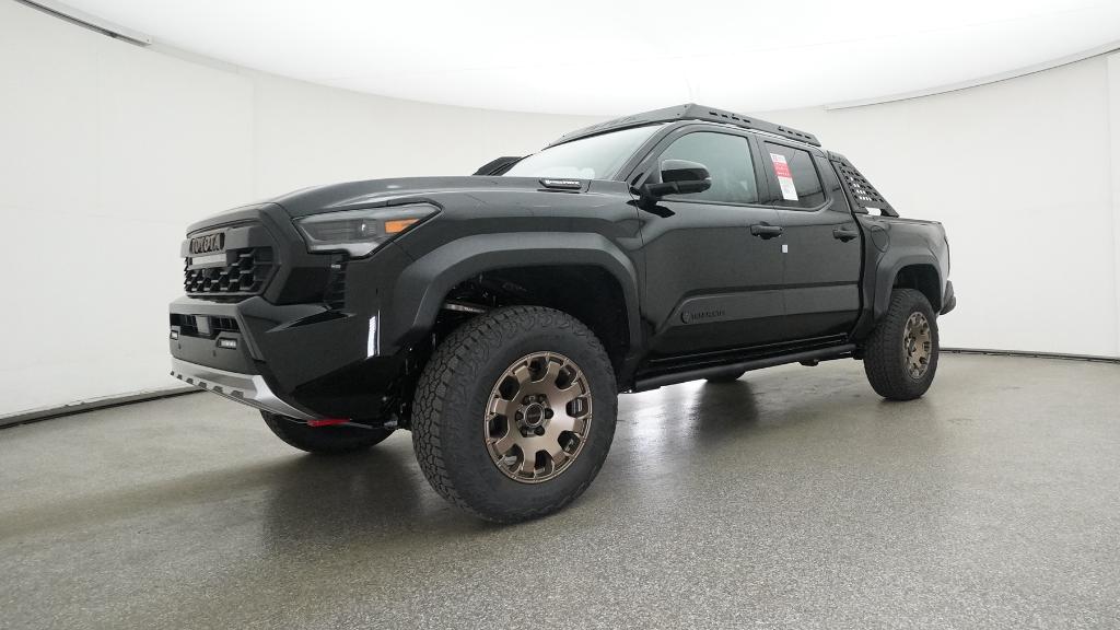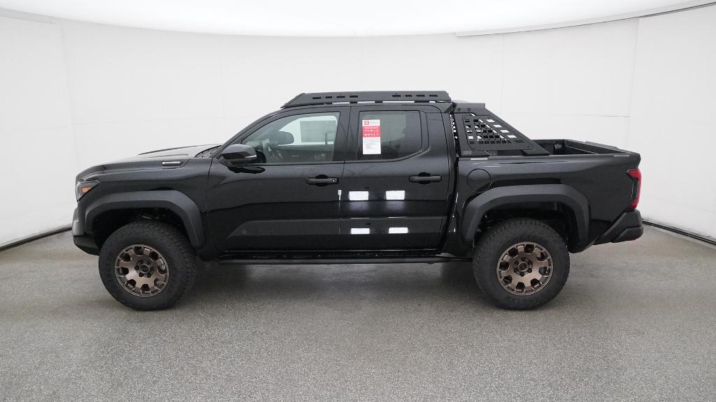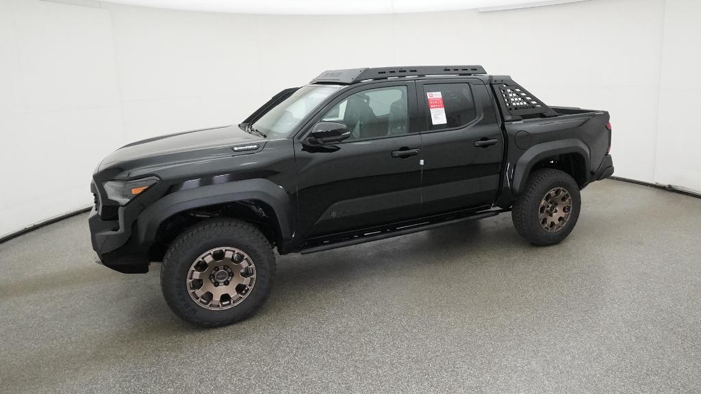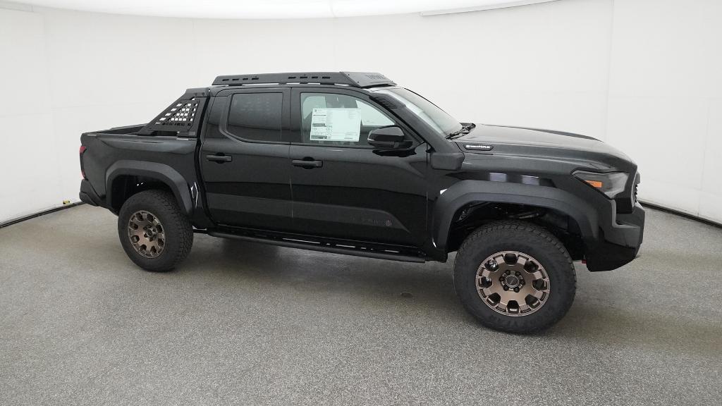 2025 Toyota Tacoma Hybrid Trailhunter Black 4WD 8-Speed Automatic 2.4L I4 PDI Hybrid Turbocharged DOHC 16V3.583 Axle Ratio, 4-Wheel Disc Brakes, 9 Speakers, ABS brakes, Air Conditioning, Alloy wheels, AM/FM radio: SiriusXM, Anti-whiplash front head restraints, Apple CarPlay/Android Auto, Auto High-beam Headlights, Auto-dimming Rear-View mirror, Automatic temperature control, Brake assist, Bumpers: body-color, Driver door bin, Driver vanity mirror, Dual front impact airbags, Dual front side impact airbags, Electronic Stability Control, Emergency communication system: Safety Connect (1-year trial), Exterior Parking Camera Rear, Four wheel independent suspension, Front anti-roll bar, Front Bucket Seats, Front Center Armrest, Front dual zone A/C, Front fog lights, Front reading lights, Fully automatic headlights, Garage door transmitter: HomeLink, Heads-Up Display, Heated & Ventilated Front Bucket Seats, Heated door mirrors, Heated front seats, Heated steering wheel, Illuminated entry, JBL Premium Audio, Knee airbag, Leather Shift Knob, Leather steering wheel, Low tire pressure warning, Navigation system: Drive Connect (1 year trial) includes Cloud Navigation with real time traffic and Google POI, Occupant sensing airbag, Outside temperature display, Overhead airbag, Overhead console, Panic alarm, Passenger door bin, Passenger vanity mirror, Power door mirrors, Power driver seat, Power passenger seat, Power steering, Power windows, Radio: 14 Toyota Audio Multimedia, Rear anti-roll bar, Rear step bumper, Rear window defroster, Remote keyless entry, Security system, SofTex Seat Trim, Speed control, Speed-sensing steering, Split folding rear seat, Steering wheel mounted audio controls, Tachometer, Telescoping steering wheel, Tilt steering wheel, Traction control, Trip computer, Turn signal indicator mirrors, Variably intermittent wipers, Ventilated front seats, Wheels: 18 Bronze-Finished Trailhunter Alloy.