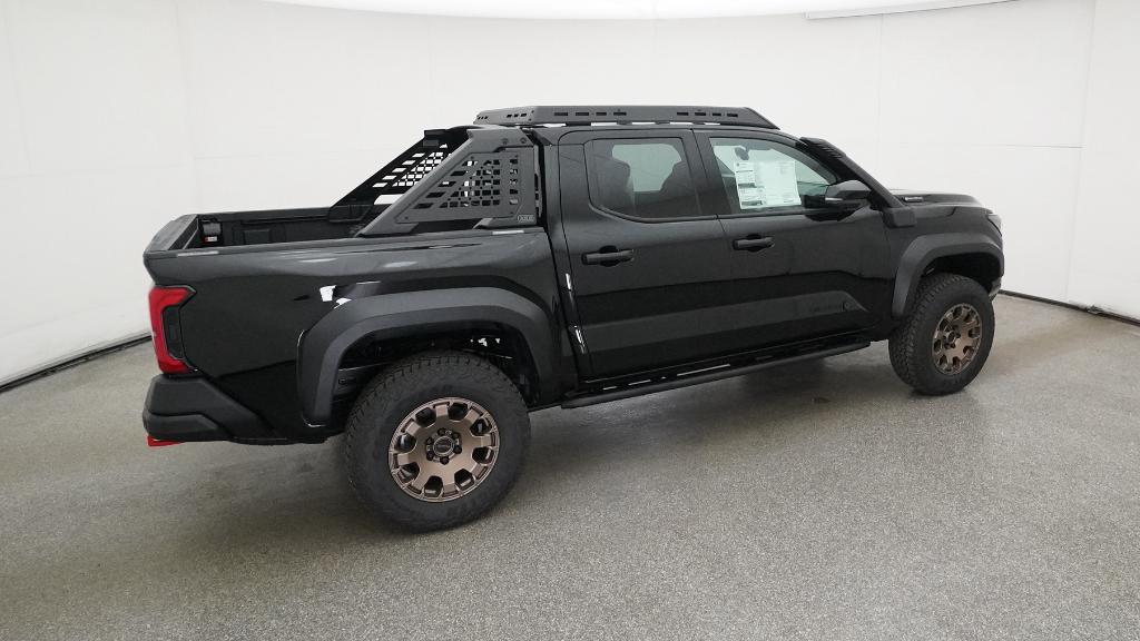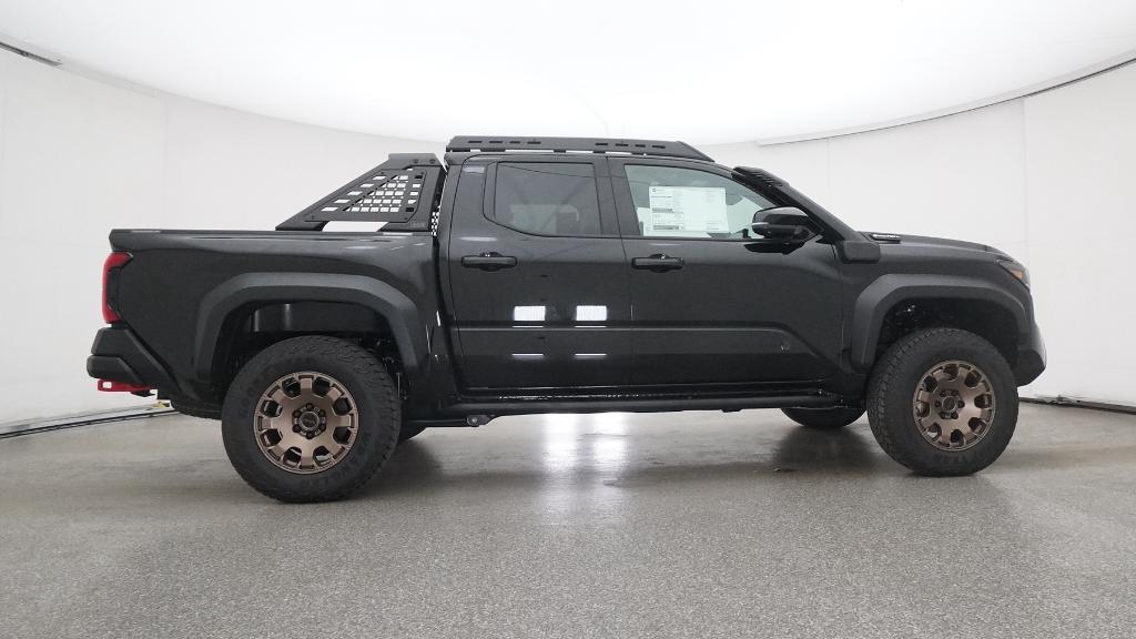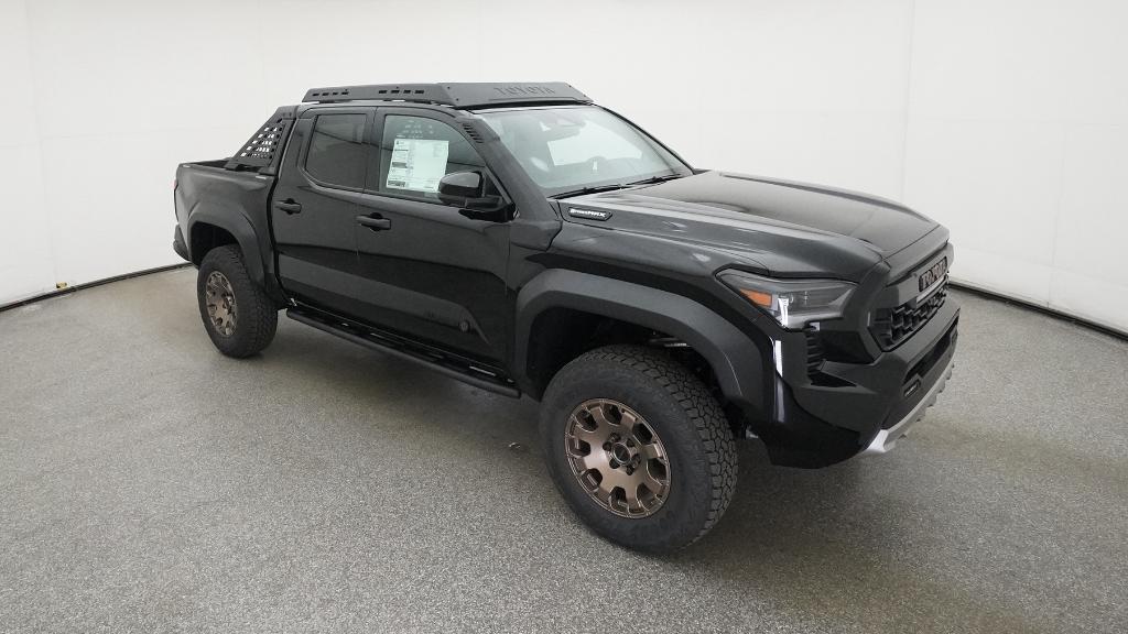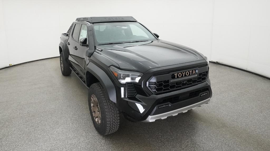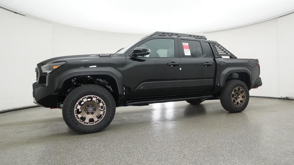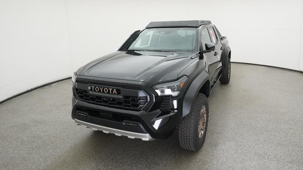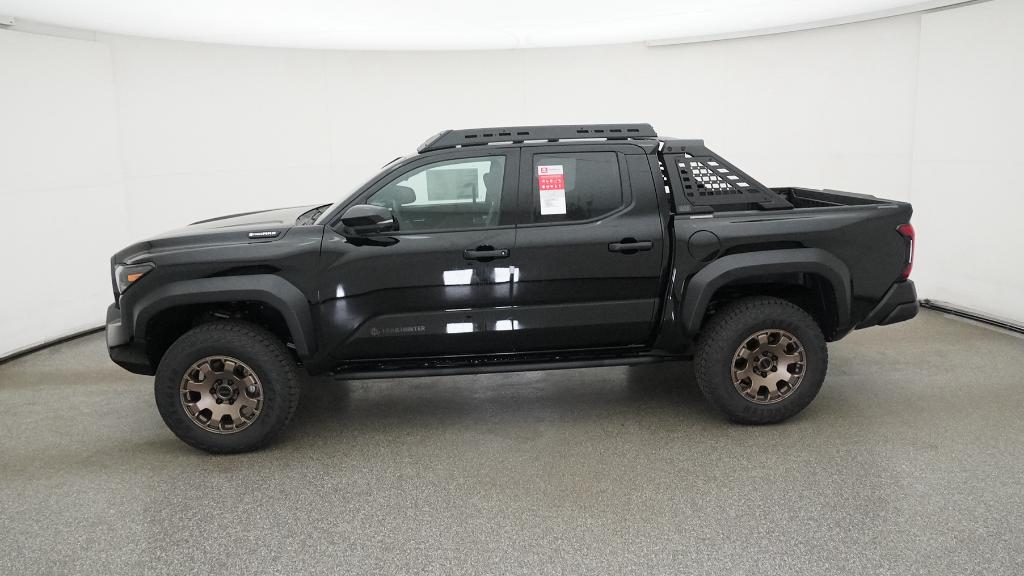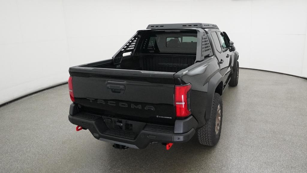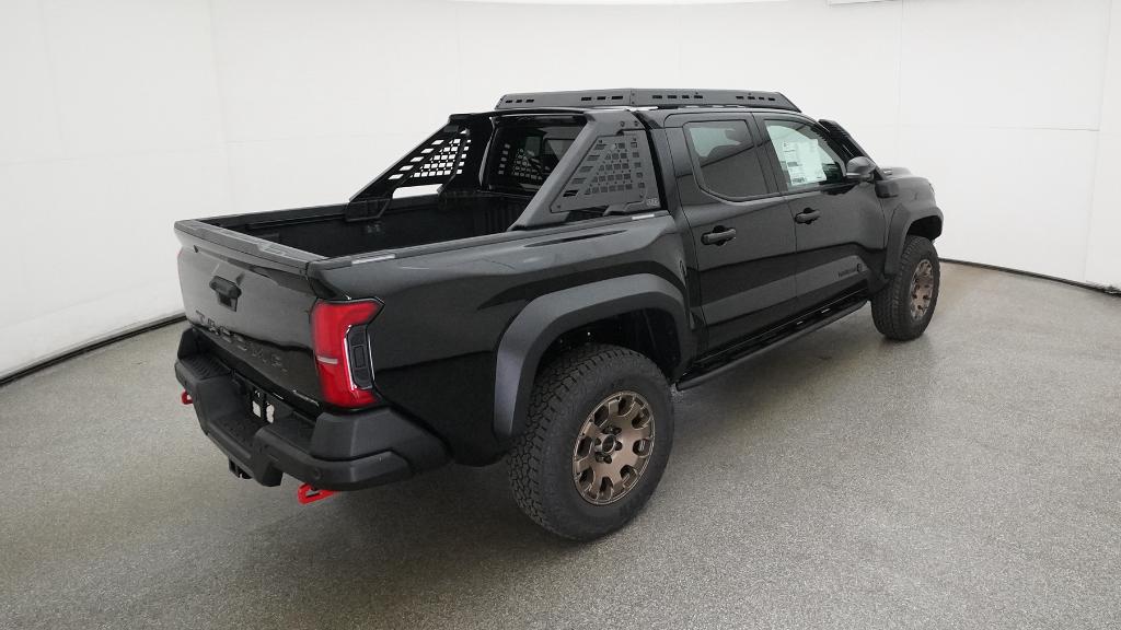 2025 Toyota Tacoma Hybrid Trailhunter Black 4WD 8-Speed Automatic 2.4L I4 PDI Hybrid Turbocharged DOHC 16V3.583 Axle Ratio, 4-Wheel Disc Brakes, 9 Speakers, ABS brakes, Air Conditioning, Alloy wheels, AM/FM radio: SiriusXM, Anti-whiplash front head restraints, Apple CarPlay/Android Auto, Auto High-beam Headlights, Auto-dimming Rear-View mirror, Automatic temperature control, Brake assist, Bumpers: body-color, Driver door bin, Driver vanity mirror, Dual front impact airbags, Dual front side impact airbags, Electronic Stability Control, Emergency communication system: Safety Connect (1-year trial), Exterior Parking Camera Rear, Four wheel independent suspension, Front anti-roll bar, Front Bucket Seats, Front Center Armrest, Front dual zone A/C, Front fog lights, Front reading lights, Fully automatic headlights, Garage door transmitter: HomeLink, Heads-Up Display, Heated & Ventilated Front Bucket Seats, Heated door mirrors, Heated front seats, Heated steering wheel, Illuminated entry, JBL Premium Audio, Knee airbag, Leather Shift Knob, Leather steering wheel, Low tire pressure warning, Navigation system: Drive Connect (1 year trial) includes Cloud Navigation with real time traffic and Google POI, Occupant sensing airbag, Outside temperature display, Overhead airbag, Overhead console, Panic alarm, Passenger door bin, Passenger vanity mirror, Power door mirrors, Power driver seat, Power passenger seat, Power steering, Power windows, Radio: 14 Toyota Audio Multimedia, Rear anti-roll bar, Rear step bumper, Rear window defroster, Remote keyless entry, Security system, SofTex Seat Trim, Speed control, Speed-sensing steering, Split folding rear seat, Steering wheel mounted audio controls, Tachometer, Telescoping steering wheel, Tilt steering wheel, Traction control, Trip computer, Turn signal indicator mirrors, Variably intermittent wipers, Ventilated front seats, Wheels: 18 Bronze-Finished Trailhunter Alloy.