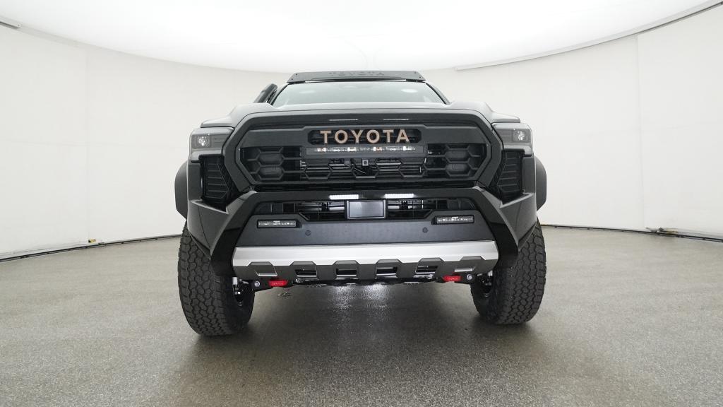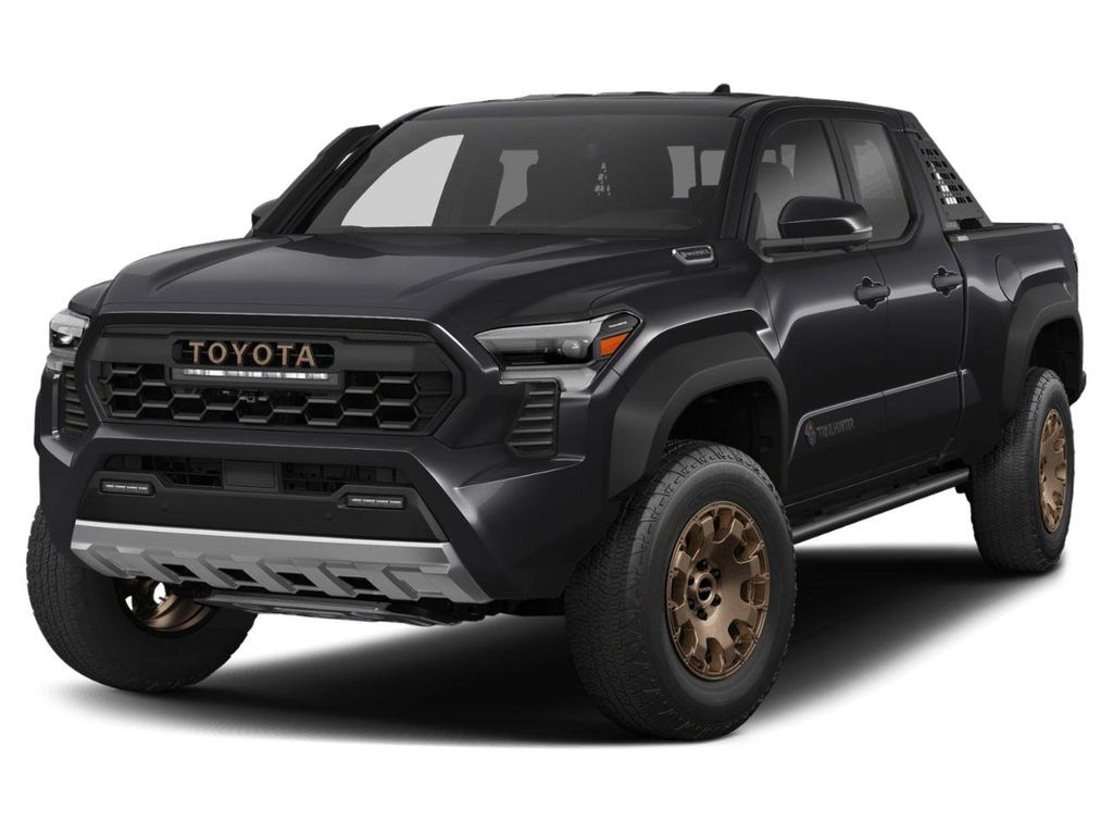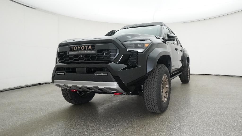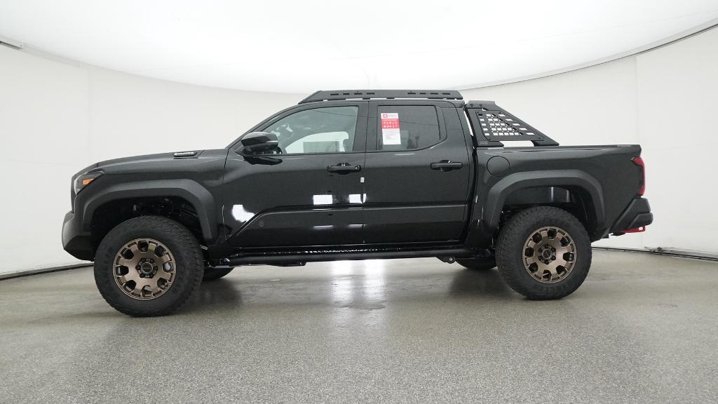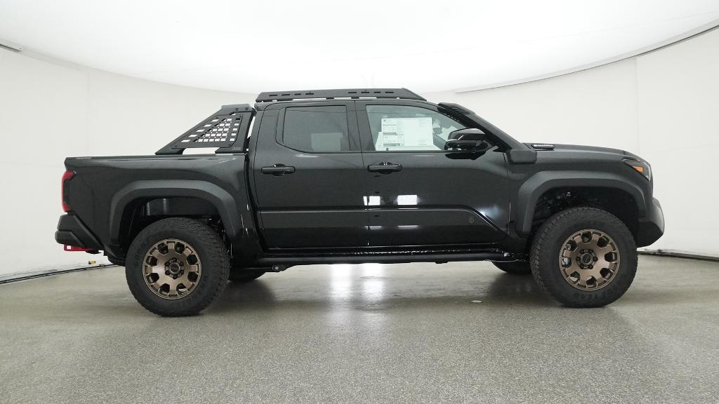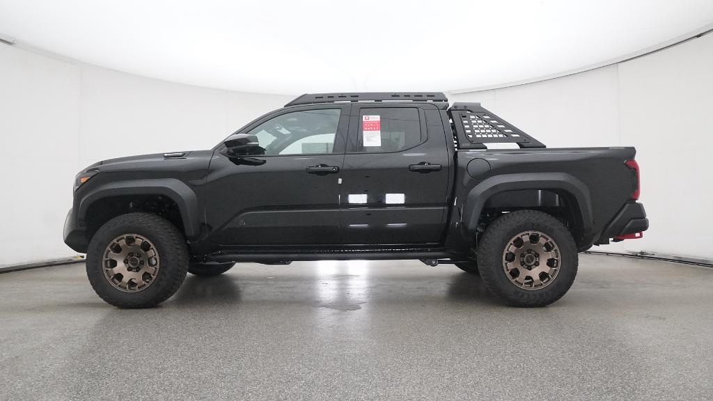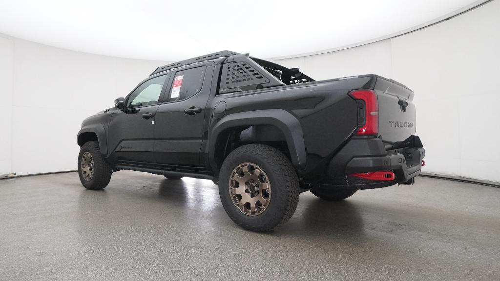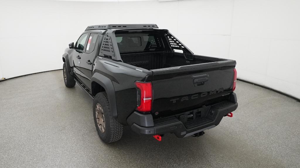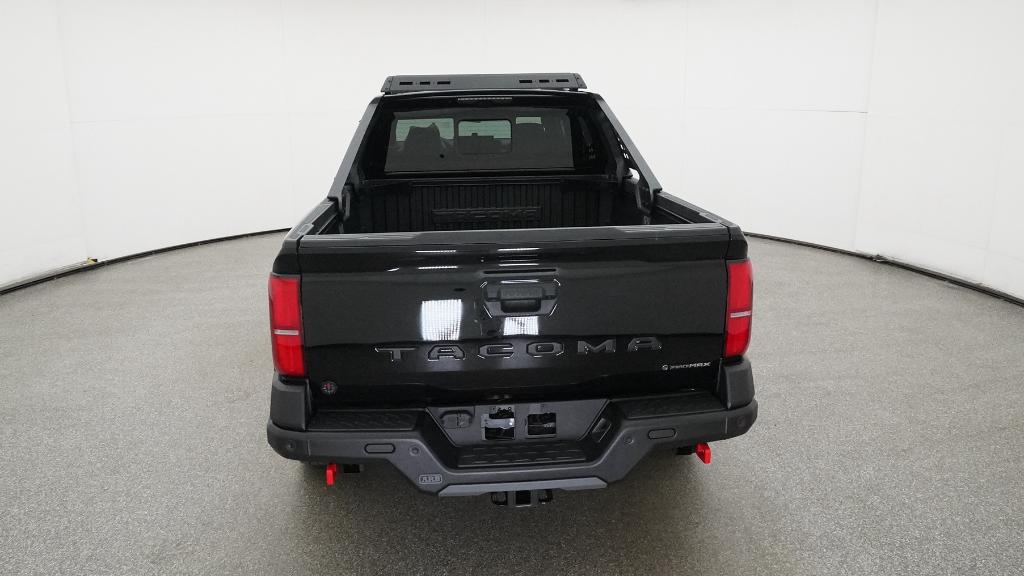 2025 Toyota Tacoma Hybrid Trailhunter Black 4WD 8-Speed Automatic 2.4L I4 PDI Hybrid Turbocharged DOHC 16V3.583 Axle Ratio, 4-Wheel Disc Brakes, 9 Speakers, ABS brakes, Air Conditioning, Alloy wheels, AM/FM radio: SiriusXM, Anti-whiplash front head restraints, Apple CarPlay/Android Auto, Auto High-beam Headlights, Auto-dimming Rear-View mirror, Automatic temperature control, Brake assist, Bumpers: body-color, Driver door bin, Driver vanity mirror, Dual front impact airbags, Dual front side impact airbags, Electronic Stability Control, Emergency communication system: Safety Connect (1-year trial), Exterior Parking Camera Rear, Four wheel independent suspension, Front anti-roll bar, Front Bucket Seats, Front Center Armrest, Front dual zone A/C, Front fog lights, Front reading lights, Fully automatic headlights, Garage door transmitter: HomeLink, Heads-Up Display, Heated & Ventilated Front Bucket Seats, Heated door mirrors, Heated front seats, Heated steering wheel, Illuminated entry, JBL Premium Audio, Knee airbag, Leather Shift Knob, Leather steering wheel, Low tire pressure warning, Navigation system: Drive Connect (1 year trial) includes Cloud Navigation with real time traffic and Google POI, Occupant sensing airbag, Outside temperature display, Overhead airbag, Overhead console, Panic alarm, Passenger door bin, Passenger vanity mirror, Power door mirrors, Power driver seat, Power passenger seat, Power steering, Power windows, Radio: 14 Toyota Audio Multimedia, Rear anti-roll bar, Rear step bumper, Rear window defroster, Remote keyless entry, Security system, SofTex Seat Trim, Speed control, Speed-sensing steering, Split folding rear seat, Steering wheel mounted audio controls, Tachometer, Telescoping steering wheel, Tilt steering wheel, Traction control, Trip computer, Turn signal indicator mirrors, Variably intermittent wipers, Ventilated front seats, Wheels: 18 Bronze-Finished Trailhunter Alloy.