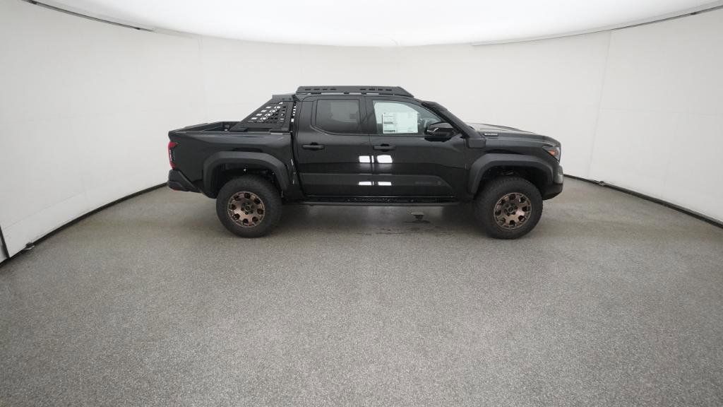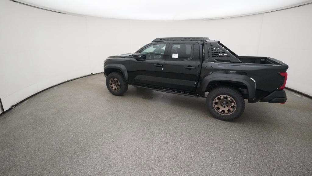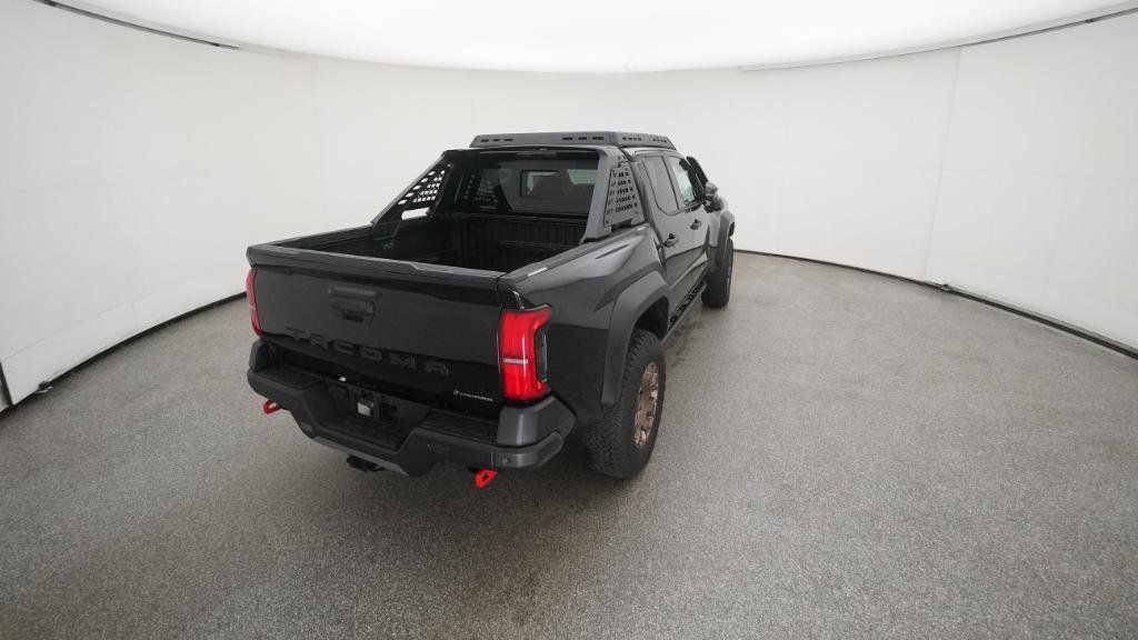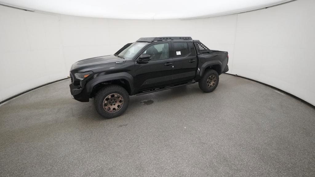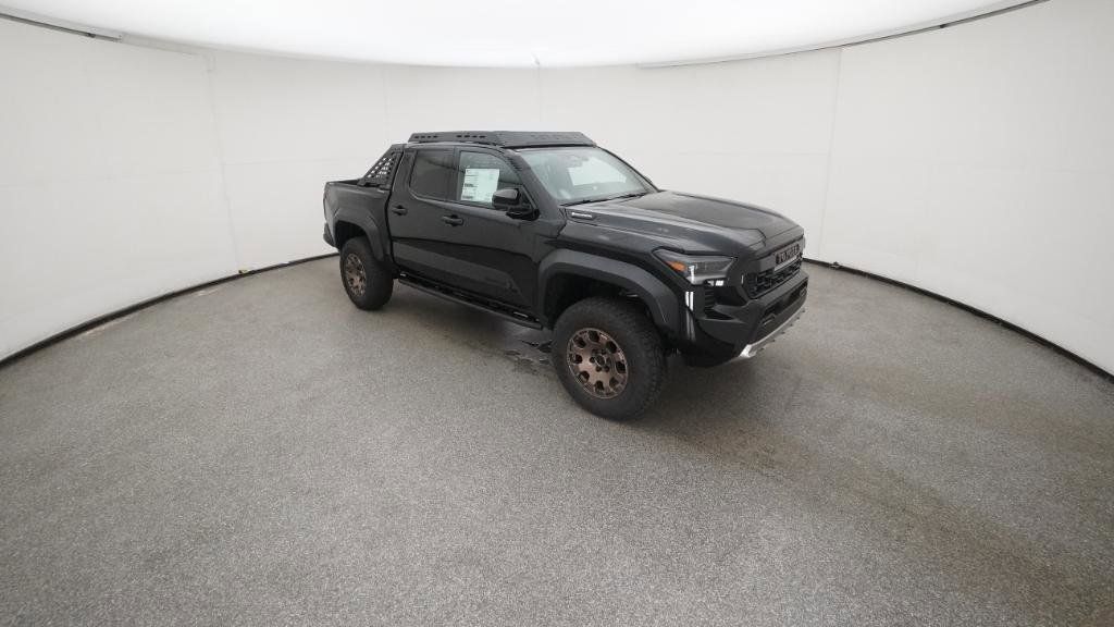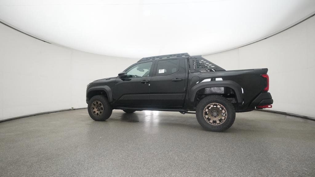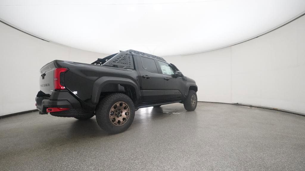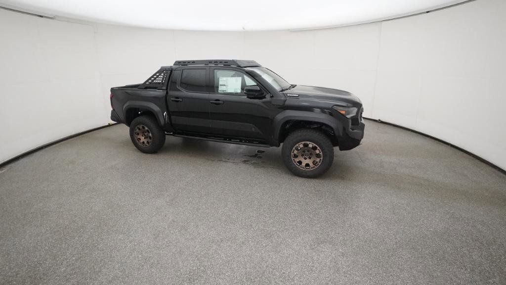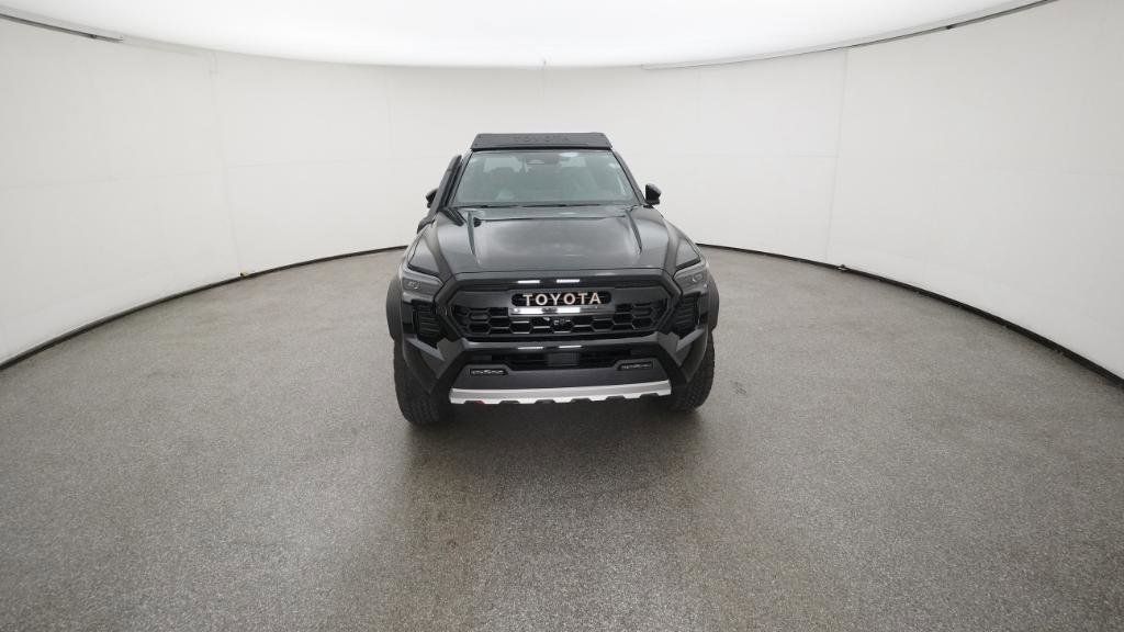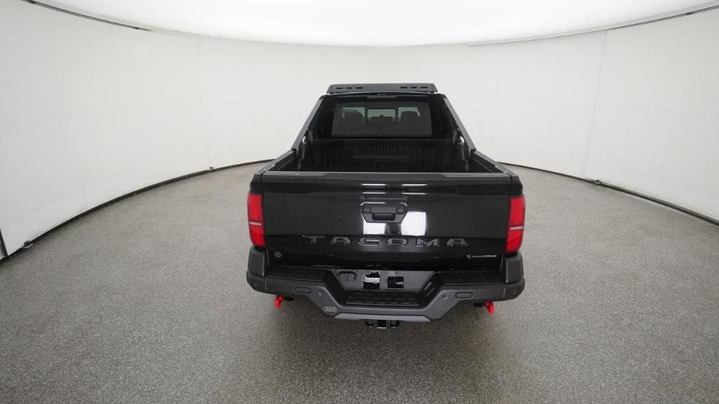 2025 Toyota Tacoma Hybrid Trailhunter Black 4WD 8-Speed Automatic 2.4L I4 PDI Hybrid Turbocharged DOHC 16V3.583 Axle Ratio, 4-Wheel Disc Brakes, 9 Speakers, ABS brakes, Air Conditioning, Alloy wheels, AM/FM radio: SiriusXM, Anti-whiplash front head restraints, Apple CarPlay/Android Auto, Auto High-beam Headlights, Auto-dimming Rear-View mirror, Automatic temperature control, Brake assist, Bumpers: body-color, Driver door bin, Driver vanity mirror, Dual front impact airbags, Dual front side impact airbags, Electronic Stability Control, Emergency communication system: Safety Connect (1-year trial), Exterior Parking Camera Rear, Four wheel independent suspension, Front anti-roll bar, Front Bucket Seats, Front Center Armrest, Front dual zone A/C, Front fog lights, Front reading lights, Fully automatic headlights, Garage door transmitter: HomeLink, Heads-Up Display, Heated & Ventilated Front Bucket Seats, Heated door mirrors, Heated front seats, Heated steering wheel, Illuminated entry, JBL Premium Audio, Knee airbag, Leather Shift Knob, Leather steering wheel, Low tire pressure warning, Navigation system: Drive Connect (1 year trial) includes Cloud Navigation with real time traffic and Google POI, Occupant sensing airbag, Outside temperature display, Overhead airbag, Overhead console, Panic alarm, Passenger door bin, Passenger vanity mirror, Power door mirrors, Power driver seat, Power passenger seat, Power steering, Power windows, Radio: 14 Toyota Audio Multimedia, Rear anti-roll bar, Rear step bumper, Rear window defroster, Remote keyless entry, Security system, SofTex Seat Trim, Speed control, Speed-sensing steering, Split folding rear seat, Steering wheel mounted audio controls, Tachometer, Telescoping steering wheel, Tilt steering wheel, Traction control, Trip computer, Turn signal indicator mirrors, Variably intermittent wipers, Ventilated front seats, Wheels: 18 Bronze-Finished Trailhunter Alloy.