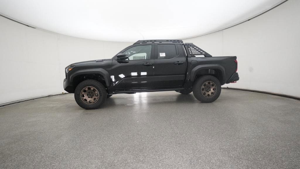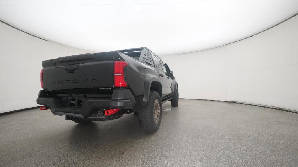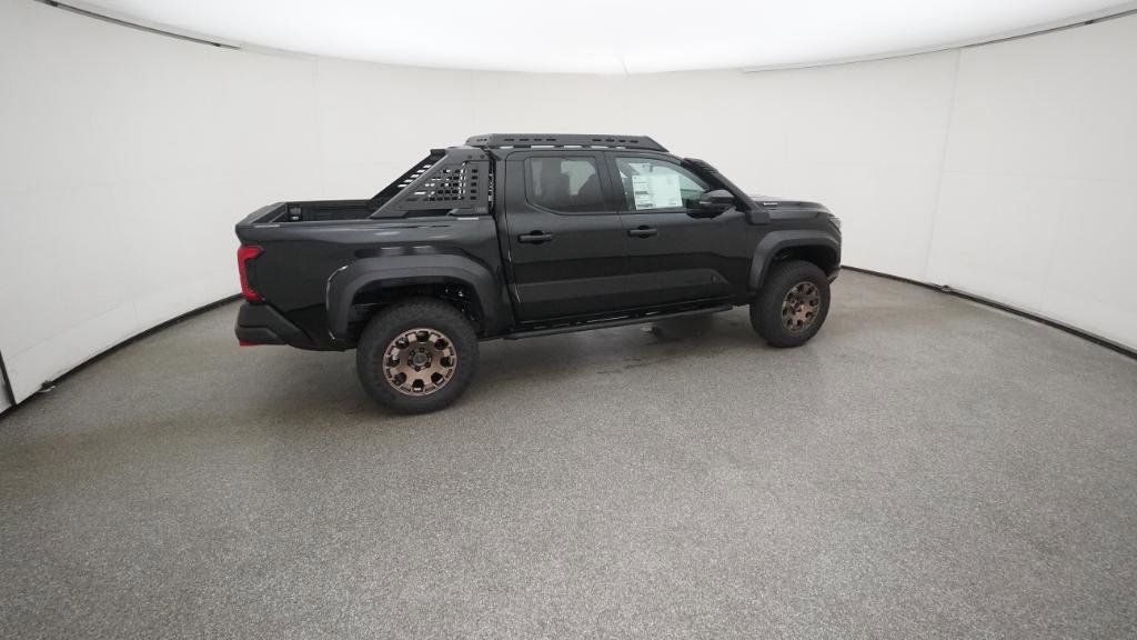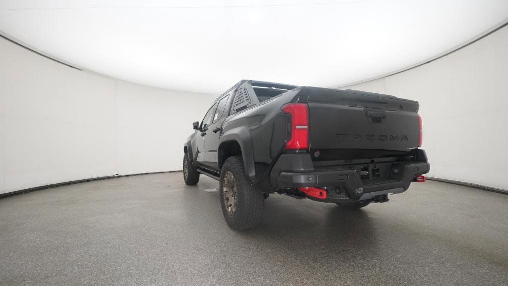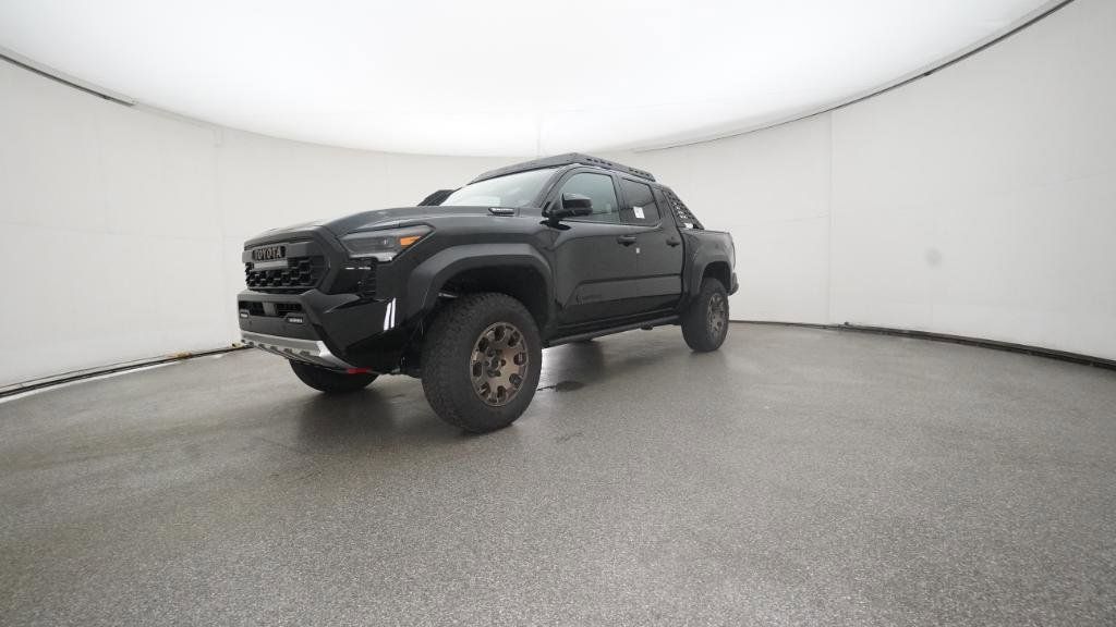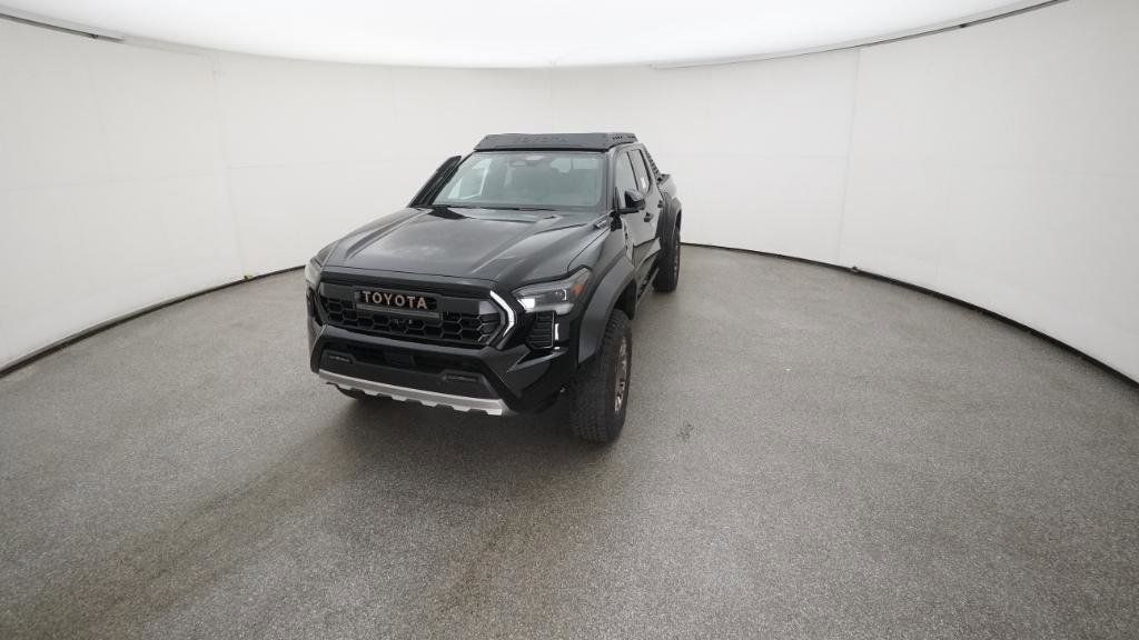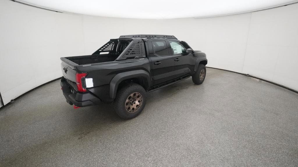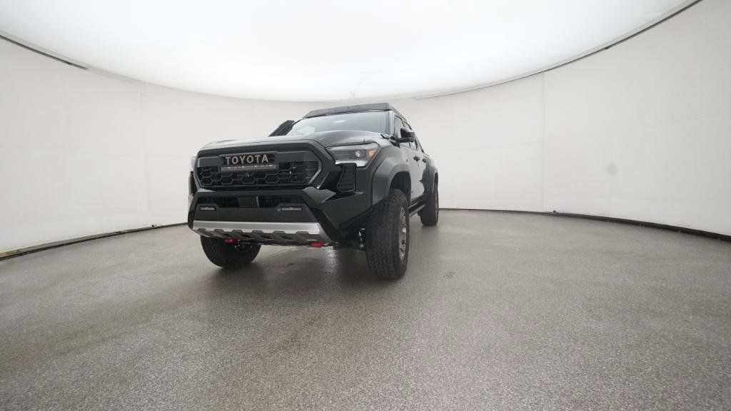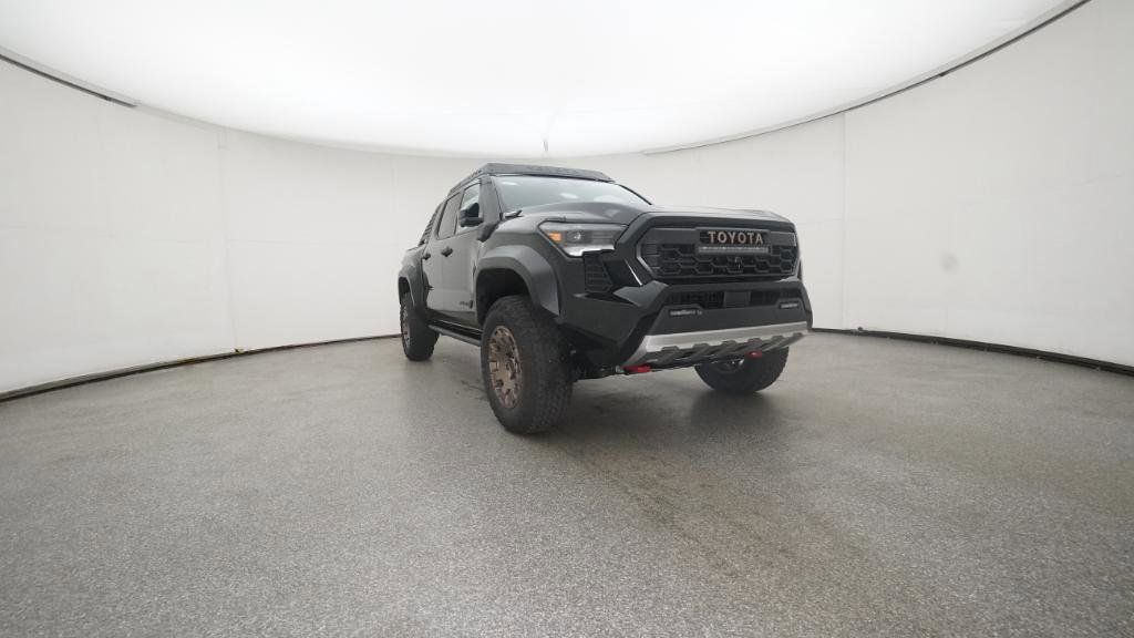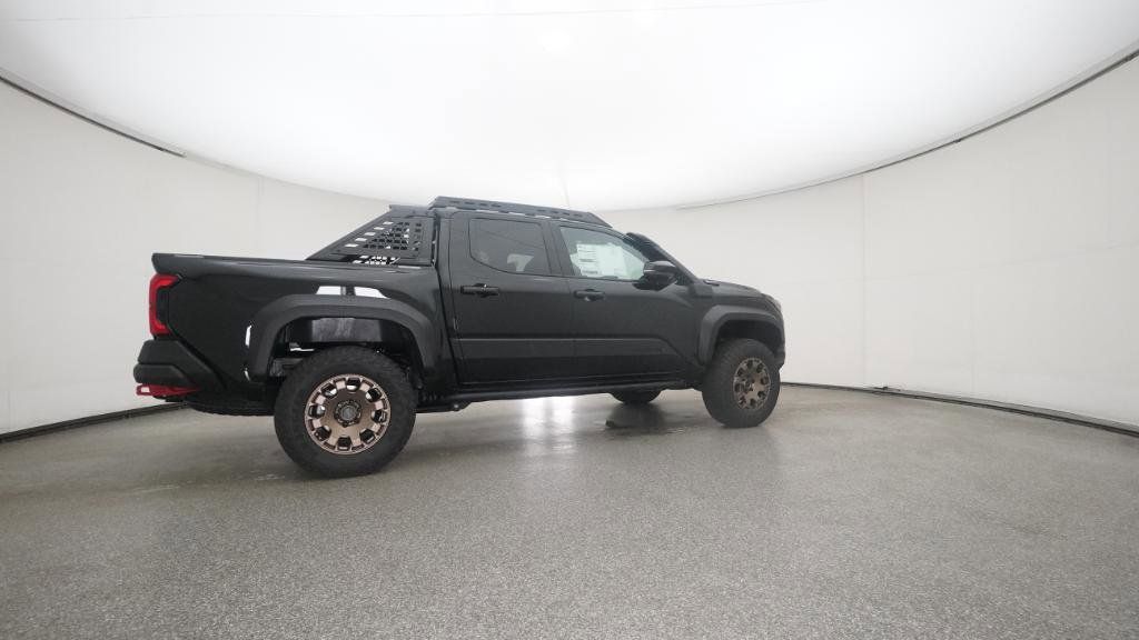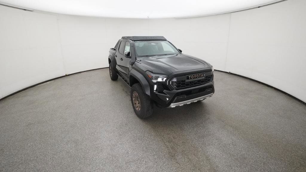 2025 Toyota Tacoma Hybrid Trailhunter Black 4WD 8-Speed Automatic 2.4L I4 PDI Hybrid Turbocharged DOHC 16V3.583 Axle Ratio, 4-Wheel Disc Brakes, 9 Speakers, ABS brakes, Air Conditioning, Alloy wheels, AM/FM radio: SiriusXM, Anti-whiplash front head restraints, Apple CarPlay/Android Auto, Auto High-beam Headlights, Auto-dimming Rear-View mirror, Automatic temperature control, Brake assist, Bumpers: body-color, Driver door bin, Driver vanity mirror, Dual front impact airbags, Dual front side impact airbags, Electronic Stability Control, Emergency communication system: Safety Connect (1-year trial), Exterior Parking Camera Rear, Four wheel independent suspension, Front anti-roll bar, Front Bucket Seats, Front Center Armrest, Front dual zone A/C, Front fog lights, Front reading lights, Fully automatic headlights, Garage door transmitter: HomeLink, Heads-Up Display, Heated & Ventilated Front Bucket Seats, Heated door mirrors, Heated front seats, Heated steering wheel, Illuminated entry, JBL Premium Audio, Knee airbag, Leather Shift Knob, Leather steering wheel, Low tire pressure warning, Navigation system: Drive Connect (1 year trial) includes Cloud Navigation with real time traffic and Google POI, Occupant sensing airbag, Outside temperature display, Overhead airbag, Overhead console, Panic alarm, Passenger door bin, Passenger vanity mirror, Power door mirrors, Power driver seat, Power passenger seat, Power steering, Power windows, Radio: 14 Toyota Audio Multimedia, Rear anti-roll bar, Rear step bumper, Rear window defroster, Remote keyless entry, Security system, SofTex Seat Trim, Speed control, Speed-sensing steering, Split folding rear seat, Steering wheel mounted audio controls, Tachometer, Telescoping steering wheel, Tilt steering wheel, Traction control, Trip computer, Turn signal indicator mirrors, Variably intermittent wipers, Ventilated front seats, Wheels: 18 Bronze-Finished Trailhunter Alloy.