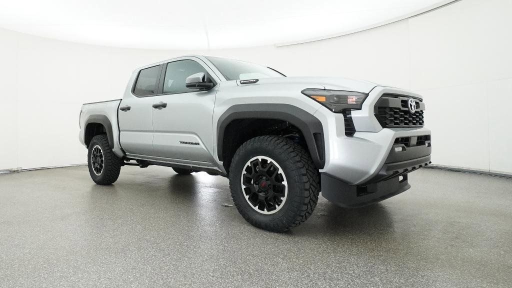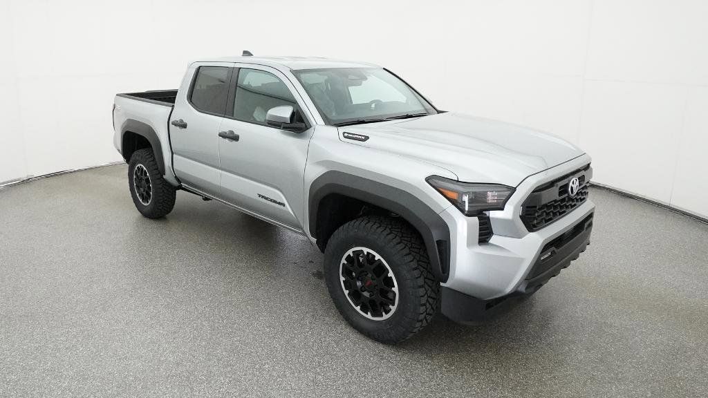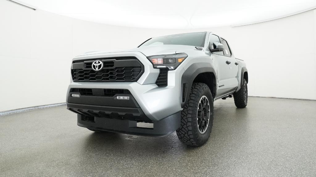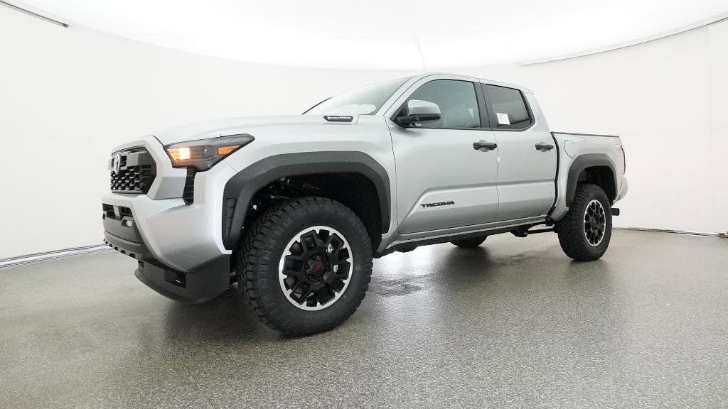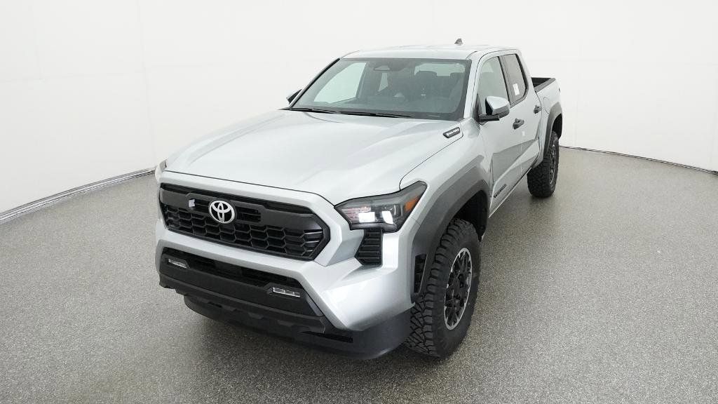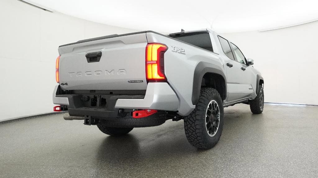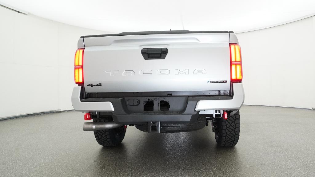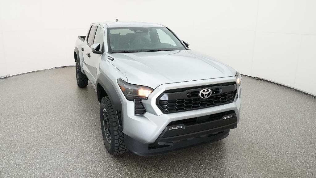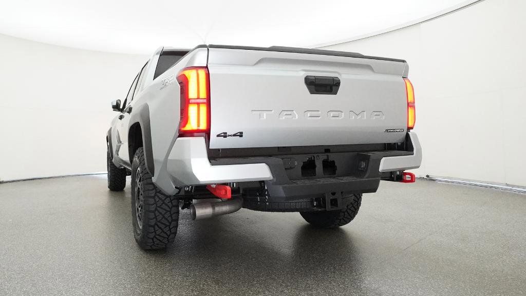 2025 Toyota Tacoma Hybrid TRD Off Road Celestial Silver Metallic 4WD 8-Speed Automatic 2.4L I4 PDI Hybrid Turbocharged DOHC 16V18 Alloy Wheels, 3.583 Axle Ratio, 4-Wheel Disc Brakes, 6 Speakers, ABS brakes, Air Conditioning, Alloy wheels, AM/FM radio: SiriusXM, Anti-whiplash front head restraints, Apple CarPlay/Android Auto, Auto High-beam Headlights, Auto-dimming Rear-View mirror, Automatic temperature control, Brake assist, Bumpers: body-color, Driver door bin, Driver vanity mirror, Dual front impact airbags, Dual front side impact airbags, Electronic Stability Control, Emergency communication system: Safety Connect (1-year trial), Exterior Parking Camera Rear, Fabric Seat Trim, Four wheel independent suspension, Front anti-roll bar, Front Bucket Seats, Front Center Armrest, Front fog lights, Front reading lights, Fully automatic headlights, Heated door mirrors, Illuminated entry, JBL Premium Audio, Knee airbag, Leather Shift Knob, Leather steering wheel, Low tire pressure warning, Navigation system: Drive Connect (1 year trial) includes Cloud Navigation with real time traffic and Google POI, Occupant sensing airbag, Outside temperature display, Overhead airbag, Overhead console, Panic alarm, Passenger door bin, Passenger vanity mirror, Power door mirrors, Power steering, Power windows, Radio: 14 Toyota Audio Multimedia, Radio: 8 Toyota Audio Multimedia, Rear step bumper, Rear window defroster, Remote keyless entry, Security system, SofTex Seat Trim, Speed control, Speed-sensing steering, Split folding rear seat, Steering wheel mounted audio controls, Tachometer, Telescoping steering wheel, Tilt steering wheel, Traction control, Trip computer, Turn signal indicator mirrors, Variably intermittent wipers.