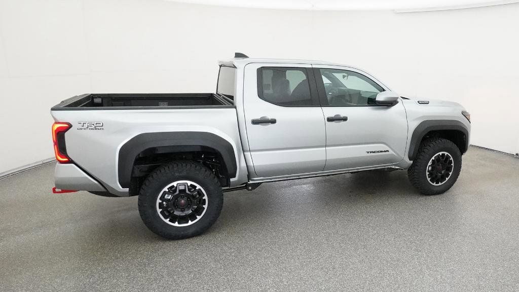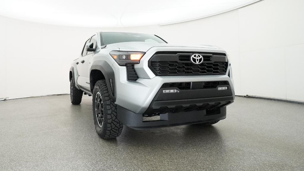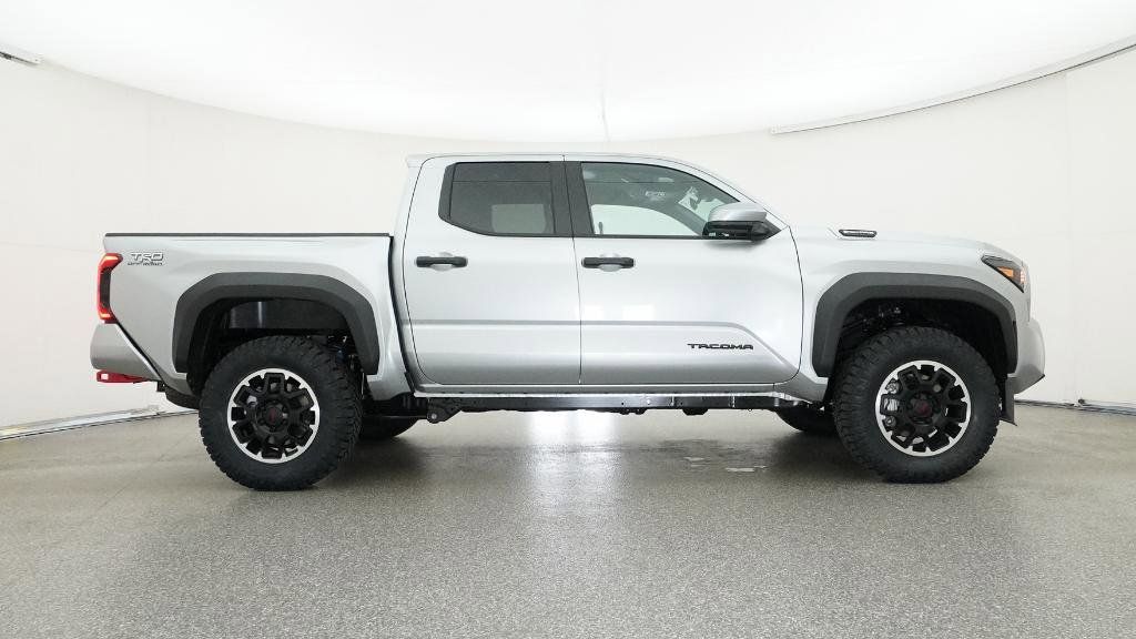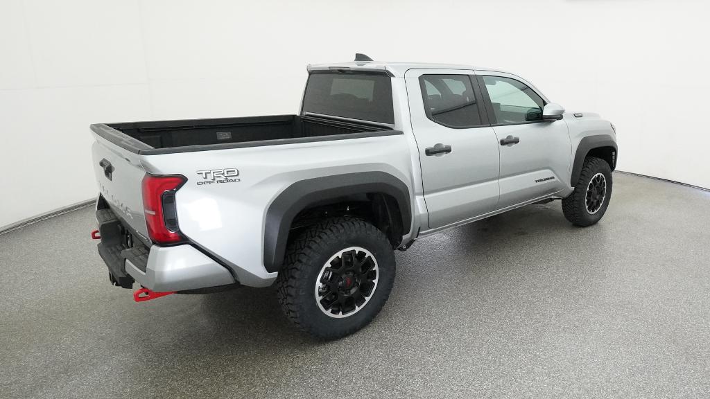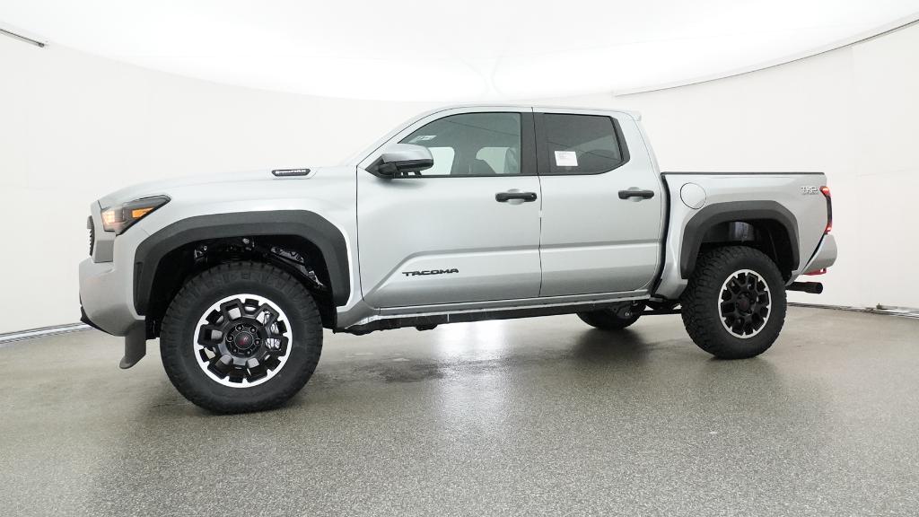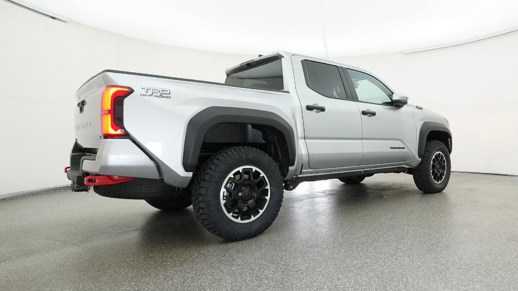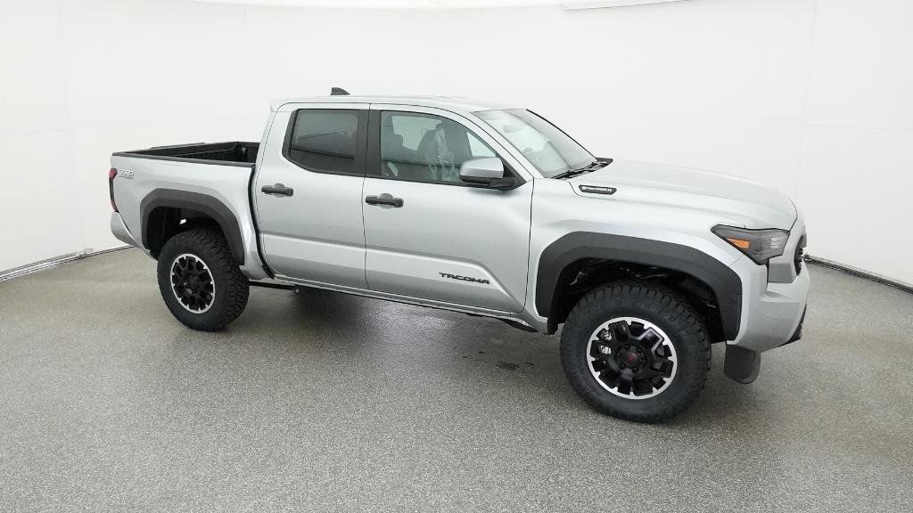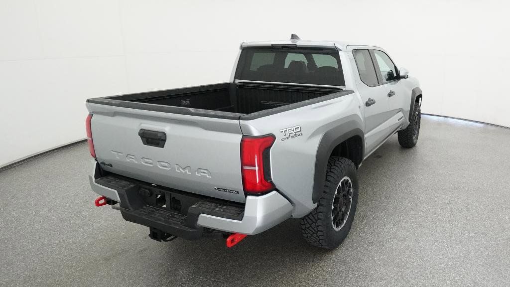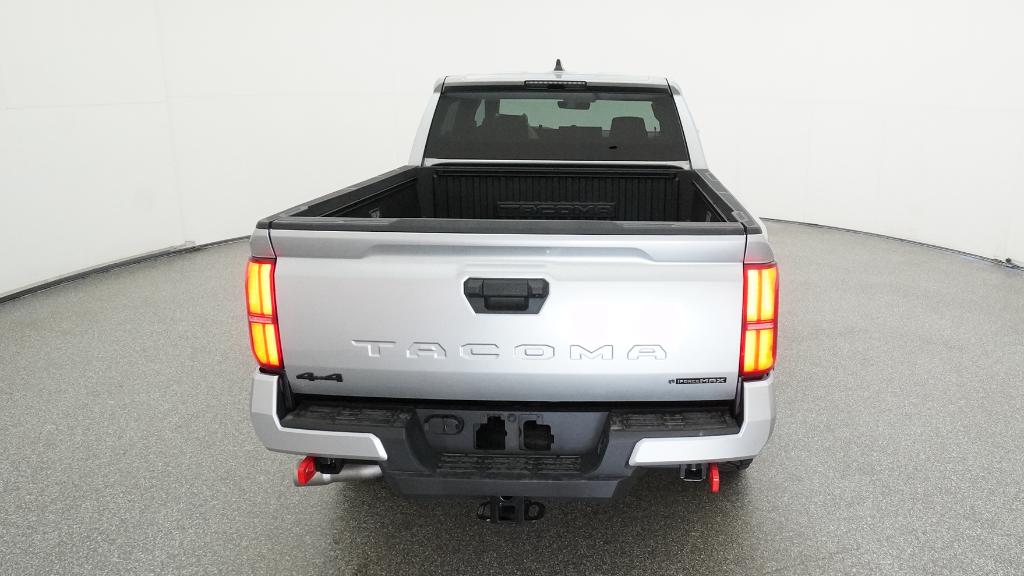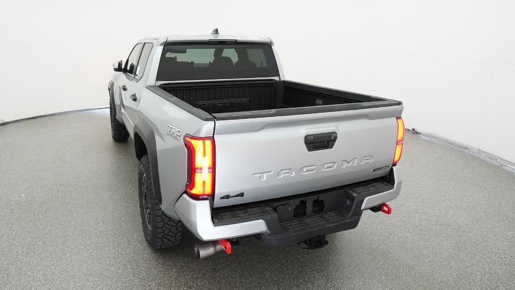 2025 Toyota Tacoma Hybrid TRD Off Road Celestial Silver Metallic 4WD 8-Speed Automatic 2.4L I4 PDI Hybrid Turbocharged DOHC 16V18 Alloy Wheels, 3.583 Axle Ratio, 4-Wheel Disc Brakes, 6 Speakers, ABS brakes, Air Conditioning, Alloy wheels, AM/FM radio: SiriusXM, Anti-whiplash front head restraints, Apple CarPlay/Android Auto, Auto High-beam Headlights, Auto-dimming Rear-View mirror, Automatic temperature control, Brake assist, Bumpers: body-color, Driver door bin, Driver vanity mirror, Dual front impact airbags, Dual front side impact airbags, Electronic Stability Control, Emergency communication system: Safety Connect (1-year trial), Exterior Parking Camera Rear, Fabric Seat Trim, Four wheel independent suspension, Front anti-roll bar, Front Bucket Seats, Front Center Armrest, Front fog lights, Front reading lights, Fully automatic headlights, Heated door mirrors, Illuminated entry, JBL Premium Audio, Knee airbag, Leather Shift Knob, Leather steering wheel, Low tire pressure warning, Navigation system: Drive Connect (1 year trial) includes Cloud Navigation with real time traffic and Google POI, Occupant sensing airbag, Outside temperature display, Overhead airbag, Overhead console, Panic alarm, Passenger door bin, Passenger vanity mirror, Power door mirrors, Power steering, Power windows, Radio: 14 Toyota Audio Multimedia, Radio: 8 Toyota Audio Multimedia, Rear step bumper, Rear window defroster, Remote keyless entry, Security system, SofTex Seat Trim, Speed control, Speed-sensing steering, Split folding rear seat, Steering wheel mounted audio controls, Tachometer, Telescoping steering wheel, Tilt steering wheel, Traction control, Trip computer, Turn signal indicator mirrors, Variably intermittent wipers.