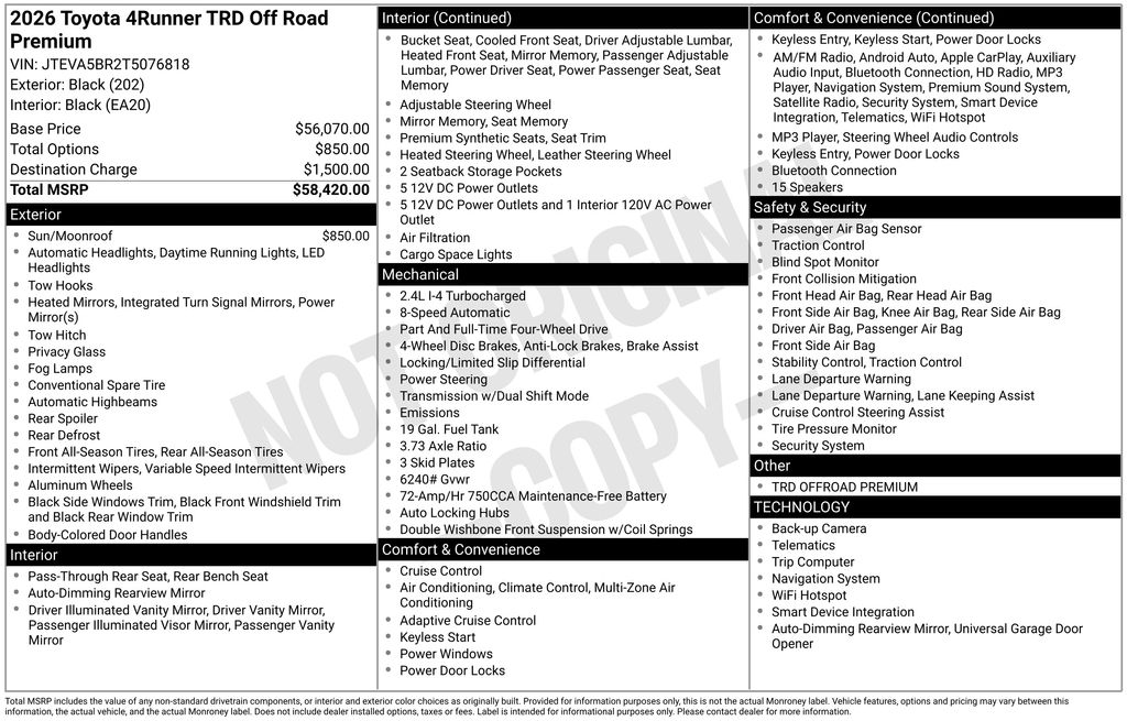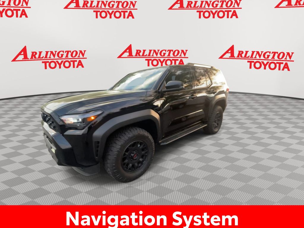 2026 Toyota 4Runner TRD Off-Road Premium Black 4WD 8-Speed Automatic 2.4L 4-Cylinder15 Speakers, 4-Wheel Disc Brakes, ABS brakes, Air Conditioning, Alloy wheels, AM/FM radio: SiriusXM, Anti-whiplash front head restraints, Apple CarPlay/Android Auto, Auto High-beam Headlights, Auto-dimming Rear-View mirror, Automatic temperature control, Brake assist, Bumpers: body-color, Compass, Driver door bin, Driver vanity mirror, Dual front impact airbags, Dual front side impact airbags, Electronic Stability Control, Emergency communication system: Safety Connect (1-year trial), Exterior Parking Camera Rear, Front anti-roll bar, Front Bucket Seats, Front Center Armrest, Front dual zone A/C, Front fog lights, Front reading lights, Front wheel independent suspension, Heated and Ventilated Front Bucket Seats, Heated door mirrors, Heated front seats, Heated steering wheel, Illuminated entry, Knee airbag, Leather Shift Knob, Leather steering wheel, Low tire pressure warning, Memory seat, Navigation System, Occupant sensing airbag, Outside temperature display, Overhead airbag, Overhead console, Panic alarm, Passenger door bin, Passenger vanity mirror, Power door mirrors, Power driver seat, Power passenger seat, Power steering, Power windows, Radio: 14 Audio, Rear anti-roll bar, Rear seat center armrest, Rear side impact airbag, Rear window defroster, Rear window wiper, Remote keyless entry, Security system, SofTex Seat Trim, Speed control, Speed-sensing steering, Split folding rear seat, Spoiler, Steering wheel mounted audio controls, Tachometer, Telescoping steering wheel, Tilt steering wheel, Traction control, Trip computer, Turn signal indicator mirrors, Variably intermittent wipers, Ventilated front seats, Wheels: 18 Matte-Black Painted.