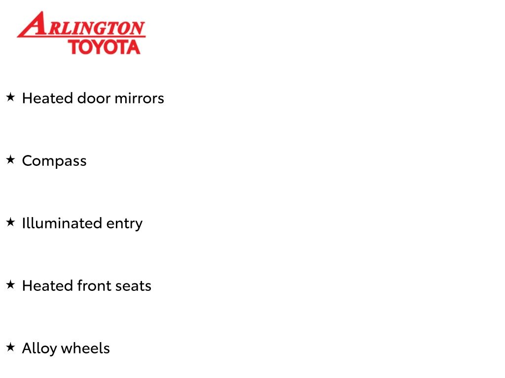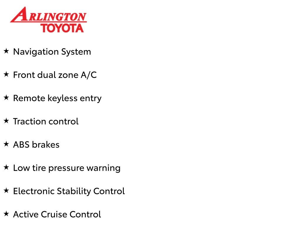 Prices do not include tax, tag, title, a pre-delivery service fee* of $894.00, an electronic registration filing fee* of $199.00 (*these charges represent costs and profits to the dealer for items such as inspecting, cleaning, and preparing documents related to the sale), and an Arlington Toyota Total Value Package of $1,889.00 (*these charges represent costs and profits to the dealer for items such as inspecting, cleaning, and preparing documents related to the sale). Price includes all Toyota-to-Factory Incentives. Any price does not include dealer-installed accessories. All offers are mutually exclusive. All vehicles are subject to prior sale. See dealer for complete details.