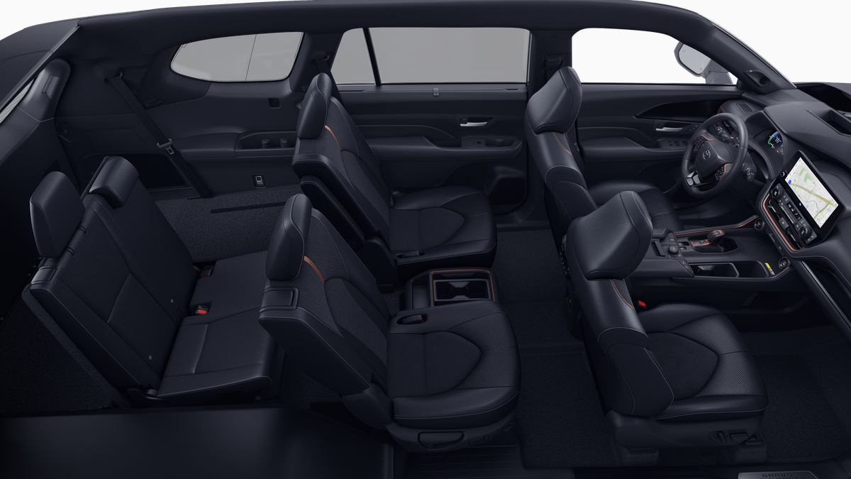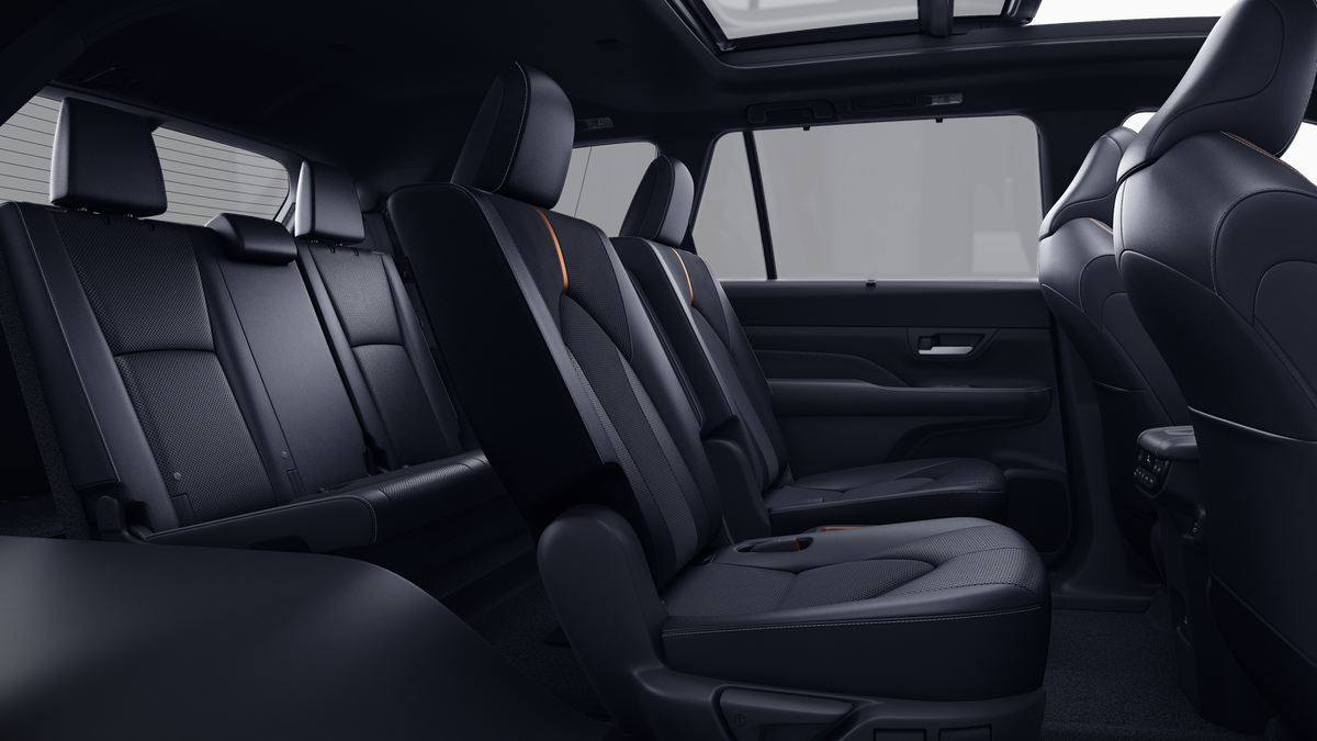 - 7-passenger seating with second-row fold-down captain's chairs and fold-down inboard armrests, adjustable headrests and two cup holders mounted on the floor; and 60/40 split, fold-down third-row seats with sliding headrests and recline function