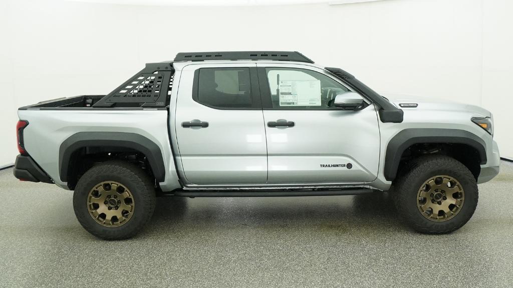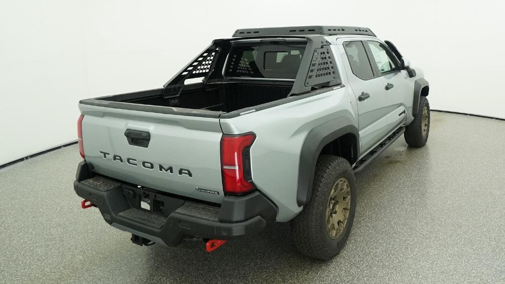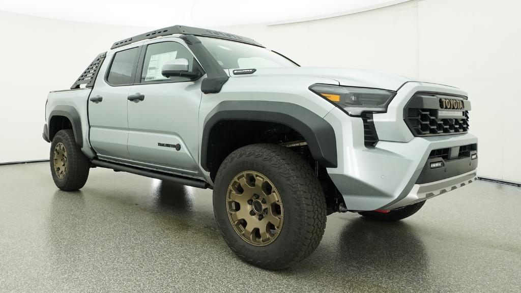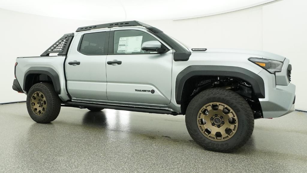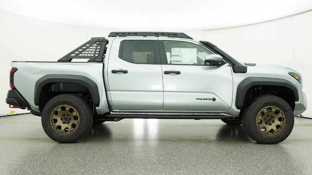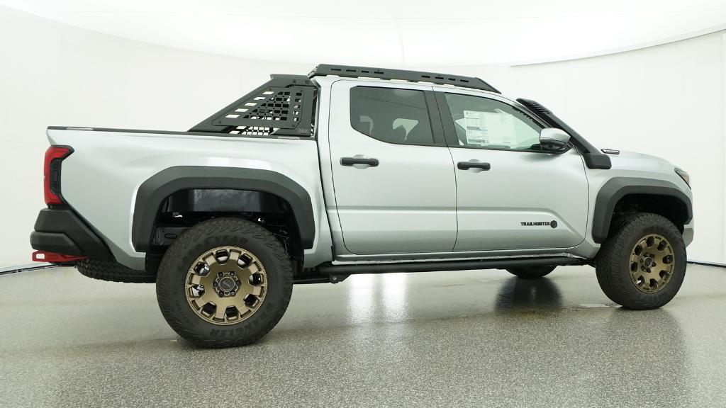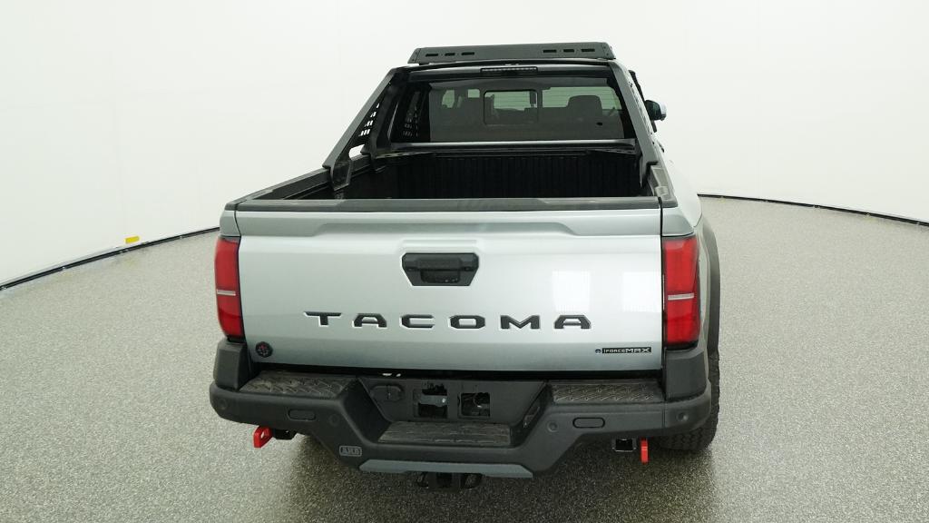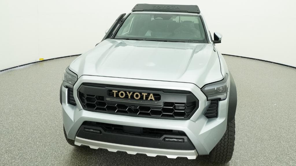 2026 Toyota Tacoma Hybrid Trailhunter Celestial Silver Metallic 4WD 8-Speed Automatic 2.4L 4-Cylinder3.583 Axle Ratio, 4-Wheel Disc Brakes, 9 Speakers, ABS brakes, Air Conditioning, Alloy wheels, AM/FM radio: SiriusXM, Anti-whiplash front head restraints, Apple CarPlay/Android Auto, Auto High-beam Headlights, Auto-dimming Rear-View mirror, Automatic temperature control, Brake assist, Bumpers: body-color, Driver door bin, Driver vanity mirror, Dual front impact airbags, Dual front side impact airbags, Electronic Stability Control, Emergency communication system: Safety Connect (up to 10-year trial subscription), Exterior Parking Camera Rear, Four wheel independent suspension, Front anti-roll bar, Front Bucket Seats, Front Center Armrest, Front dual zone A/C, Front fog lights, Front reading lights, Fully automatic headlights, Garage door transmitter: HomeLink, Heated and Ventilated Front Bucket Seats, Heated door mirrors, Heated front seats, Heated steering wheel, Illuminated entry, JBL Premium Audio, Knee airbag, Leather Shift Knob, Leather steering wheel, Low tire pressure warning, Navigation system: Drive Connect Cloud Navigation (1-year trial subscription), Occupant sensing airbag, Outside temperature display, Overhead airbag, Overhead console, Panic alarm, Passenger door bin, Passenger vanity mirror, Power door mirrors, Power driver seat, Power passenger seat, Power steering, Power windows, Radio: 14 Toyota Audio Multimedia, Rear anti-roll bar, Rear step bumper, Rear window defroster, Remote keyless entry, Security system, SofTex Seat Trim, Speed control, Speed-sensing steering, Split folding rear seat, Steering wheel mounted audio controls, Tachometer, Telescoping steering wheel, Tilt steering wheel, Traction control, Trip computer, Turn signal indicator mirrors, Variably intermittent wipers, Ventilated front seats, Wheels: 18 Bronze-Finished Trailhunter Alloy.