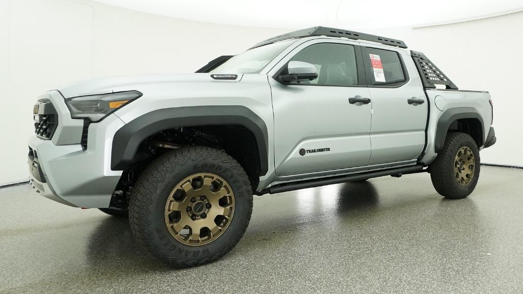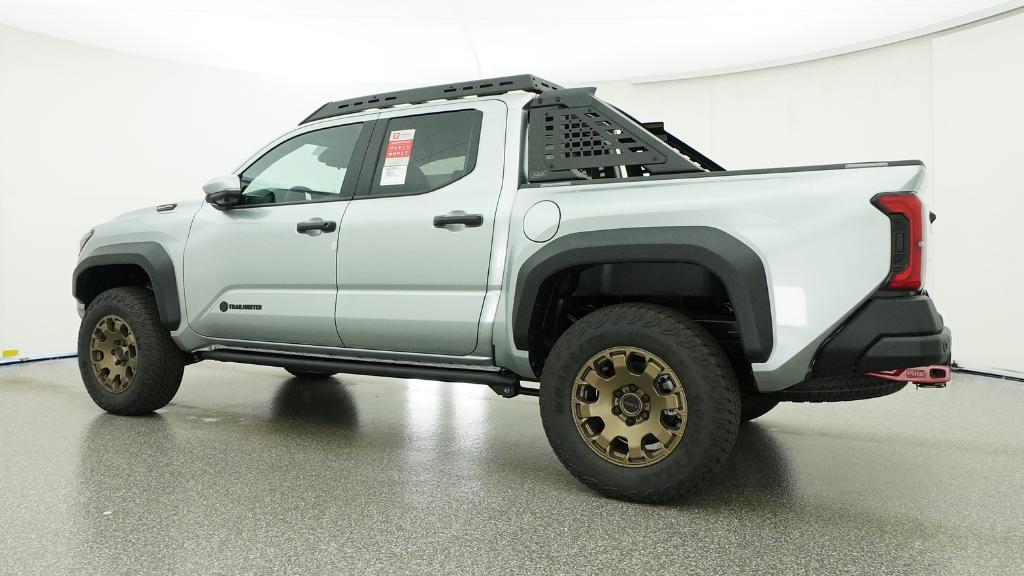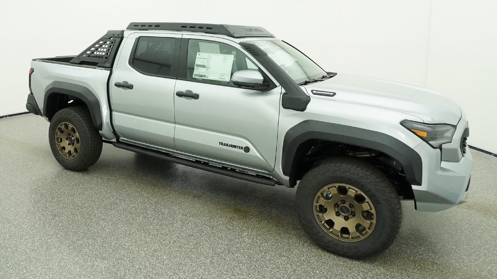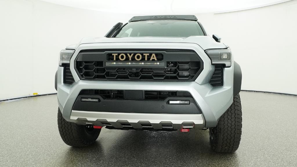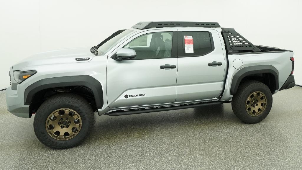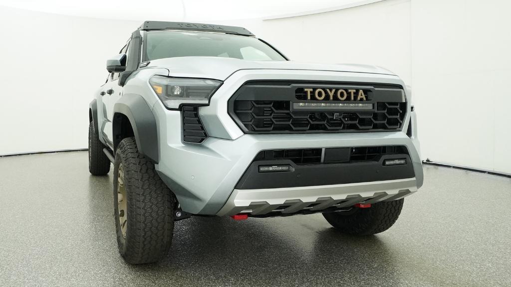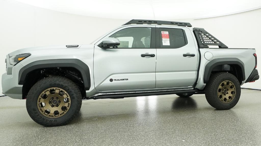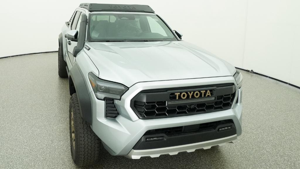 2026 Toyota Tacoma Hybrid Trailhunter Celestial Silver Metallic 4WD 8-Speed Automatic 2.4L 4-Cylinder3.583 Axle Ratio, 4-Wheel Disc Brakes, 9 Speakers, ABS brakes, Air Conditioning, Alloy wheels, AM/FM radio: SiriusXM, Anti-whiplash front head restraints, Apple CarPlay/Android Auto, Auto High-beam Headlights, Auto-dimming Rear-View mirror, Automatic temperature control, Brake assist, Bumpers: body-color, Driver door bin, Driver vanity mirror, Dual front impact airbags, Dual front side impact airbags, Electronic Stability Control, Emergency communication system: Safety Connect (up to 10-year trial subscription), Exterior Parking Camera Rear, Four wheel independent suspension, Front anti-roll bar, Front Bucket Seats, Front Center Armrest, Front dual zone A/C, Front fog lights, Front reading lights, Fully automatic headlights, Garage door transmitter: HomeLink, Heated and Ventilated Front Bucket Seats, Heated door mirrors, Heated front seats, Heated steering wheel, Illuminated entry, JBL Premium Audio, Knee airbag, Leather Shift Knob, Leather steering wheel, Low tire pressure warning, Navigation system: Drive Connect Cloud Navigation (1-year trial subscription), Occupant sensing airbag, Outside temperature display, Overhead airbag, Overhead console, Panic alarm, Passenger door bin, Passenger vanity mirror, Power door mirrors, Power driver seat, Power passenger seat, Power steering, Power windows, Radio: 14 Toyota Audio Multimedia, Rear anti-roll bar, Rear step bumper, Rear window defroster, Remote keyless entry, Security system, SofTex Seat Trim, Speed control, Speed-sensing steering, Split folding rear seat, Steering wheel mounted audio controls, Tachometer, Telescoping steering wheel, Tilt steering wheel, Traction control, Trip computer, Turn signal indicator mirrors, Variably intermittent wipers, Ventilated front seats, Wheels: 18 Bronze-Finished Trailhunter Alloy.
