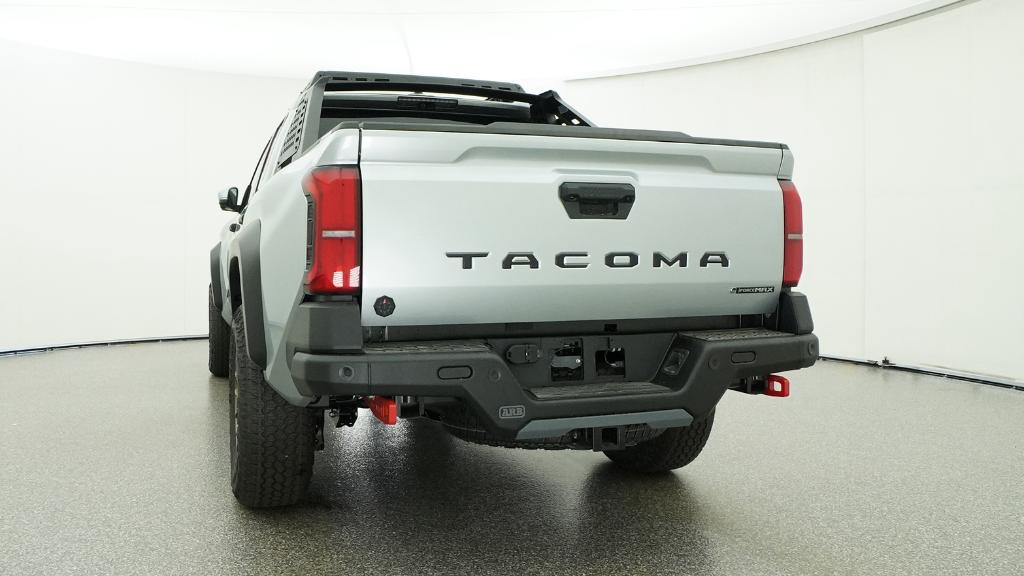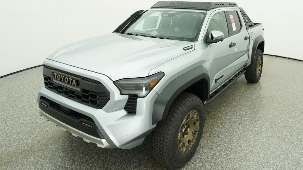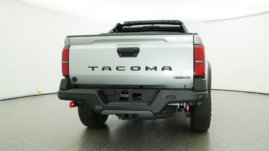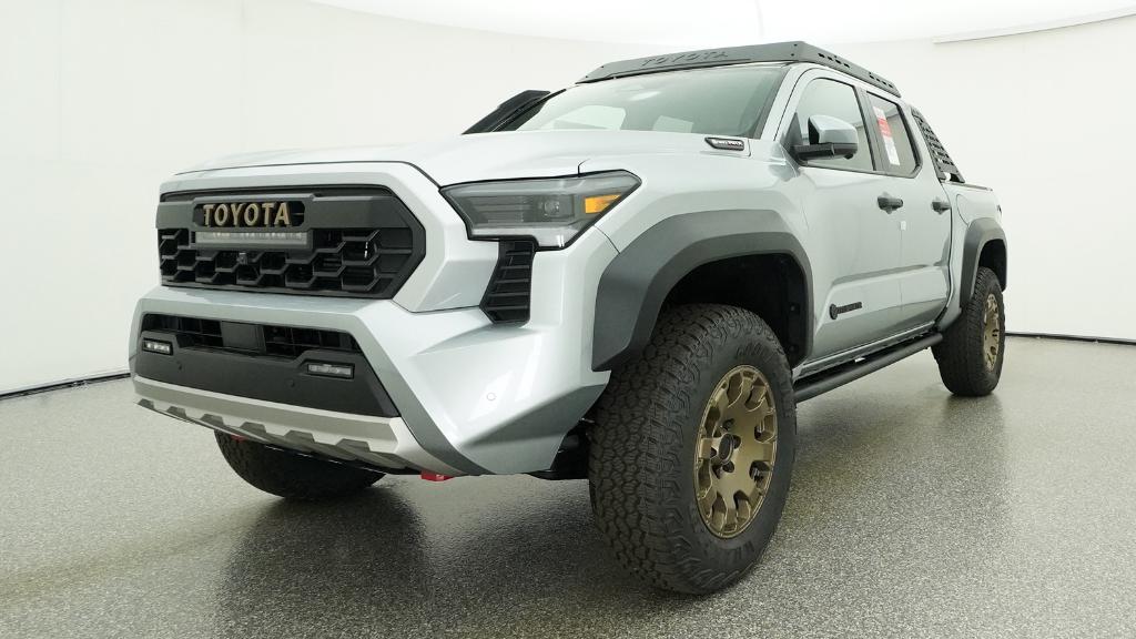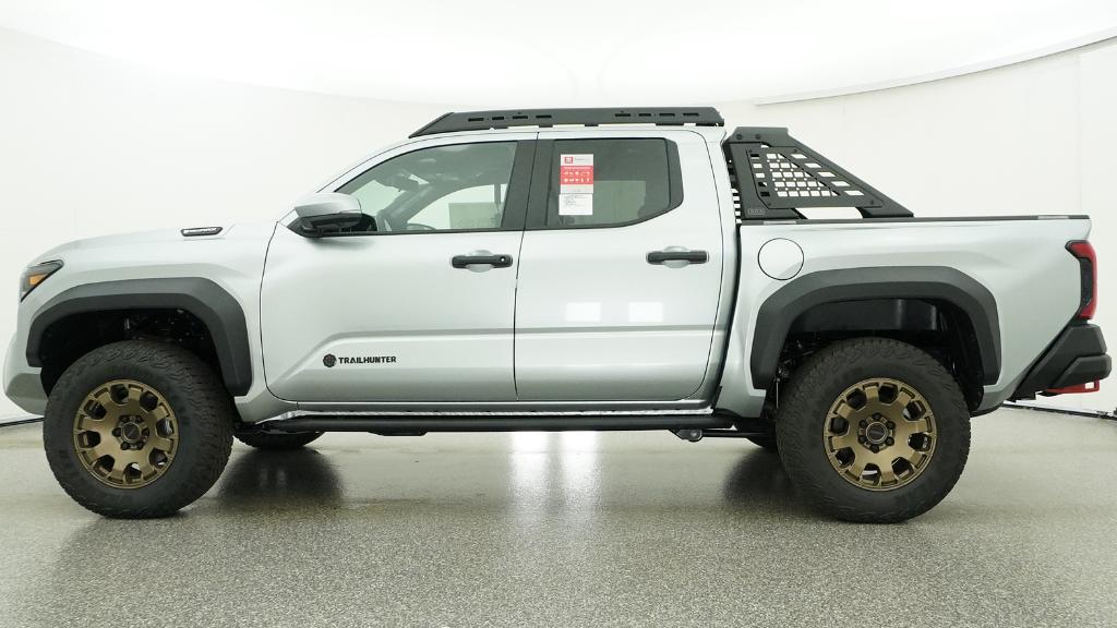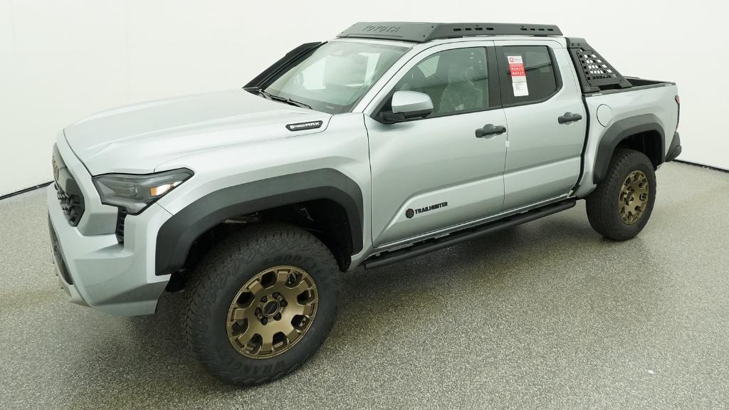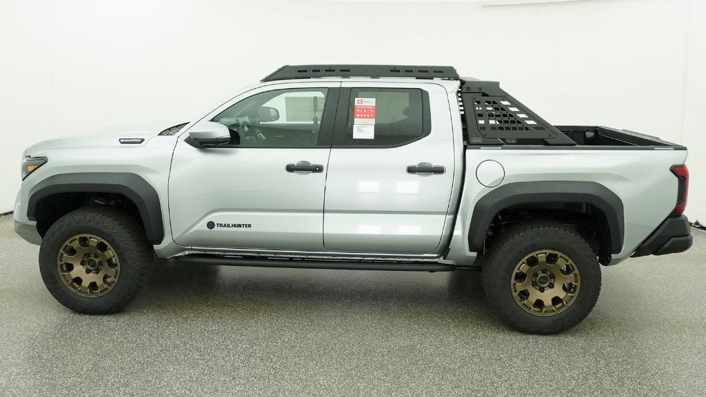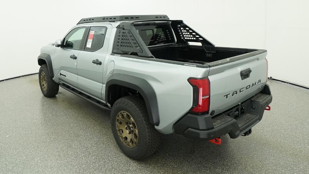 2026 Toyota Tacoma Hybrid Trailhunter Celestial Silver Metallic 4WD 8-Speed Automatic 2.4L 4-Cylinder3.583 Axle Ratio, 4-Wheel Disc Brakes, 9 Speakers, ABS brakes, Air Conditioning, Alloy wheels, AM/FM radio: SiriusXM, Anti-whiplash front head restraints, Apple CarPlay/Android Auto, Auto High-beam Headlights, Auto-dimming Rear-View mirror, Automatic temperature control, Brake assist, Bumpers: body-color, Driver door bin, Driver vanity mirror, Dual front impact airbags, Dual front side impact airbags, Electronic Stability Control, Emergency communication system: Safety Connect (up to 10-year trial subscription), Exterior Parking Camera Rear, Four wheel independent suspension, Front anti-roll bar, Front Bucket Seats, Front Center Armrest, Front dual zone A/C, Front fog lights, Front reading lights, Fully automatic headlights, Garage door transmitter: HomeLink, Heated and Ventilated Front Bucket Seats, Heated door mirrors, Heated front seats, Heated steering wheel, Illuminated entry, JBL Premium Audio, Knee airbag, Leather Shift Knob, Leather steering wheel, Low tire pressure warning, Navigation system: Drive Connect Cloud Navigation (1-year trial subscription), Occupant sensing airbag, Outside temperature display, Overhead airbag, Overhead console, Panic alarm, Passenger door bin, Passenger vanity mirror, Power door mirrors, Power driver seat, Power passenger seat, Power steering, Power windows, Radio: 14 Toyota Audio Multimedia, Rear anti-roll bar, Rear step bumper, Rear window defroster, Remote keyless entry, Security system, SofTex Seat Trim, Speed control, Speed-sensing steering, Split folding rear seat, Steering wheel mounted audio controls, Tachometer, Telescoping steering wheel, Tilt steering wheel, Traction control, Trip computer, Turn signal indicator mirrors, Variably intermittent wipers, Ventilated front seats, Wheels: 18 Bronze-Finished Trailhunter Alloy.