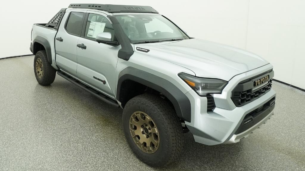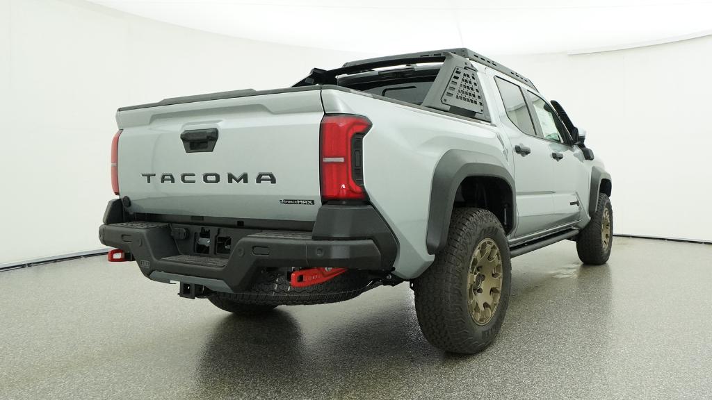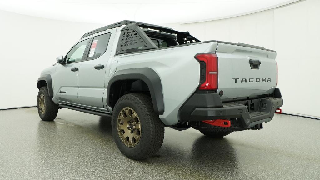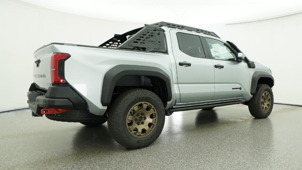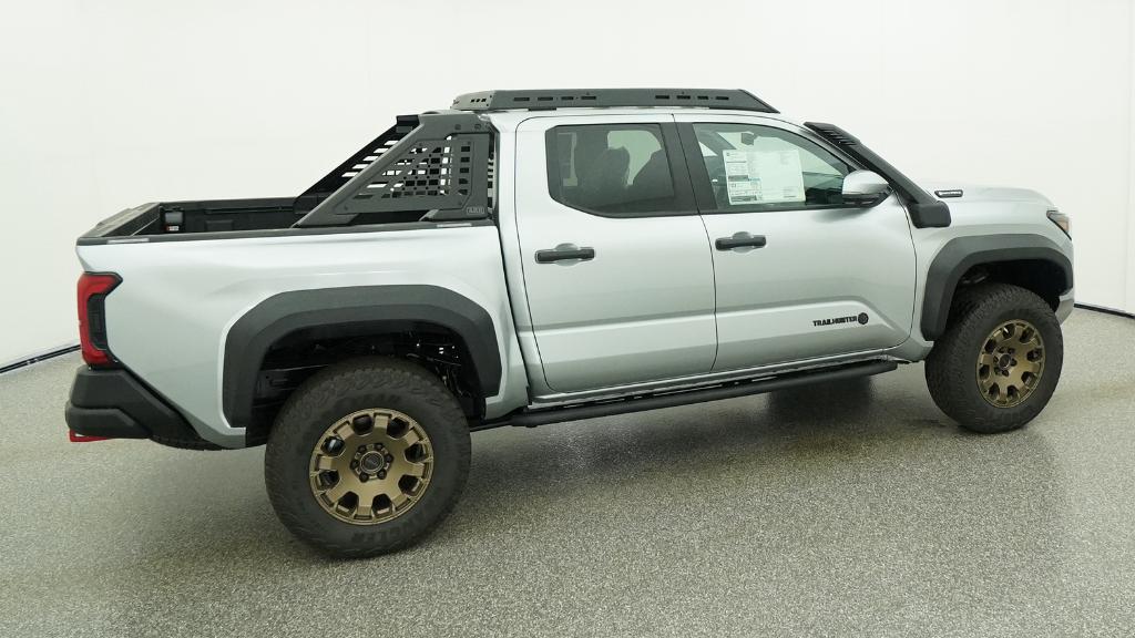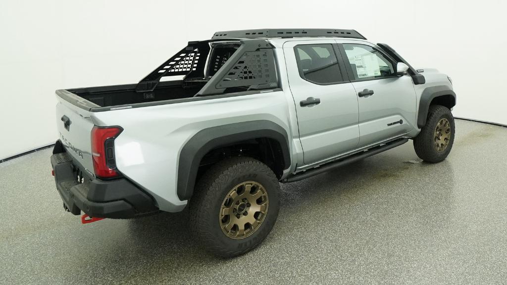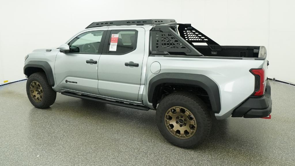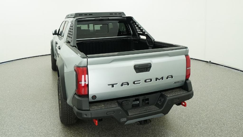 2026 Toyota Tacoma Hybrid Trailhunter Celestial Silver Metallic 4WD 8-Speed Automatic 2.4L 4-Cylinder3.583 Axle Ratio, 4-Wheel Disc Brakes, 9 Speakers, ABS brakes, Air Conditioning, Alloy wheels, AM/FM radio: SiriusXM, Anti-whiplash front head restraints, Apple CarPlay/Android Auto, Auto High-beam Headlights, Auto-dimming Rear-View mirror, Automatic temperature control, Brake assist, Bumpers: body-color, Driver door bin, Driver vanity mirror, Dual front impact airbags, Dual front side impact airbags, Electronic Stability Control, Emergency communication system: Safety Connect (up to 10-year trial subscription), Exterior Parking Camera Rear, Four wheel independent suspension, Front anti-roll bar, Front Bucket Seats, Front Center Armrest, Front dual zone A/C, Front fog lights, Front reading lights, Fully automatic headlights, Garage door transmitter: HomeLink, Heated and Ventilated Front Bucket Seats, Heated door mirrors, Heated front seats, Heated steering wheel, Illuminated entry, JBL Premium Audio, Knee airbag, Leather Shift Knob, Leather steering wheel, Low tire pressure warning, Navigation system: Drive Connect Cloud Navigation (1-year trial subscription), Occupant sensing airbag, Outside temperature display, Overhead airbag, Overhead console, Panic alarm, Passenger door bin, Passenger vanity mirror, Power door mirrors, Power driver seat, Power passenger seat, Power steering, Power windows, Radio: 14 Toyota Audio Multimedia, Rear anti-roll bar, Rear step bumper, Rear window defroster, Remote keyless entry, Security system, SofTex Seat Trim, Speed control, Speed-sensing steering, Split folding rear seat, Steering wheel mounted audio controls, Tachometer, Telescoping steering wheel, Tilt steering wheel, Traction control, Trip computer, Turn signal indicator mirrors, Variably intermittent wipers, Ventilated front seats, Wheels: 18 Bronze-Finished Trailhunter Alloy.
