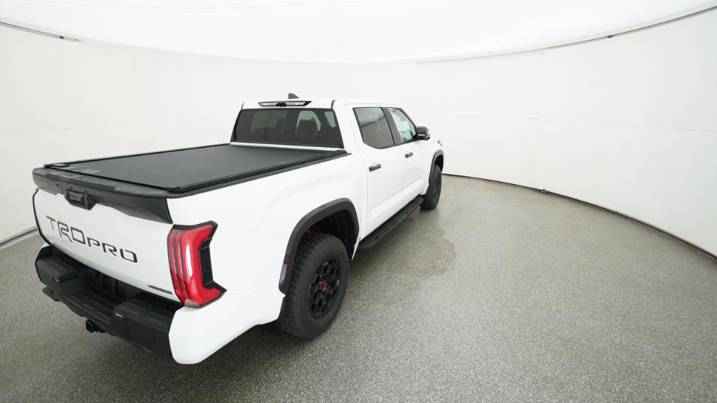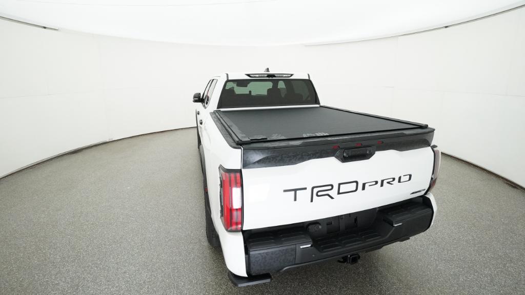 - "TRD PRO" hood badge; black door handles; black window molding and mirror caps; black technical-camo-grained tailgate spoiler and overfenders with marker lights