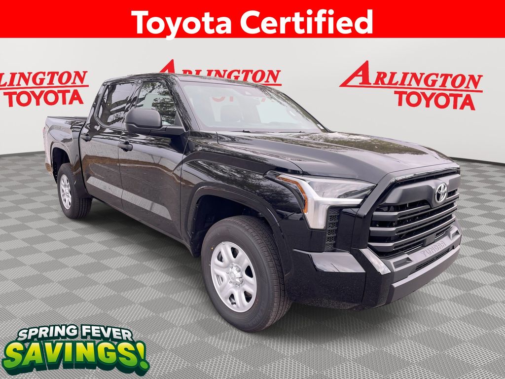 CERTIFIED BY CARFAX - ONE OWNER, REMAINDER OF FACTORY WARRANTY STILL APPLIES, BACKUP CAMERA, BLUETOOTH HANDS FREE, ANDROID AUTO, APPLE CARPLAY, 4X4/FOUR WHEEL DRIVE, BED LINER, LOCAL TRADE IN, PUSH BUTTON START, LANE DEPARTURE, ADAPTIVE CRUISE CONTROL, NON SMOKER, Tundra SR 4X4, Toyota Gold Certified Certified, 4D CrewMax, 3.4L V6, 10-Speed Automatic, 4WD, Midnight Black Metallic, Black Cloth, ABS brakes, Fully automatic headlights, Low tire pressure warning, Steering wheel mounted audio controls, 18" Styled Steel Wheels, 3.31 Axle Ratio, 4-Way Manual Front Seats, 4-Wheel Disc Brakes, 9 Speakers, Air Conditioning, AM/FM radio: SiriusXM, Apple CarPlay/Android Auto, Auto High-beam Headlights, Automatic temperature control, Brake assist, Bumpers: body-color, Delay-off headlights, Driver door bin, Driver vanity mirror, Dual front impact airbags, Dual front side impact airbags, Electronic Stability Control, Exterior Parking Camera Rear, Fabric Seat Trim, Front anti-roll bar, Front Bucket Seats, Front Center Armrest, Front reading lights, Front wheel independent suspension, Heated door mirrors, Illuminated entry, Knee airbag, Occupant sensing airbag, Outside temperature display, Overhead airbag, Overhead console, Panic alarm, Passenger door bin, Passenger vanity mirror, Power door mirrors, Power steering, Power windows, Radio data system, Radio: Audio Multimedia System, Rear reading lights, Rear step bumper, Rear window defroster, Remote keyless entry, Safety Connect, Security system, Speed control, Speed-sensing steering, Split folding rear seat, SR Package, Tachometer, Telescoping steering wheel, Tilt steering wheel, Traction control, Trip computer, Variably intermittent wipers, Voltmeter, Tundra SR 4X4, 4D CrewMax, 3.4L V6, 10-Speed Automatic, 4WD, Midnight Black Metallic, Black Cloth, ABS brakes, Fully automatic headlights, Low tire pressure warning, Steering wheel mounted audio controls.