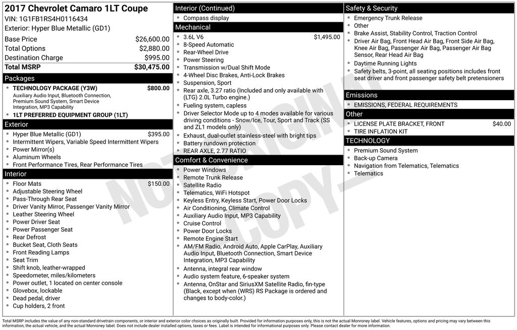 BACKUP CAMERA, BLUETOOTH HANDS FREE, ANDROID AUTO, APPLE CARPLAY, POWER SEATS, LOCAL TRADE IN, PUSH BUTTON START, CRUISE CONTROL, NON SMOKER, Camaro 1LT, 2D Coupe, 3.6L V6 DI, 8-Speed Automatic, RWD, Hyper Blue Metallic, Black Cloth, ABS brakes, Electronic Stability Control, Fully automatic headlights, Low tire pressure warning, Remote Vehicle Starter System, Steering wheel mounted audio controls, 18" Silver-Painted Aluminum Wheels, 2 USB Ports & Auxiliary Input Jack, 2.77 Rear Axle Ratio, 4-Wheel Disc Brakes, 6 Speakers, 6-Speaker Audio System Feature, Air Conditioning, All-Weather Floor Mats, Alloy wheels, AM/FM radio: SiriusXM, Apple CarPlay/Android Auto, Automatic temperature control, Bose Premium 9-Speaker Audio System Feature, Brake assist, Bumpers: body-color, Cloth Seat Trim, Compass, Delay-off headlights, Driver door bin, Driver vanity mirror, Dual front impact airbags, Dual front side impact airbags, Emergency communication system, Exterior Parking Camera Rear, Four wheel independent suspension, Front anti-roll bar, Front Bucket Seats, Front Center Armrest, Front fog lights, Front License Plate Bracket, Front reading lights, Front Sport Bucket Seats, Illuminated entry, Knee airbag, Leather Shift Knob, Occupant sensing airbag, Overhead airbag, Panic alarm, Passenger door bin, Passenger vanity mirror, Power door mirrors, Power driver seat, Power passenger seat, Power steering, Power windows, Preferred Equipment Group 1LT, Premium audio system: Chevrolet MyLink, Radio data system, Radio: AM/FM w/Chevrolet MyLink, Radio: Chevrolet MyLink Audio System, Rear anti-roll bar, Rear window defroster, Remote keyless entry, Security system, SiriusXM Satellite Radio, Speed control, Speed-sensing steering, Tachometer, Technology Package, Telescoping steering wheel, Tilt steering wheel, Tire Inflation Kit, Traction control, Trip computer, Variably intermittent wipers, Voltmeter, Camaro 1LT, 2D Coupe, 3.6L V6 DI, 8-Speed Automatic, RWD, Hyper Blue Metallic, Black Cloth, ABS brakes, Electronic Stability Control, Fully automatic headlights, Low tire pressure warning, Remote Vehicle Starter System, Steering wheel mounted audio controls.
