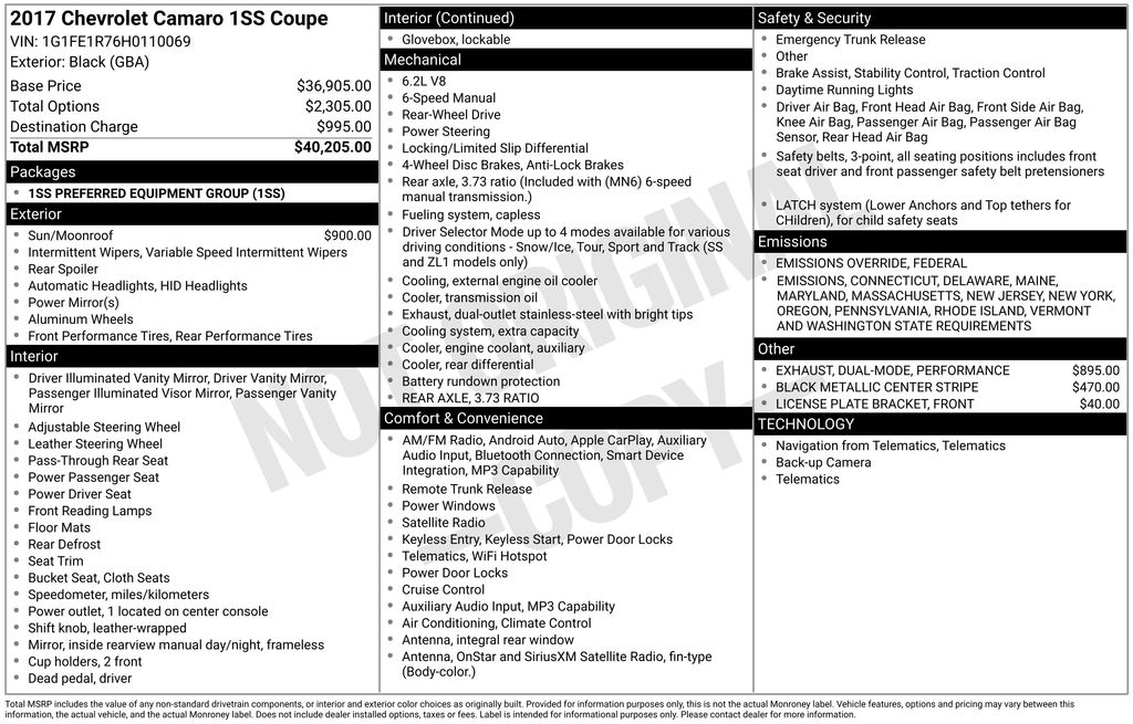 BACKUP CAMERA, BLUETOOTH HANDS FREE, POWER SEATS, LOCAL TRADE IN, PUSH BUTTON START, CRUISE CONTROL, NON SMOKER, Camaro SS 1SS, 2D Coupe, 6.2L V8, RWD, Black, Jet Black Cloth, ABS brakes, Electronic Stability Control, Four wheel independent suspension, Fully automatic headlights, Low tire pressure warning, Remote keyless entry, Steering wheel mounted audio controls, 2 USB Ports & Auxiliary Input Jack, 4-Wheel Disc Brakes, 6 Speakers, 6-Speaker Audio System Feature, Air Conditioning, Alloy wheels, AM/FM radio: SiriusXM, Apple CarPlay/Android Auto, Automatic temperature control, Brake assist, Bumpers: body-color, Cloth Seat Trim, Compass, Delay-off headlights, Driver door bin, Driver vanity mirror, Dual front impact airbags, Dual front side impact airbags, Emergency communication system, Exterior Parking Camera Rear, Front anti-roll bar, Front Bucket Seats, Front Center Armrest, Front fog lights, Front reading lights, Front Sport Bucket Seats, High-Intensity Discharge Headlights, Illuminated entry, Knee airbag, Leather Shift Knob, Occupant sensing airbag, Overhead airbag, Panic alarm, Passenger door bin, Passenger vanity mirror, Power door mirrors, Power driver seat, Power passenger seat, Power steering, Power windows, Preferred Equipment Group 1SS, Premium audio system: Chevrolet MyLink, Radio data system, Radio: Chevrolet MyLink Audio System, Rear anti-roll bar, Rear window defroster, Security system, SiriusXM Satellite Radio, Speed control, Speed-sensing steering, Spoiler, Tachometer, Telescoping steering wheel, Tilt steering wheel, Traction control, Trip computer, Variably intermittent wipers, Voltmeter, Wheels: 20" x 8.5" Fr & 20" x 9.5" Rr 5-Spoke Alum, Camaro SS 1SS, 2D Coupe, 6.2L V8, RWD, Black, Jet Black Cloth, ABS brakes, Electronic Stability Control, Four wheel independent suspension, Fully automatic headlights, Low tire pressure warning, Remote keyless entry, Steering wheel mounted audio controls.
