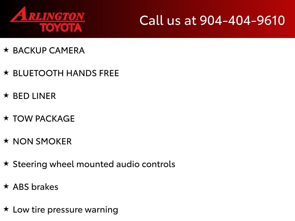 BACKUP CAMERA, BLUETOOTH HANDS FREE, BED LINER, TOW PACKAGE, NON SMOKER, Tacoma SR5 V6, 4D Double Cab, V6, 6-Speed Automatic, RWD, Super White, Cement Gray Cloth, ABS brakes, Electronic Stability Control, Low tire pressure warning, Steering wheel mounted audio controls, 130 Amp Alternator, 16" Silver Alloy Wheels, 6 Speakers, Air Conditioning, Alloy wheels, AM/FM radio: SiriusXM, Anti-whiplash front head restraints, ATF Cooler, Auto-dimming Rear-View mirror, Axle Ratio: 3.91, Brake assist, Bumpers: body-color, CD player, Class IV Hitch Receiver, Compass, Driver door bin, Dual front impact airbags, Dual front side impact airbags, Engine Oil Cooler, Exterior Parking Camera Rear, Fabric Seat Trim (FC), Front anti-roll bar, Front Bucket Seats, Front Center Armrest, Front fog lights, Front reading lights, Front wheel independent suspension, Illuminated entry, Knee airbag, Occupant sensing airbag, Outside temperature display, Overhead airbag, Overhead console, Panic alarm, Passenger door bin, Power door mirrors, Power steering, Power Steering Cooler, Power windows, Radio: Entune Plus AM/FM/CD w/Connected Navigation, Radio: Entune Premium w/AM/FM/CD/Nav/App Suite, Rear Parking Assist Sonar, Rear step bumper, Remote keyless entry, Speed control, Speed-sensing steering, Split folding rear seat, SR5 Parking Sonar & Navigation, Tachometer, Telescoping steering wheel, Tilt steering wheel, Tow Package, Traction control, Trailer Sway Control, Trip computer, Variably intermittent wipers, Tacoma SR5 V6, 4D Double Cab, V6, 6-Speed Automatic, RWD, Super White, Cement Gray Cloth, ABS brakes, Electronic Stability Control, Low tire pressure warning, Steering wheel mounted audio controls.