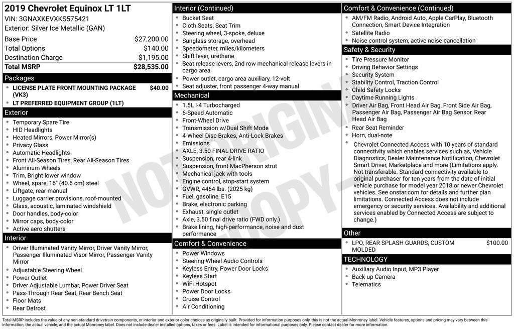 BACKUP CAMERA, BLUETOOTH HANDS FREE, LOCAL TRADE IN, PUSH BUTTON START, CRUISE CONTROL, NON SMOKER, Equinox LT, 4D Sport Utility, 1.5L DOHC, 6-Speed Automatic Electronic with Overdrive, FWD, Silver Ice Metallic, Jet Black Cloth, ABS brakes, Electronic Stability Control, Four wheel independent suspension, Fully automatic headlights, Low tire pressure warning, Steering wheel mounted audio controls, 17" Aluminum Wheels, 2 Rear USB Charging-Only Ports, 2 USB Ports & Auxiliary Input Jack, 2-Way Power Driver Lumbar Control Seat Adjuster, 3.50 Final Drive Axle Ratio, 4-Wheel Disc Brakes, 6 Speaker Audio System Feature, 6 Speakers, 8-Way Power Driver Seat Adjuster, Air Conditioning, Alloy wheels, AM/FM radio: SiriusXM, Apple CarPlay/Android Auto, Bluetooth® For Phone, Brake assist, Bumpers: body-color, Compass, Custom Molded Rear Splash Guards (LPO), Delay-off headlights, Driver door bin, Driver vanity mirror, Dual front impact airbags, Dual front side impact airbags, Front anti-roll bar, Front Bucket Seats, Front Center Armrest, Front Passenger 4-Way Manual Seat Adjuster, Front reading lights, Heated door mirrors, High-Intensity Discharge Headlights, Illuminated entry, Occupant sensing airbag, Outside temperature display, Overhead airbag, Overhead console, Panic alarm, Passenger door bin, Passenger vanity mirror, Power door mirrors, Power driver seat, Power steering, Power windows, Preferred Equipment Group 1LT, Premium audio system: Chevrolet MyLink, Premium Cloth Seat Trim, Radio data system, Radio: Chevrolet Infotainment 3 System w/AM/FM, Rear anti-roll bar, Rear reading lights, Rear seat center armrest, Rear window defroster, Rear window wiper, Remote keyless entry, Security system, SiriusXM Radio, Speed control, Speed-sensing steering, Split folding rear seat, Spoiler, Tachometer, Telescoping steering wheel, Tilt steering wheel, Traction control, Trip computer, Variably intermittent wipers, Equinox LT, 4D Sport Utility, 1.5L DOHC, 6-Speed Automatic Electronic with Overdrive, FWD, Silver Ice Metallic, Jet Black Cloth, ABS brakes, Electronic Stability Control, Four wheel independent suspension, Fully automatic headlights, Low tire pressure warning, Steering wheel mounted audio controls.