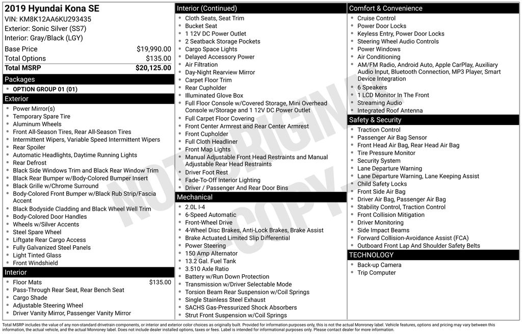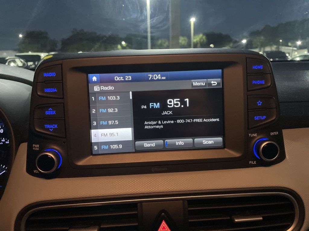 BACKUP CAMERA, BLUETOOTH HANDS FREE, LOCAL TRADE IN, CRUISE CONTROL, NON SMOKER, Kona SE, 4D Sport Utility, I4, 6-Speed Automatic with Shiftronic, FWD, Sonic Silver, Black Cloth, ABS brakes, Electronic Stability Control, Front wheel independent suspension, Fully automatic headlights, Steering wheel mounted audio controls, 16" Alloy Wheels, 3.510 Axle Ratio, 4-Wheel Disc Brakes, 6 Speakers, Air Conditioning, Alloy wheels, AM/FM radio, Apple CarPlay & Android Auto, Brake assist, Bumpers: body-color, Carpeted Floor Mats, Cloth Seat Trim, Delay-off headlights, Driver door bin, Driver vanity mirror, Dual front impact airbags, Dual front side impact airbags, Exterior Parking Camera Rear, Front anti-roll bar, Front Bucket Seats, Front Center Armrest, Front reading lights, Illuminated entry, Low tire pressure warning, Occupant sensing airbag, Option Group 01, Overhead airbag, Overhead console, Panic alarm, Passenger door bin, Passenger vanity mirror, Power door mirrors, Power steering, Power windows, Radio: AM/FM Audio System, Rear seat center armrest, Rear window defroster, Rear window wiper, Remote keyless entry, Security system, Speed control, Speed-sensing steering, Split folding rear seat, Spoiler, Tachometer, Telescoping steering wheel, Tilt steering wheel, Traction control, Trip computer, Variably intermittent wipers, Kona SE, 4D Sport Utility, I4, 6-Speed Automatic with Shiftronic, FWD, Sonic Silver, Black Cloth, ABS brakes, Electronic Stability Control, Front wheel independent suspension, Fully automatic headlights, Steering wheel mounted audio controls.