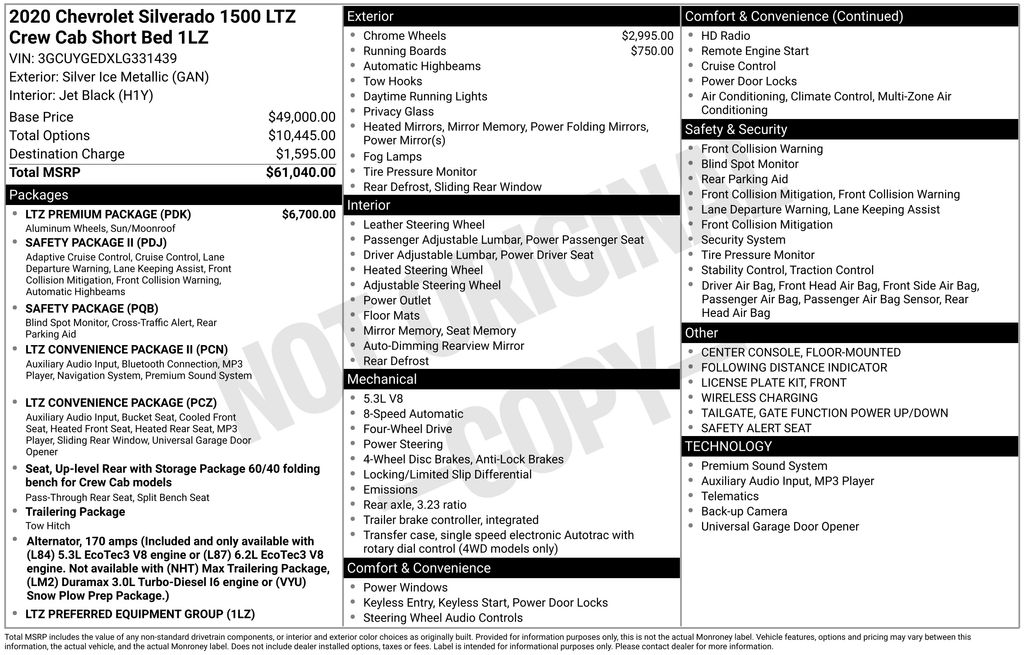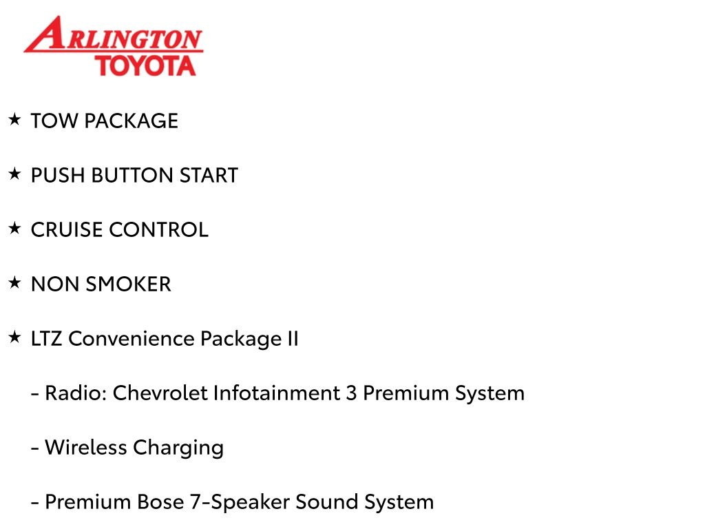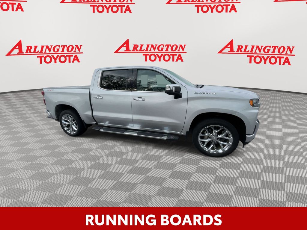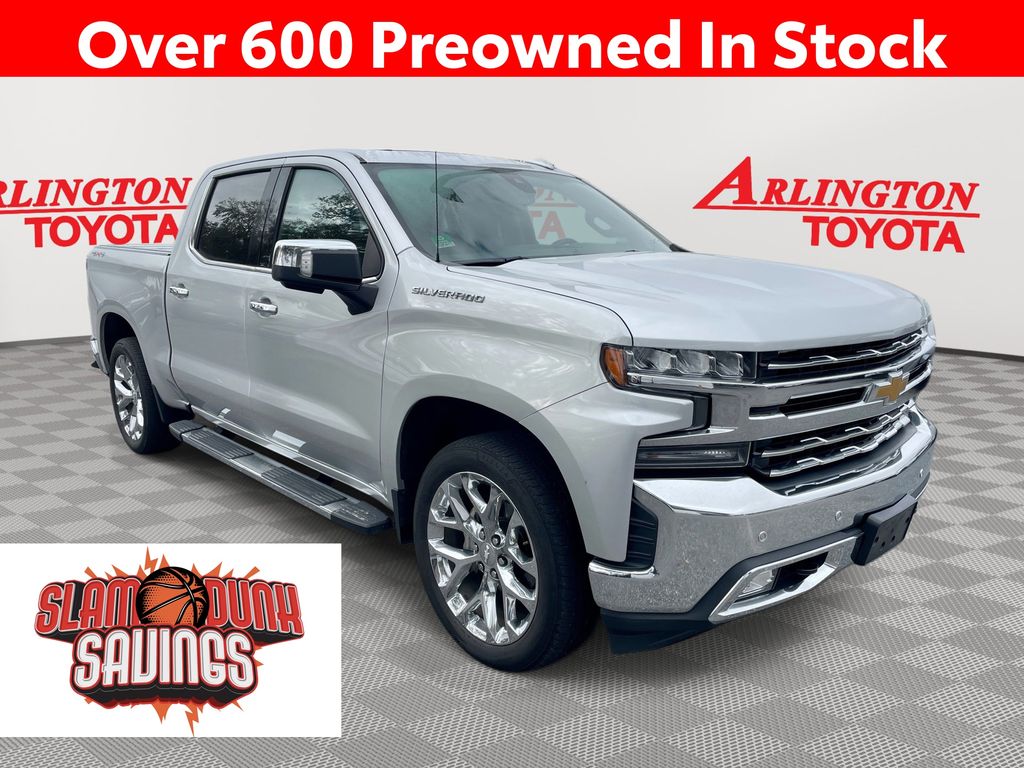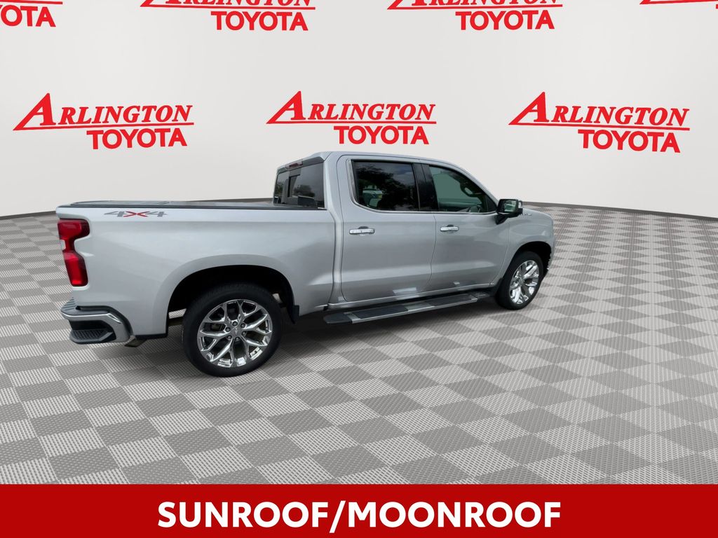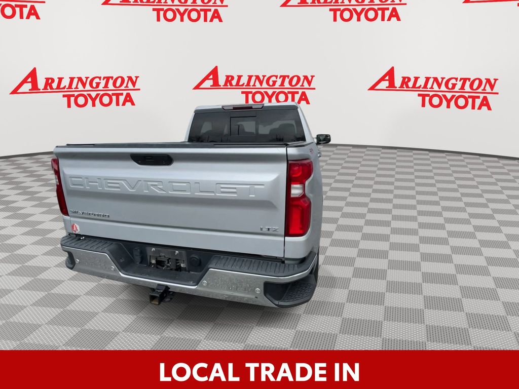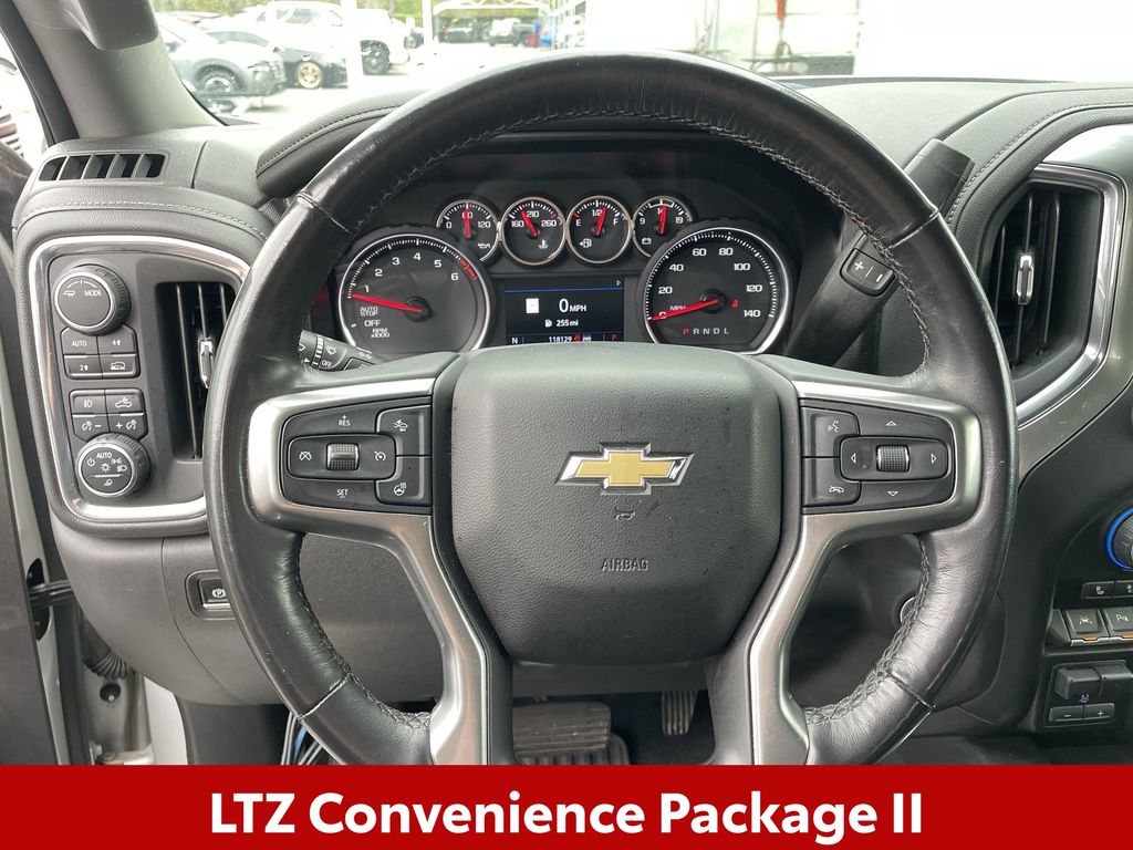 BACKUP CAMERA, BLUETOOTH HANDS FREE, ANDROID AUTO, APPLE CARPLAY, 4X4/FOUR WHEEL DRIVE, LOCAL TRADE IN, SUNROOF/MOONROOF, RUNNING BOARDS, TOW PACKAGE, PUSH BUTTON START, CRUISE CONTROL, NON SMOKER, Silverado 1500 LTZ 4X4, 4D Crew Cab, EcoTec3 5.3L V8, 8-Speed Automatic, 4WD, Silver Ice Metallic, Jet Black Leather, ABS brakes, Electronic Stability Control, Fully automatic headlights, Low tire pressure warning, LTZ Convenience Package, LTZ Convenience Package II, LTZ Premium Package, Power Sunroof, Safety Package, Safety Package II, Steering Wheel Mounted Electronic Cruise Control, 10-Way Power Driver Seat w/Lumbar, 10-Way Power Passenger Seat Adjuster w/Lumbar, 12-Volt Rear Auxiliary Power Outlet, 120-Volt Bed Mounted Power Outlet, 120-Volt Instrument Panel Power Outlet, 170 Amps Alternator, 2 USB Ports (First Row), 2nd Row Heated Outboard Seats, 3.23 Rear Axle Ratio, 4-Wheel Disc Brakes, 4.2" Diagonal Color Display Driver Info Center, 40/20/40 Front Split-Bench Seat, 4G LTE Wi-Fi Hot Spot Capable, 6 Speakers, 6-Speaker Audio System, 6" Rectangular Chromed Tubular Assist Steps (LPO), Adaptive Cruise Control - Camera, Advanced Trailering System, Air Conditioning, Alloy wheels, AM/FM radio: SiriusXM with 360L, Apple CarPlay/Android Auto, Auto-dimming door mirrors, Auto-Dimming Inside Rear-View Mirror, Auto-dimming Rear-View mirror, Automatic Emergency Braking, Automatic temperature control, Auxiliary External Transmission Oil Cooler, Bluetooth® For Phone, Brake assist, Bumpers: chrome, Chevrolet Connected Access Capable, Chrome Grille, Chrome Mirror Caps, Color-Keyed Carpeting Floor Covering, Compass, Deep-Tinted Glass, Delay-off headlights, Driver door bin, Driver Memory, Driver vanity mirror, Dual front impact airbags, Dual front side impact airbags, Electric Rear-Window Defogger, Electrical Lock Control Steering Column, EZ Lift Power Lock & Release Tailgate, Floor Mounted Center Console, Following Distance Indicator, Forward Collision Alert, Front anti-roll bar, Front Bucket Seats, Front Center Armrest w/Storage, Front dual zone A/C, Front fog lights, Front Frame-Mounted Black Recovery Hooks, Front LED Fog Lamps, Front License Plate Kit, Front Pedestrian Braking, Front reading lights, Front Rubberized Vinyl Floor Mats, HD Radio, HD Rear Vision Camera, Heated door mirrors, Heated Driver & Front Outboard Passenger Seats, Heated front seats, Heated Steering Wheel, Heated steering wheel, Heavy Duty Suspension, Heavy-Duty Rear Locking Differential, Hitch Guidance, Hitch Guidance w/Hitch View, Illuminated entry, Integrated Trailer Brake Controller, IntelliBeam Automatic High Beam On/Off, Keyless Open & Start, Lane Change Alert w/Side Blind Zone Alert, Lane Keep Assist w/Lane Departure Warning, Leather Wrapped Steering Wheel, LED Cargo Area Lighting, Manual Tilt/Telescoping Steering Column, Memory seat, Occupant sensing airbag, OnStar & Chevrolet Connected Services Capable, Outside Heated Power-Adjustable Mirrors, Outside temperature display, Overhead airbag, Overhead console, Panic alarm, Passenger door bin, Passenger vanity mirror, Perforated Leather-Appointed Front Seat Trim, Perimeter Lighting, Power Door Locks, Power door mirrors, Power driver seat, Power Front Passenger Windows w/Express Up/Down, Power Front Windows w/Driver Express Up/Down, Power passenger seat, Power Rear Windows w/Express Down, Power Sliding Rear Window w/Rear Defogger, Power steering, Power Tailgate, Power windows, Preferred Equipment Group 1LZ, Premium audio system: Chevrolet Infotainment 3 Plus, Premium Bose 7-Speaker Sound System, Radio data system, Radio: Chevrolet Infotainment 3 Plus System, Radio: Chevrolet Infotainment 3 Premium System, Rear Cross Traffic Alert, Rear Dual USB Charging-Only Ports, Rear reading lights, Rear Rubberized-Vinyl Floor Mats, Rear seat center armrest, Rear step bumper, Rear Wheelhouse Liners, Rear window defroster, Remote keyless entry, Remote Vehicle Starter System, Safety Alert Seat, Security system, SiriusXM w/360L, Speed