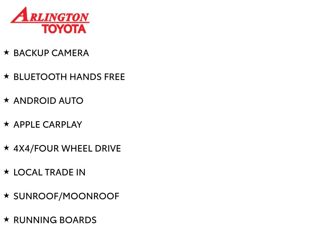 Prices do not include tax, tag, title, a pre-delivery service fee* of $894.00, an electronic registration filing fee* of $199.00 (*these charges represent costs and profits to the dealer for items such as inspecting, cleaning, and preparing documents related to the sale), and an Arlington Toyota Total Value Package of $1,889.00 (*these charges represent costs and profits to the dealer for items such as inspecting, cleaning, and preparing documents related to the sale). The final price is also subject to repair order reconditioning costs. Any price does not include dealer-installed accessories. All offers are mutually exclusive. All vehicles are subject to prior sale. See dealer for complete details.