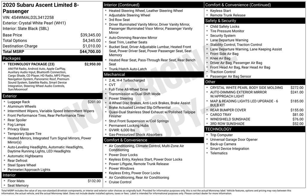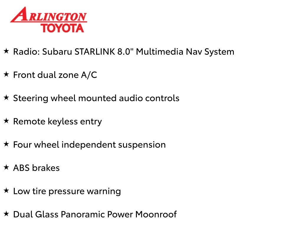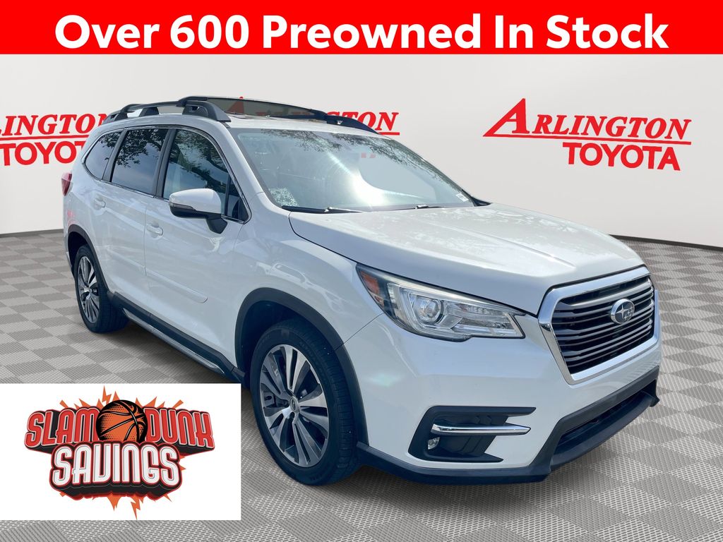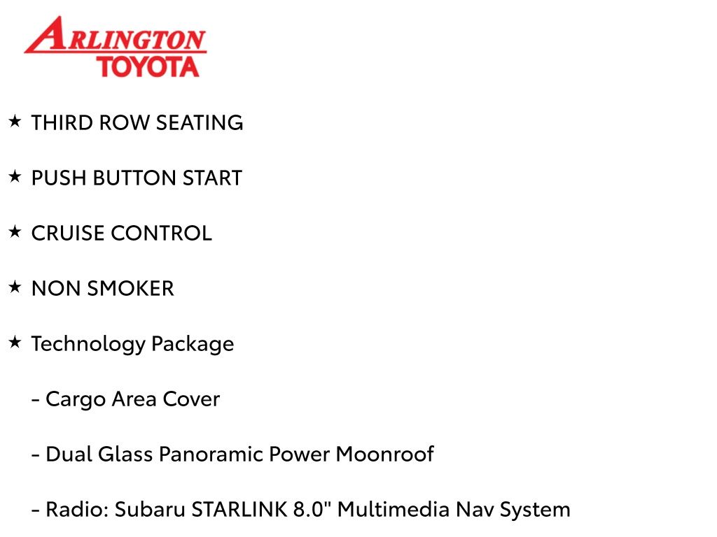 BACKUP CAMERA, BLUETOOTH HANDS FREE, ANDROID AUTO, APPLE CARPLAY, 4X4/FOUR WHEEL DRIVE, POWER SEATS, PANORAMIC MOONROOF, POWER LIFTGATE, THIRD ROW SEATING, PUSH BUTTON START, CRUISE CONTROL, NON SMOKER, Ascent Limited AWD, 4D Sport Utility, 2.4L DOHC, Lineartronic CVT, AWD, Crystal White Pearl, Black Leather, ABS brakes, Cargo Area Cover, Dual Glass Panoramic Power Moonroof, Electronic Stability Control, Four wheel independent suspension, Front dual zone A/C, Fully automatic headlights, Low tire pressure warning, Radio: Subaru STARLINK 8.0" Multimedia Nav System, Remote keyless entry, Steering wheel mounted audio controls, Technology Package, Turn signal indicator mirrors, 3rd row seats: bench, 3rd Row Sunshade, 4-Wheel Disc Brakes, 6 Speakers, Aero Crossbar Set, Air Conditioning, All-Weather Floor Liners, Alloy wheels, AM/FM radio: SiriusXM, Auto High-beam Headlights, Auto-Dimming Exterior Mirror w/Approach Light, Auto-dimming Rear-View mirror, Automatic temperature control, Axle Ratio: 4.44, Brake assist, Bumpers: body-color, Cargo Tray, CD player, Compass, Crystal White Pearl Body Side Molding, Delay-off headlights, Driver door bin, Driver vanity mirror, Dual front impact airbags, Dual front side impact airbags, Exterior Parking Camera Rear, Front anti-roll bar, Front Bucket Seats, Front Center Armrest, Front fog lights, Front reading lights, Garage door transmitter: HomeLink, Heated door mirrors, Heated Front Bucket Seats, Heated front seats, Heated rear seats, Heated steering wheel, Illuminated entry, Knee airbag, Map & Reading Lights LED Upgrade - 6 Bulb Kit, Memory seat, Occupant sensing airbag, Outside temperature display, Overhead airbag, Overhead console, Panic alarm, Passenger door bin, Passenger vanity mirror, Perforated Leather-Trimmed Upholstery, Power door mirrors, Power driver seat, Power Liftgate, Power passenger seat, Power steering, Power windows, Radio data system, Radio: Subaru STARLINK 8.0" Multimedia Plus System, Rear air conditioning, Rear anti-roll bar, Rear Bumper Cover, Rear reading lights, Rear seat center armrest, Rear window defroster, Rear window wiper, Reclining 3rd row seat, Security system, Speed control, Split folding rear seat, Spoiler, STARLINK/Apple CarPlay/Android Auto, Tachometer, Telescoping steering wheel, Tilt steering wheel, Traction control, Trip computer, Variably intermittent wipers, Wheels: 20" Dk Gray Aluminum Alloy w/Machine Finish, Windshield Sunshade, Ascent Limited AWD, 4D Sport Utility, 2.4L DOHC, Lineartronic CVT, AWD, Crystal White Pearl, Black Leather, ABS brakes, Cargo Area Cover, Dual Glass Panoramic Power Moonroof, Electronic Stability Control, Four wheel independent suspension, Front dual zone A/C, Fully automatic headlights, Low tire pressure warning, Radio: Subaru STARLINK 8.0" Multimedia Nav System, Remote keyless entry, Steering wheel mounted audio controls, Technology Package, Turn signal indicator mirrors.