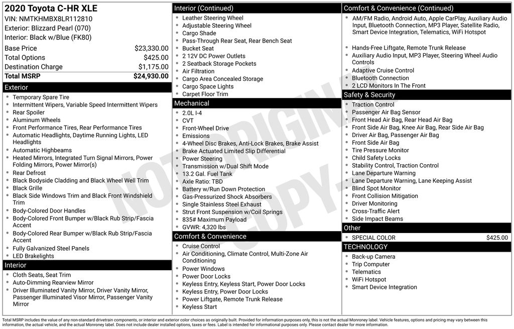 CERTIFIED BY CARFAX - ONE OWNER, BACKUP CAMERA, BLUETOOTH HANDS FREE, ANDROID AUTO, APPLE CARPLAY, CRUISE CONTROL, NON SMOKER, C-HR XLE, 4D Sport Utility, 2.0L I4 DOHC 16V, CVT, FWD, Blizzard Pearl, Black W/Blue Cloth, ABS brakes, Electronic Stability Control, Four wheel independent suspension, Front dual zone A/C, Fully automatic headlights, Low tire pressure warning, Remote keyless entry, Steering wheel mounted audio controls, 4-Wheel Disc Brakes, 6 Speakers, Air Conditioning, Alloy wheels, AM/FM radio: SiriusXM, Apple CarPlay/Android Auto, Auto High-beam Headlights, Auto-dimming Rear-View mirror, Automatic temperature control, Axle Ratio: TBD, Brake assist, Bumpers: body-color, Delay-off headlights, Driver door bin, Driver vanity mirror, Dual front impact airbags, Dual front side impact airbags, Exterior Parking Camera Rear, Fabric Seat Material, Front anti-roll bar, Front Bucket Seats, Front Center Armrest, Front reading lights, Heated door mirrors, Illuminated entry, Knee airbag, Leather Shift Knob, Occupant sensing airbag, Outside temperature display, Overhead airbag, Panic alarm, Passenger door bin, Passenger vanity mirror, Power door mirrors, Power Liftgate, Power steering, Power windows, Radio data system, Radio: AM/FM Stereo w/8" Touch-Screen Display, Rear anti-roll bar, Rear side impact airbag, Rear window defroster, Rear window wiper, Speed control, Speed-sensing steering, Split folding rear seat, Spoiler, Tachometer, Telescoping steering wheel, Tilt steering wheel, Traction control, Trip computer, Turn signal indicator mirrors, Variably intermittent wipers, Wheels: 7" x 18" Sport Alloy, C-HR XLE, 4D Sport Utility, 2.0L I4 DOHC 16V, CVT, FWD, Blizzard Pearl, Black W/Blue Cloth, ABS brakes, Electronic Stability Control, Four wheel independent suspension, Front dual zone A/C, Fully automatic headlights, Low tire pressure warning, Remote keyless entry, Steering wheel mounted audio controls.