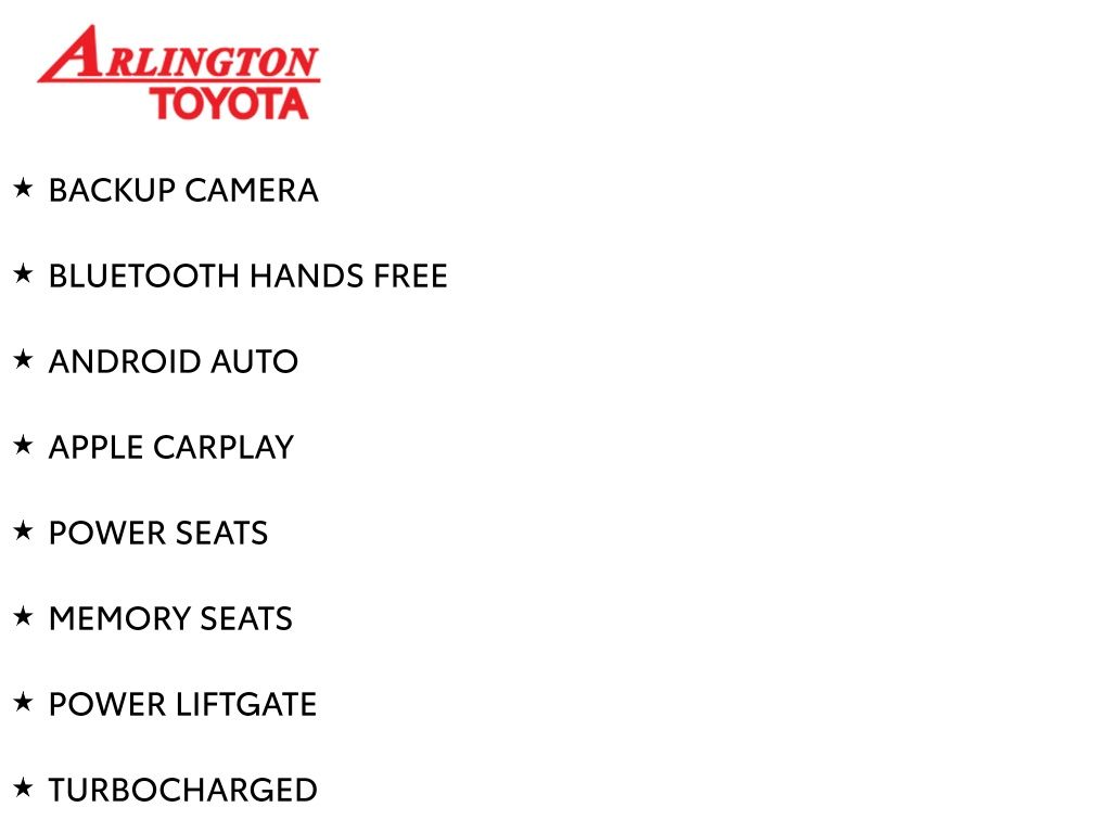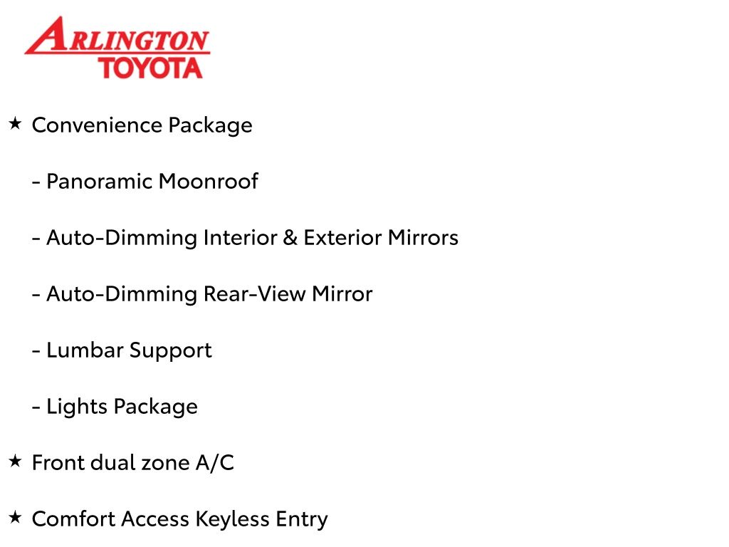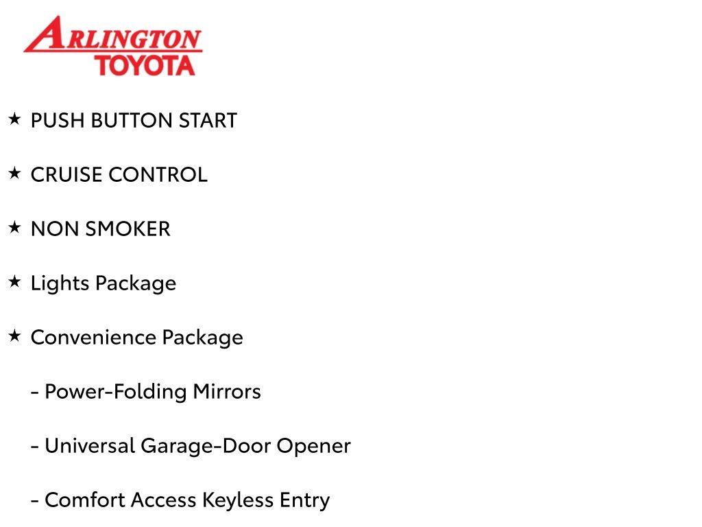 Prices do not include tax, tag, title, a pre-delivery service fee* of $894.00, an electronic registration filing fee* of $199.00 (*these charges represent costs and profits to the dealer for items such as inspecting, cleaning, and preparing documents related to the sale), and an Arlington Toyota Total Value Package of $1,889.00 (*these charges represent costs and profits to the dealer for items such as inspecting, cleaning, and preparing documents related to the sale). The final price is also subject to repair order reconditioning costs. Any price does not include dealer-installed accessories. All offers are mutually exclusive. All vehicles are subject to prior sale. See dealer for complete details.