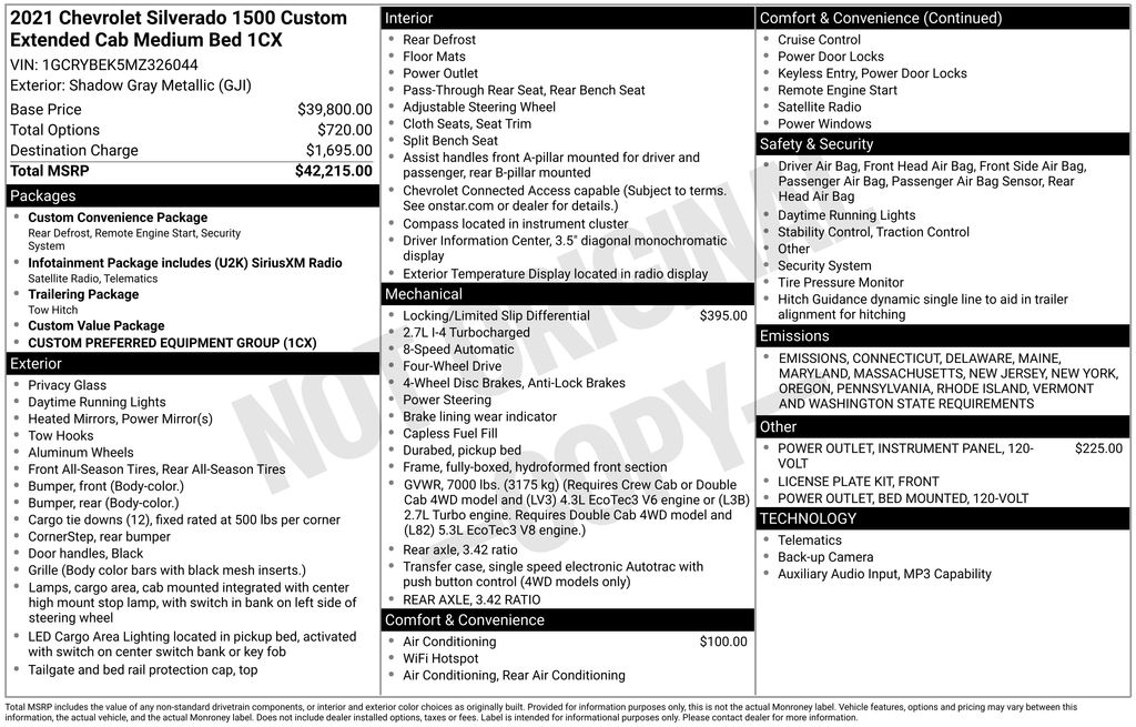 BACKUP CAMERA, BLUETOOTH HANDS FREE, 4X4/FOUR WHEEL DRIVE, BED LINER, LOCAL TRADE IN, RUNNING BOARDS, TOW PACKAGE, CRUISE CONTROL, NON SMOKER, Silverado 1500 Custom 4X4, 4D Extended Cab, 2.7L Turbo, 8-Speed Automatic, 4WD, Shadow Gray Metallic, Black Cloth, ABS brakes, Electronic Stability Control, Fully automatic headlights, Low tire pressure warning, Remote Vehicle Starter System, Theft Deterrent System (Unauthorized Entry), 120-Volt Bed Mounted Power Outlet, 120-Volt Instrument Panel Power Outlet, 170 Amp Alternator, 3.42 Rear Axle Ratio, 3.5" Diagonal Monochromatic Display, 4-Wheel Disc Brakes, 40/20/40 Front Split Bench Seat, 4G LTE Wi-Fi Hot Spot Capable, 6 Speakers, Air Conditioning, Alloy wheels, AM/FM radio: SiriusXM, Apple CarPlay/Android Auto, Auto-Locking Rear Differential, Bluetooth® For Phone, Body Color Grille, Brake assist, Bumpers: body-color, Chevrolet Connected Access Capable, Cloth Seat Trim, Color-Keyed Carpeting Floor Covering, Compass, Custom Convenience Package, Custom Value Package, Deep-Tinted Glass, Delay-off headlights, Driver door bin, Driver vanity mirror, Dual front impact airbags, Dual front side impact airbags, Electric Rear-Window Defogger, Electronic Cruise Control, EZ Lift Power Lock & Release Tailgate, Front anti-roll bar, Front Center Armrest w/Storage, Front Frame-Mounted Black Recovery Hooks, Front License Plate Kit, Front reading lights, Front Rubberized Vinyl Floor Mats, Front wheel independent suspension, Heated door mirrors, Heavy Duty Suspension, Hitch Guidance, Illuminated entry, Infotainment Package, LED Cargo Area Lighting, Manual Tilt Wheel Steering Column, Occupant sensing airbag, OnStar & Chevrolet Connected Services Capable, Outside temperature display, Overhead airbag, Overhead console, Panic alarm, Passenger door bin, Passenger vanity mirror, Polished Exhaust Tip, Power Door Locks, Power door mirrors, Power Front Windows w/Driver Express Up/Down, Power Front Windows w/Passenger Express Down, Power Rear Windows w/Express Down, Power steering, Power windows, Preferred Equipment Group 1CX, Premium audio system: Chevrolet Infotainment 3, Radio data system, Radio: Chevrolet Infotainment 3 System, Rear 60/40 Folding Bench Seat (Folds Up), Rear reading lights, Rear Rubberized-Vinyl Floor Mats, Rear step bumper, Rear window defroster, Remote Keyless Entry, Remote keyless entry, Security system, Single-Zone Manual/Semi-Automatic Air Conditioning, SiriusXM Radio, Speed control, Speed-sensing steering, Split folding rear seat, Standard Tailgate, Tachometer, Tilt steering wheel, Traction control, Trailering Package, Trip computer, Variably intermittent wipers, Voltmeter, Wheels: 20" x 9" Bright Silver Painted Aluminum, Silverado 1500 Custom 4X4, 4D Extended Cab, 2.7L Turbo, 8-Speed Automatic, 4WD, Shadow Gray Metallic, Black Cloth, ABS brakes, Electronic Stability Control, Fully automatic headlights, Low tire pressure warning, Remote Vehicle Starter System, Theft Deterrent System (Unauthorized Entry).