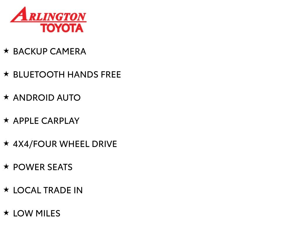Prices do not include tax, tag, title, a pre-delivery service fee* of $894.00, an electronic registration filing fee* of $199.00 (*these charges represent costs and profits to the dealer for items such as inspecting, cleaning, and preparing documents related to the sale), and an Arlington Toyota Total Value Package of $1,889.00 (*these charges represent costs and profits to the dealer for items such as inspecting, cleaning, and preparing documents related to the sale). The final price is also subject to repair order reconditioning costs. Any price does not include dealer-installed accessories. All offers are mutually exclusive. All vehicles are subject to prior sale. See dealer for complete details.